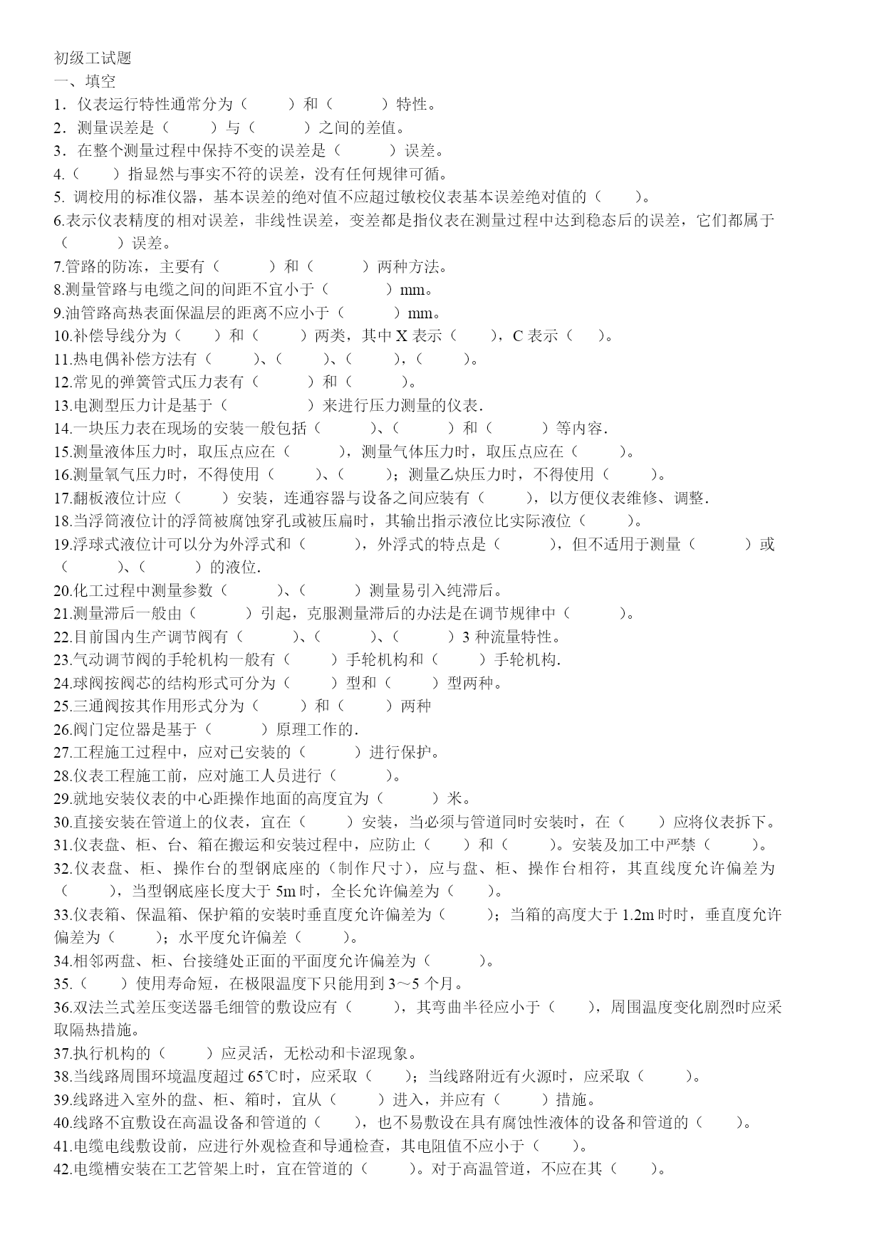 初级工试题一、填空1.仪表运行特性通常分为()和()特性。2.测量误差是()与()之间的差值。3.在整个测量过程中保持不变的误差是()误差。4.()指显然与事实不符的误差,没有任何规律可循。5.调校用的标准仪器,基本误差的绝对值不应超过敏校仪表基本误差绝对值的()。6.表示仪表精度的相对误差,非线性误差,变差都是指仪表在测量过程中达到稳态后的误差,它们都属于()误差。7.管路的防冻,主要有()和()两种方法。8.测量管路与电缆之间的间距不宜小于()mm。9.油管路高热表面保温层的距离不应小于()mm。10