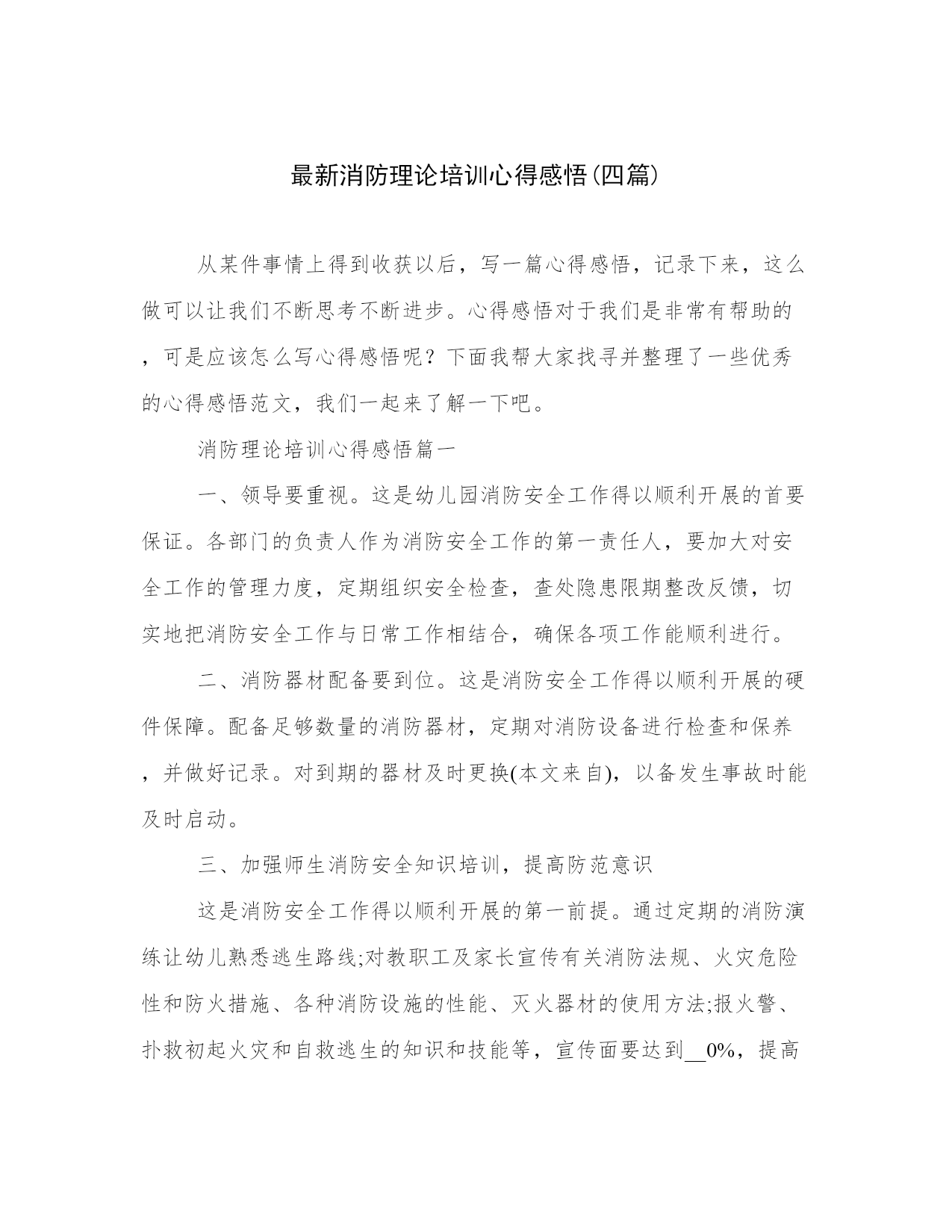 最新消防理论培训心得感悟(四篇)从某件事情上得到收获以后,写一篇心得感悟,记录下来,这么做可以让我们不断思考不断进步。心得感悟对于我们是非常有帮助的,可是应该怎么写心得感悟呢?下面我帮大家找寻并整理了一些优秀的心得感悟范文,我们一起来了解一下吧。消防理论培训心得感悟篇一一、领导要重视。这是幼儿园消防安全工作得以顺利开展的首要保证。各部门的负责人作为消防安全工作的第一责任人,要加大对安全工作的管理力度,定期组织安全检查,查处隐患限期整改反馈,切实地把消防安全工作与日常工作相结合,确保各项工作能顺利进行。二、