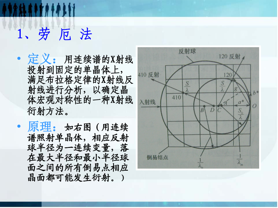 1、劳厄法劳厄法实验:以平板底片接收衍射线,底片可以放置在晶体前面和放置在晶体后面(如下图所示)反射法:小θ角(2θ≤90°)衍射投射法:大θ角(2θ≥90°)衍射在周转晶体法的实验中,常用胶片卷成圆筒接收x射线衍射束。晶体在转动过程中,某一晶面会在转动瞬间满足衍射条件衍射,使底片感光。衍射花样为一系列斑点,其实质为衍射线与底片的交点,分析底片上感光点的分布规律,可给出衍射晶体的结构信息。周转晶体法常用于测定未知晶体结构。3、粉末多晶法多晶粉末中含有大量取向(在外场作用下聚合物中几何形状不对称的单元如分子