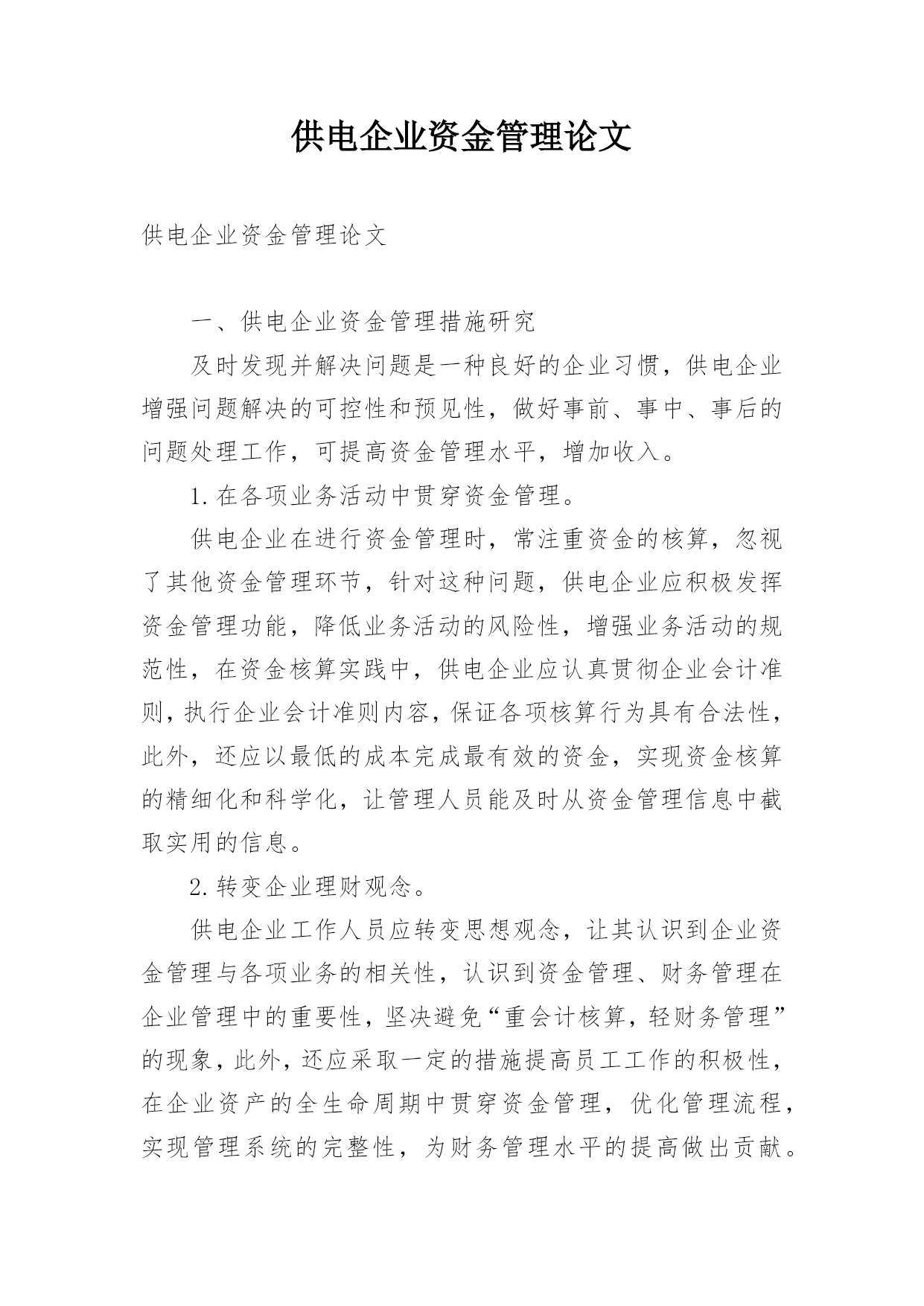供电企业资金管理论文供电企业资金管理论文一、供电企业资金管理措施研究及时发现并解决问题是一种良好的企业习惯,供电企业增强问题解决的可控性和预见性,做好事前、事中、事后的问题处理工作,可提高资金管理水平,增加收入。1.在各项业务活动中贯穿资金管理。供电企业在进行资金管理时,常注重资金的核算,忽视了其他资金管理环节,针对这种问题,供电企业应积极发挥资金管理功能,降低业务活动的风险性,增强业务活动的规范性,在资金核算实践中,供电企业应认真贯彻企业会计准则,执行企业会计准则内容,保证各项核算行为具有合法性,此外,