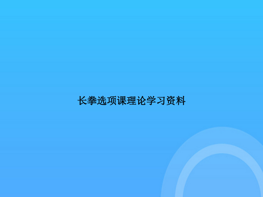 长拳选项课理论学习资料中国武术---长拳(一)“长拳”一词的由来(二)长拳的定义二、长拳基本技术(一)主要手型---三种(二)基本步型---五种(二)步型---五种(三)手法----拳法武术散手在戴拳套练习和比赛时,可模拟似地行抱拳礼,两拳套合抱于胸前即可支撑腿自然伸直,全脚着地。第四段(1)弓步顶肘(2)转身左拍脚(3)右拍脚(4)腾空飞脚高踹与腰平,低踹与膝平。另一腿膝部稍挺直,脚尖勾起前踢,接近前额,动作要轻快有力,上身保持正直。(一)三路长拳全套动作名称这里的“北腿”就是指流行于北方一带的“北派拳