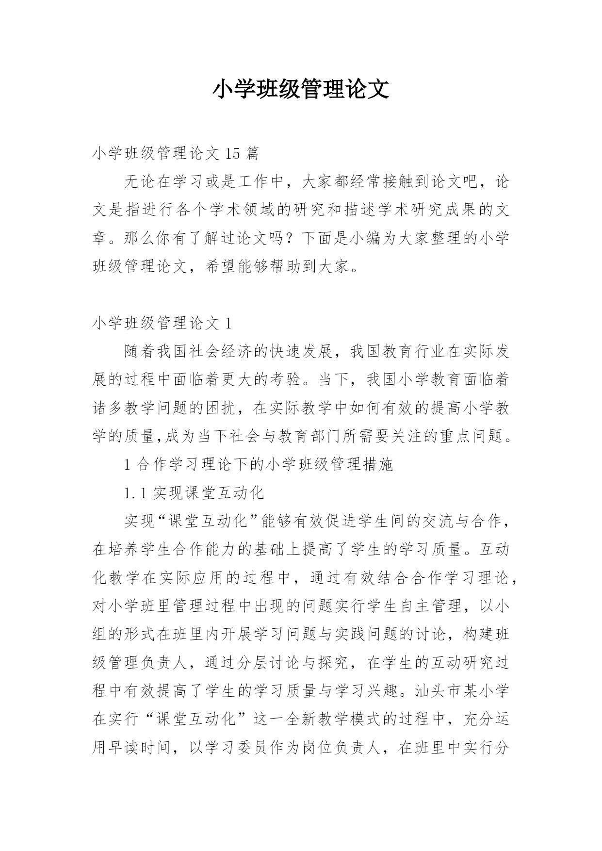 小学班级管理论文小学班级管理论文15篇无论在学习或是工作中,大家都经常接触到论文吧,论文是指进行各个学术领域的研究和描述学术研究成果的文章。那么你有了解过论文吗?下面是小编为大家整理的小学班级管理论文,希望能够帮助到大家。小学班级管理论文1随着我国社会经济的快速发展,我国教育行业在实际发展的过程中面临着更大的考验。当下,我国小学教育面临着诸多教学问题的困扰,在实际教学中如何有效的提高小学教学的质量,成为当下社会与教育部门所需要关注的重点问题。1合作学习理论下的小学班级管理措施1.1实现课堂互动化实现“课堂