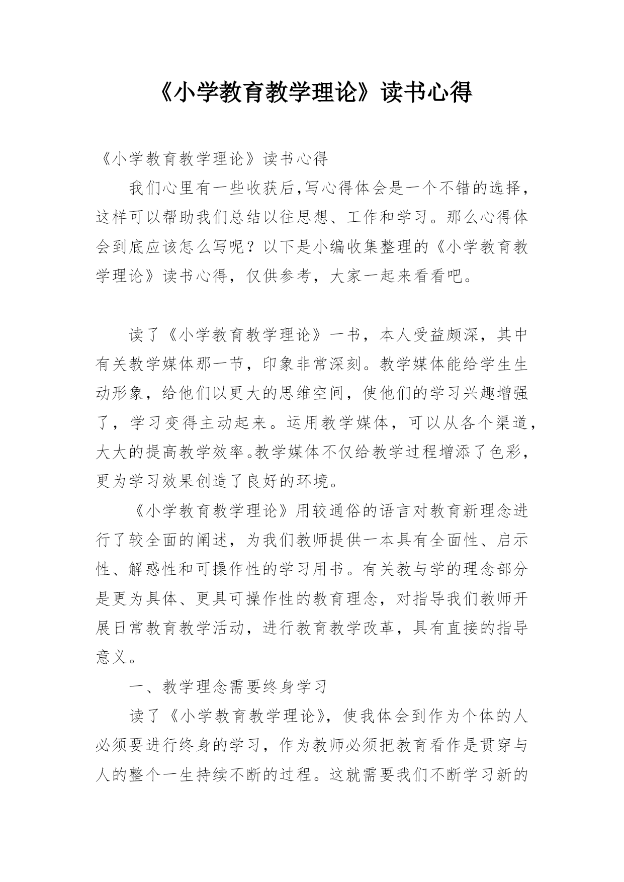 《小学教育教学理论》读书心得《小学教育教学理论》读书心得我们心里有一些收获后,写心得体会是一个不错的选择,这样可以帮助我们总结以往思想、工作和学习。那么心得体会到底应该怎么写呢?以下是小编收集整理的《小学教育教学理论》读书心得,仅供参考,大家一起来看看吧。读了《小学教育教学理论》一书,本人受益颇深,其中有关教学媒体那一节,印象非常深刻。教学媒体能给学生生动形象,给他们以更大的思维空间,使他们的学习兴趣增强了,学习变得主动起来。运用教学媒体,可以从各个渠道,大大的提高教学效率。教学媒体不仅给教学过程增添了色