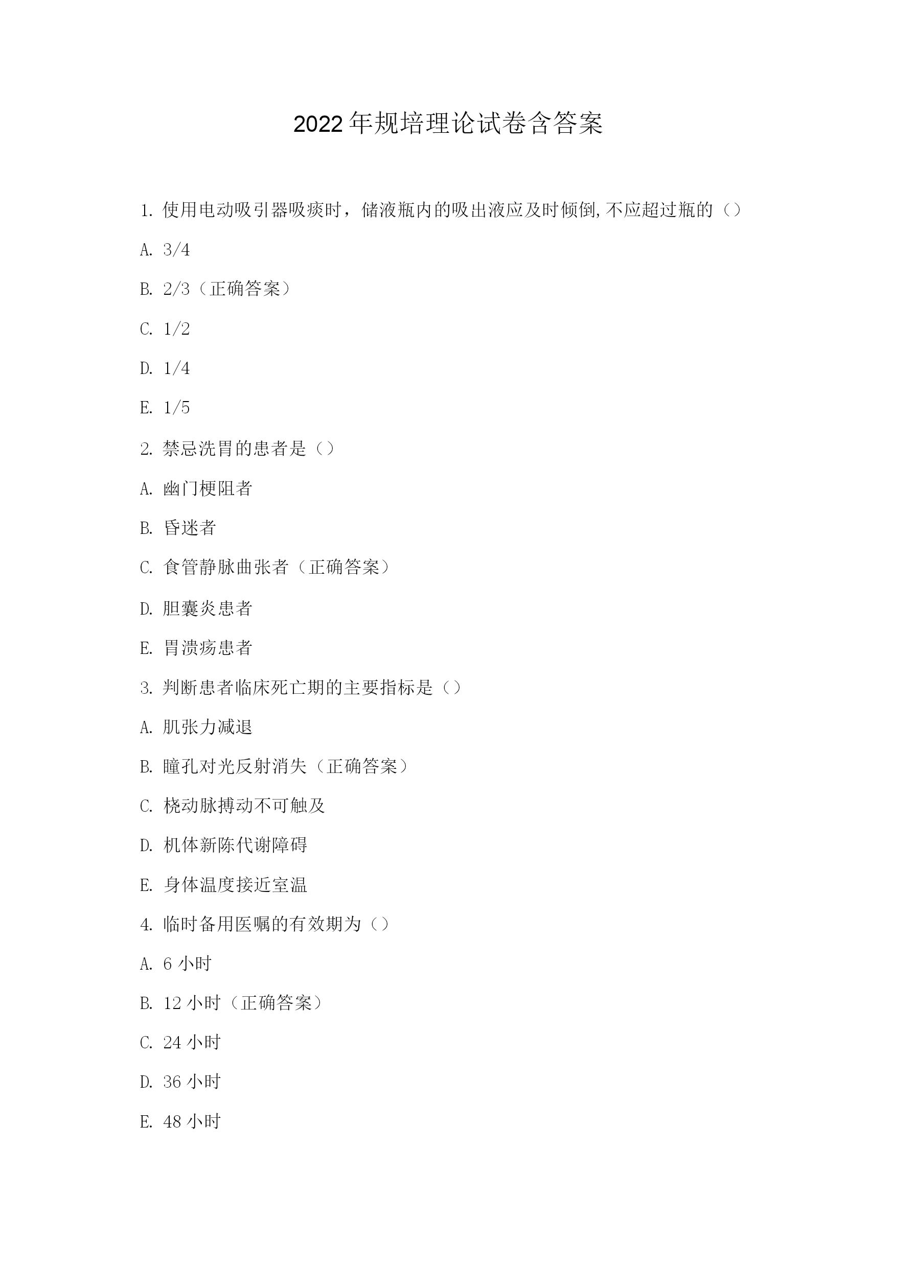 2022年规培理论试卷含答案使用电动吸引器吸痰时,储液瓶内的吸出液应及时倾倒,不应超过瓶的()TOC\o"1-5"\h\z3/42/3(正确答案)1/21/41/5禁忌洗胃的患者是()幽门梗阻者昏迷者食管静脉曲张者(正确答案)胆囊炎患者胃溃疡患者判断患者临床死亡期的主要指标是()肌张力减退瞳孔对光反射消失(正确答案)桡动脉搏动不可触及机体新陈代谢障碍身体温度接近室温临时备用医嘱的有效期为()6小时12小时(正确答案)24小时36小时48小时需要专人负责、加锁保存并列入交班内容的药物是()可待因(正确