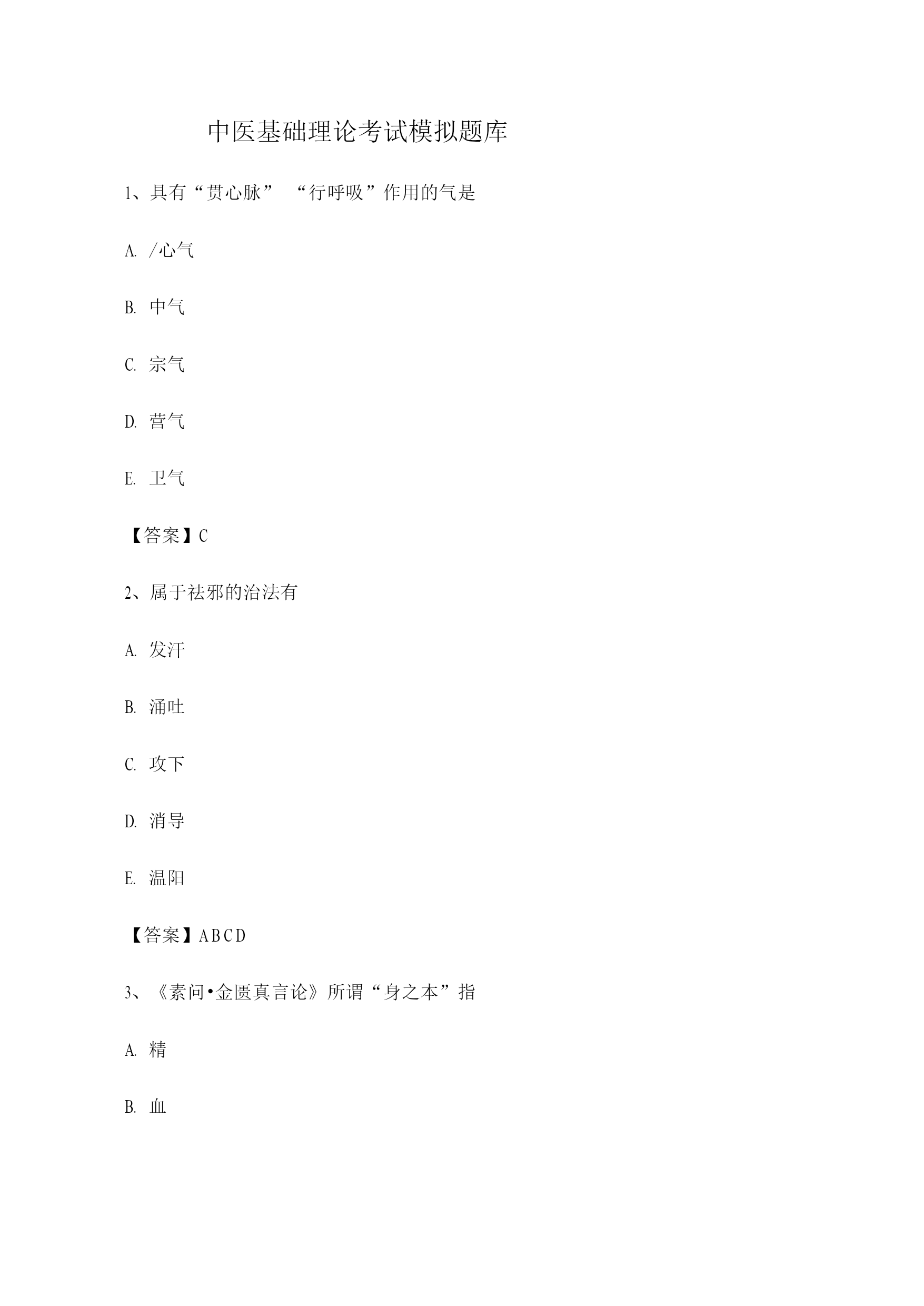 中医基础理论考试模拟题库1、具有“贯心脉”“行呼吸”作用的气是/心气中气宗气营气卫气【答案】C2、属于祛邪的治法有发汗涌吐攻下消导温阳【答案】ABCD3、《素问•金匮真言论》所谓“身之本”指精血津液气.血.津液等气【答案】A4、卫气的生理功能有化生血液温养全身营养全身防御外邪调节媵理【答案】BDE5、与足太阴相表里的经脉是足厥阴足少阳足阳明手太阳手少阳【答案】C6、关于伤津和脱液,说法不正确的是伤津未必脱液脱液未必伤津津乃脱液之渐液脱乃津伤之甚脱液是水分和精微共同丢失【答案】B7、如果阴阳双方失去互为存在