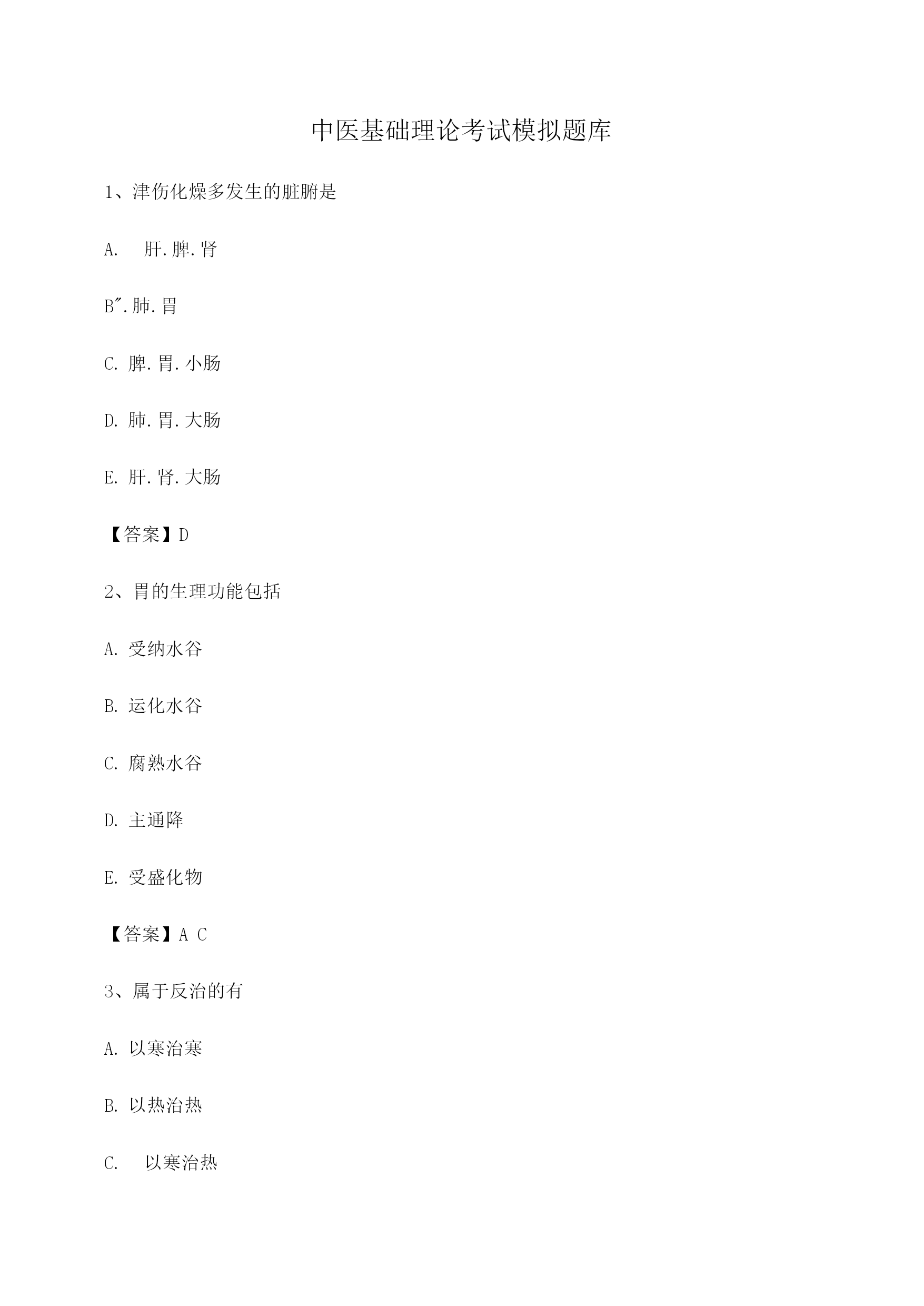 中医基础理论考试模拟题库1、津伤化燥多发生的脏腑是肝.脾.肾B".肺.胃脾.胃.小肠肺.胃.大肠肝.肾.大肠【答案】D2、胃的生理功能包括受纳水谷运化水谷腐熟水谷主通降受盛化物【答案】AC3、属于反治的有以寒治寒以热治热以寒治热以通治通以补开塞【答案】ABDE4、肺与肾的关系有津液代谢血液运行呼吸运动气机调节阴液互资【答案】ACE5、被后人称“滋阴派”的医家代表是朱丹溪叶天士刘完素薛生白吴鞠通【答案】A6、不属于外感病基本传变形式的是病性传变表里传变伤寒六经传变卫气营血传变温病三焦传变【答案】A7、与月经