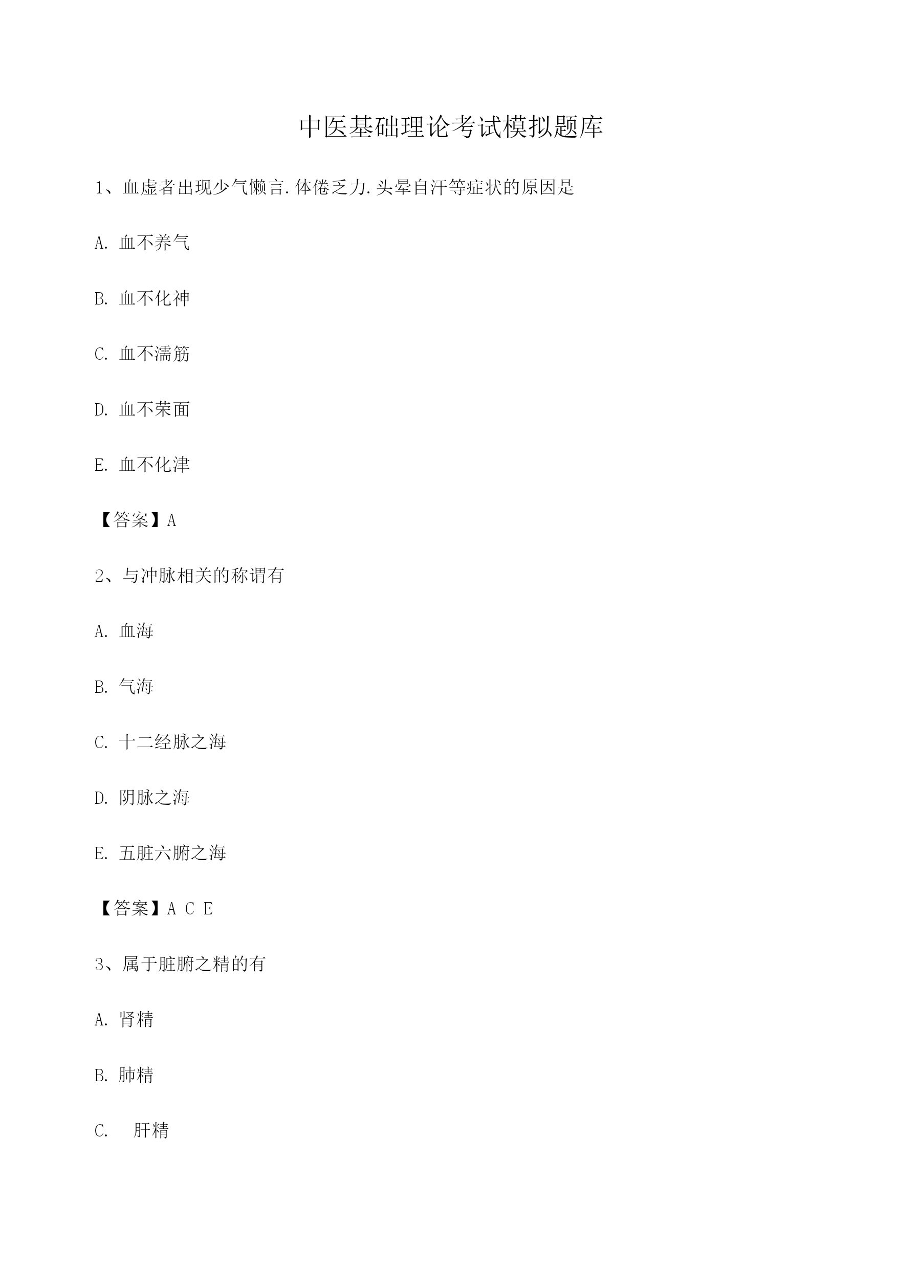中医基础理论考试模拟题库1、血虚者出现少气懒言.体倦乏力.头晕自汗等症状的原因是血不养气血不化神血不濡筋血不荣面血不化津【答案】A2、与冲脉相关的称谓有血海气海十二经脉之海阴脉之海五脏六腑之海【答案】ACE3、属于脏腑之精的有肾精肺精肝精/心精脾精【答案】ABCDE4、某患者突然出现食后脘腹疼痛,呕吐,腹泻,甚至神志不清,高度怀疑其病因是食物中毒饮食不节寒热偏嗜五味偏嗜暴饮暴食【答案】A5、《内经》概括上.中.下三焦功能特点包括上焦如雾中焦如沤上焦如羽下焦如渎下焦如权【答案】ABD6、循行于下肢外侧中线的