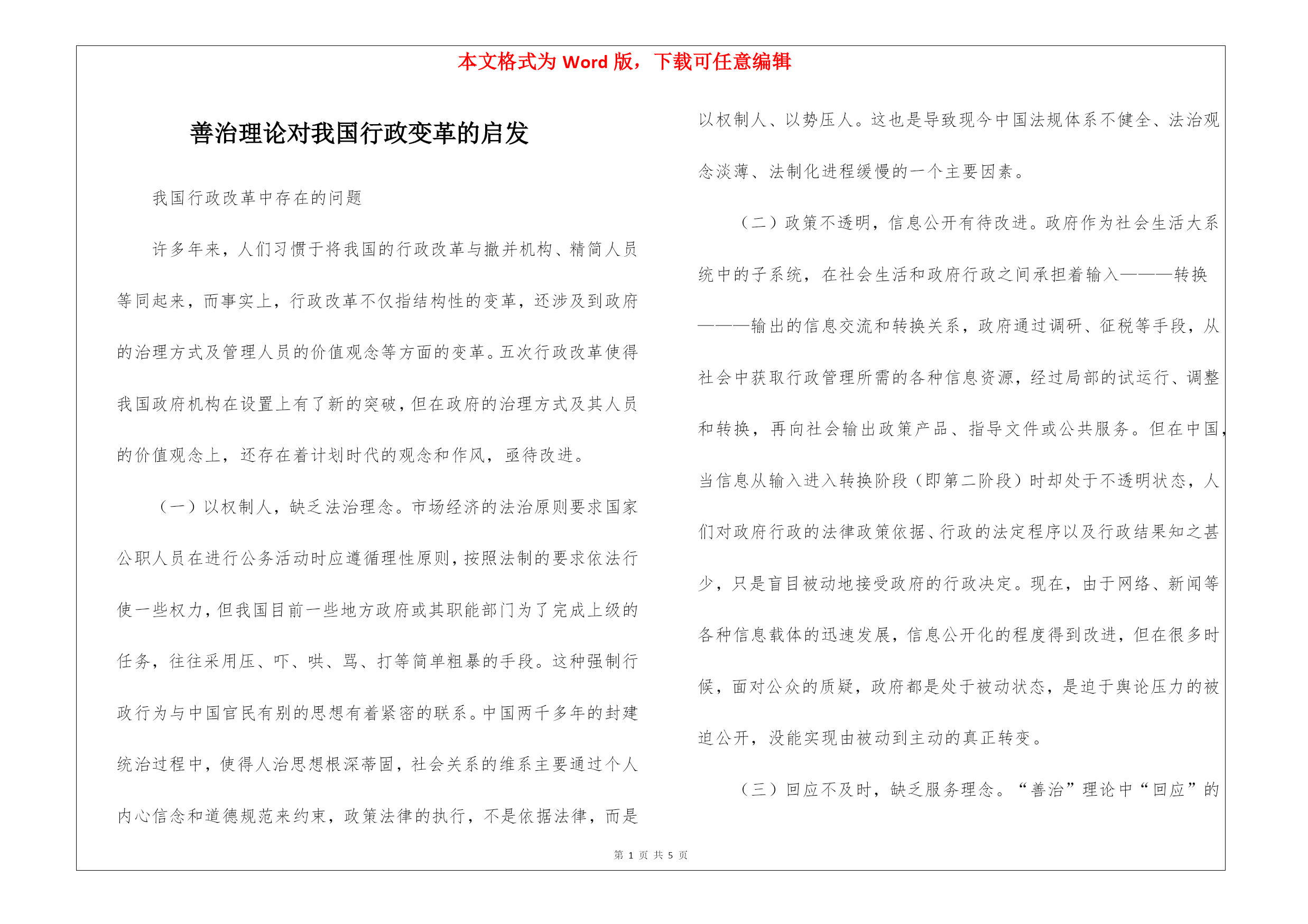 本文格式为Word版,下载可任意编辑第PAGE\*MERGEFORMAT5页共NUMPAGES\*MERGEFORMAT5页善治理论对我国行政变革的启发我国行政改革中存在的问题许多年来,人们习惯于将我国的行政改革与撤并机构、精简人员等同起来,而事实上,行政改革不仅指结构性的变革,还涉及到政府的治理方式及管理人员的价值观念等方面的变革。五次行政改革使得我国政府机构在设置上有了新的突破,但在政府的治理方式及其人员的价值观念上,还存在着计划时代的观念和作风,亟待改进。(一)以权制人,缺乏法治理念。市