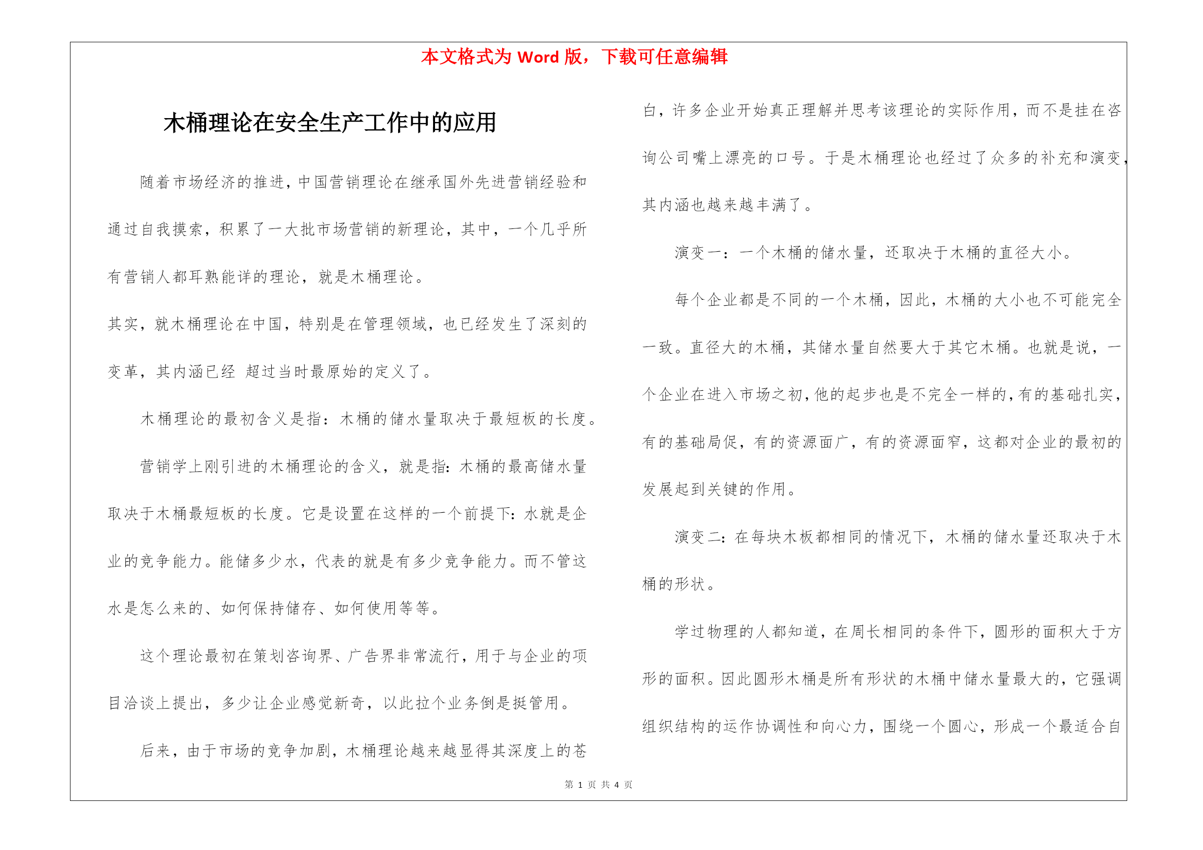 本文格式为Word版,下载可任意编辑第PAGE\*MERGEFORMAT4页共NUMPAGES\*MERGEFORMAT4页木桶理论在安全生产工作中的应用随着市场经济的推进,中国营销理论在继承国外先进营销经验和通过自我摸索,积累了一大批市场营销的新理论,其中,一个几乎所有营销人都耳熟能详的理论,就是木桶理论。其实,就木桶理论在中国,特别是在管理领域,也已经发生了深刻的变革,其内涵已经超过当时最原始的定义了。木桶理论的最初含义是指:木桶的储水量取决于最短板的长度。营销学上刚引进的木桶理论的含义,