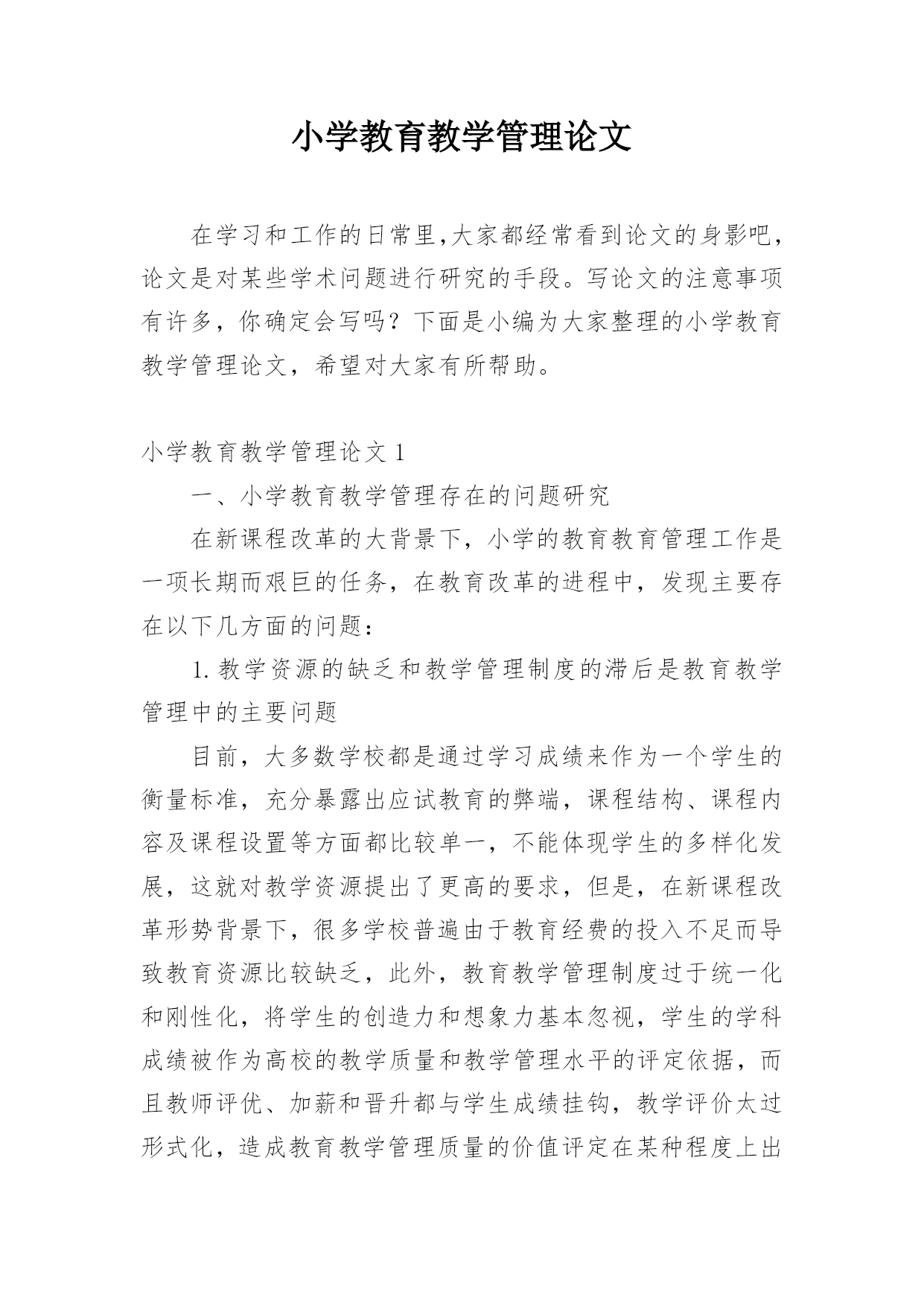 小学教育教学管理论文在学习和工作的日常里,大家都经常看到论文的身影吧,论文是对某些学术问题进行研究的手段。写论文的注意事项有许多,你确定会写吗?下面是小编为大家整理的小学教育教学管理论文,希望对大家有所帮助。小学教育教学管理论文1一、小学教育教学管理存在的问题研究在新课程改革的大背景下,小学的教育教育管理工作是一项长期而艰巨的任务,在教育改革的进程中,发现主要存在以下几方面的问题:1.教学资源的缺乏和教学管理制度的滞后是教育教学管理中的主要问题目前,大多数学校都是通过学习成绩来作为一个学生的衡量标准,充分