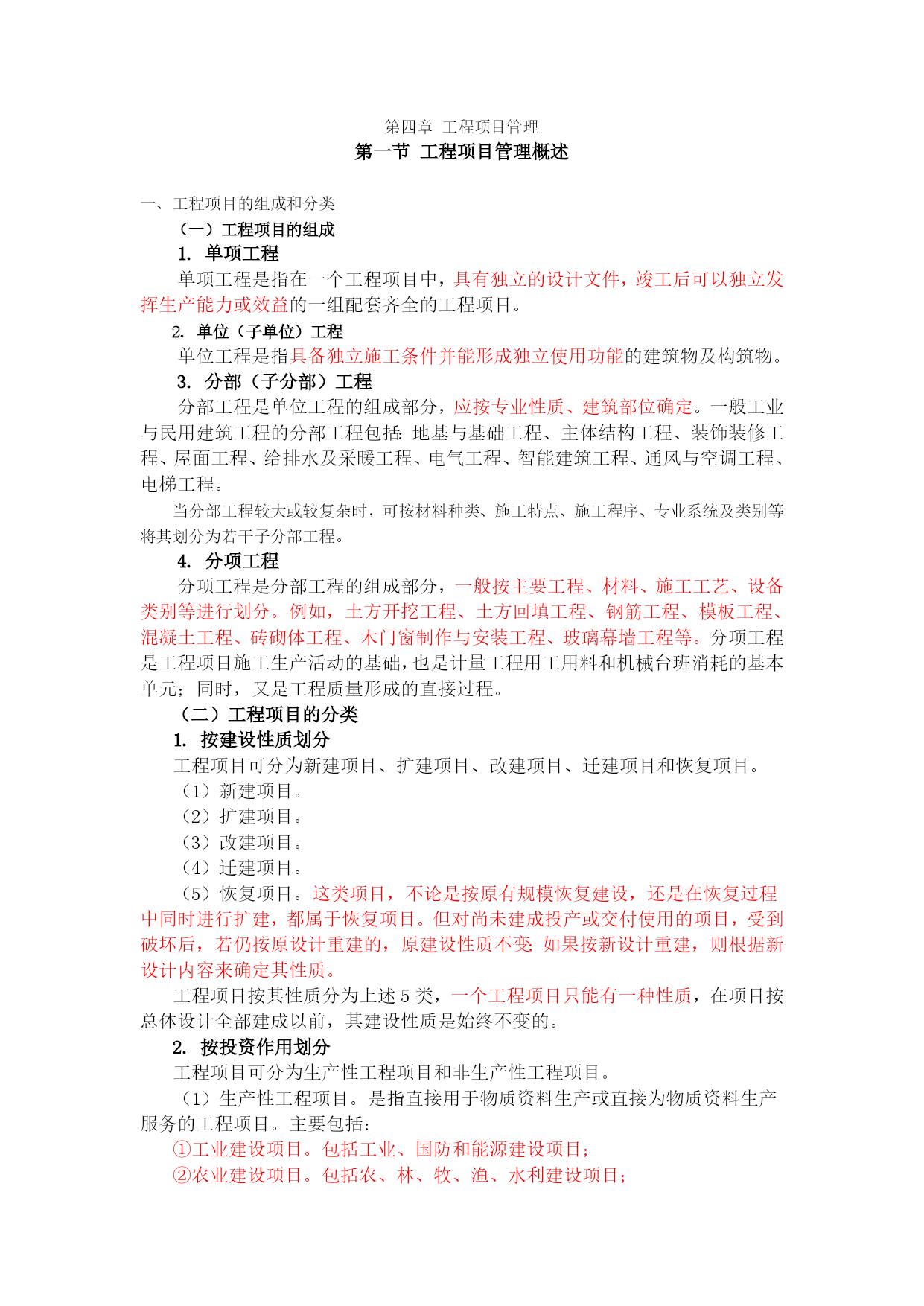 第四章工程项目管理第一节工程项目管理概述一、工程项目的组成和分类(一)工程项目的组成1.单项工程单项工程是指在一个工程项目中,具有独立的设计文件,竣工后可以独立发挥生产能力或效益的一组配套齐全的工程项目。2.单位(子单位)工程单位工程是指具备独立施工条件并能形成独立使用功能的建筑物及构筑物。3.分部(子分部)工程分部工程是单位工程的组成部分,应按专业性质、建筑部位确定。一般工业与民用建筑工程的分部工程包括:地基与基础工程、主体结构工程、装饰装修工程、屋面工程、给排水及采暖工程、电气工程、智能建筑工程、通风
