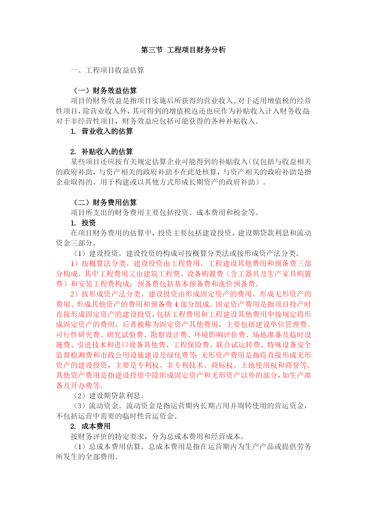 第三节工程项目财务分析一、工程项目收益估算(一)财务效益估算项目的财务效益是指项目实施后所获得的营业收入。对于适用增值税的经营性项目,除营业收入外,其可得到的增值税返还也应作为补贴收入计入财务收益;对于非经营性项目,财务效益应包括可能获得的各种补贴收入。1.营业收入的估算2.补贴收入的估算某些项目还应按有关规定估算企业可能得到的补贴收入(仅包括与收益相关的政府补助,与资产相关的政府补助不在此处核算,与资产相关的政府补助是指企业取得的、用于构建或以其他方式形成长期资产的政府补助)。(二)财务费用估算项目所支