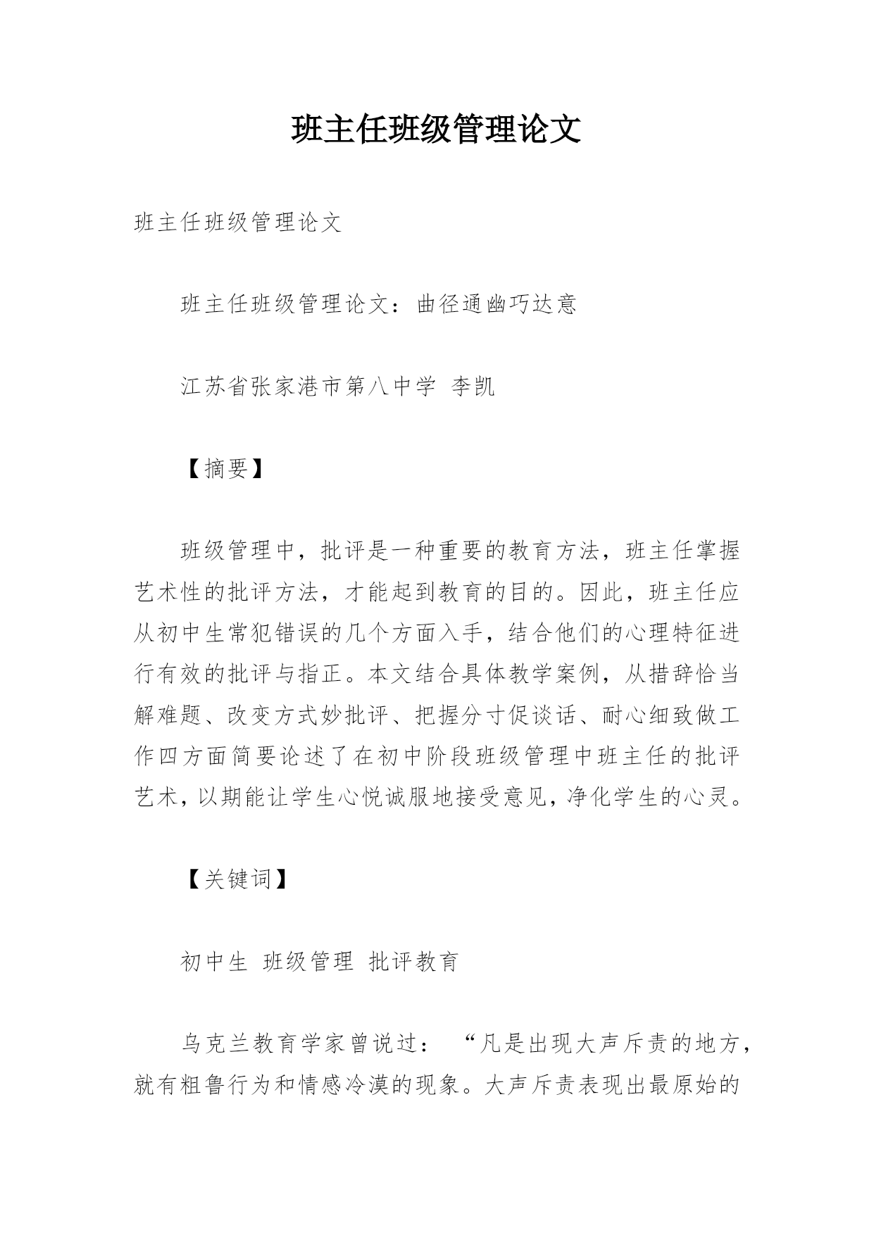 班主任班级管理论文班主任班级管理论文班主任班级管理论文:曲径通幽巧达意江苏省张家港市第八中学李凯【摘要】班级管理中,批评是一种重要的教育方法,班主任掌握艺术性的批评方法,才能起到教育的目的。因此,班主任应从初中生常犯错误的几个方面入手,结合他们的心理特征进行有效的批评与指正。本文结合具体教学案例,从措辞恰当解难题、改变方式妙批评、把握分寸促谈话、耐心细致做工作四方面简要论述了在初中阶段班级管理中班主任的批评艺术,以期能让学生心悦诚服地接受意见,净化学生的心灵。【关键词】初中生班级管理批评教育乌克兰教育学家