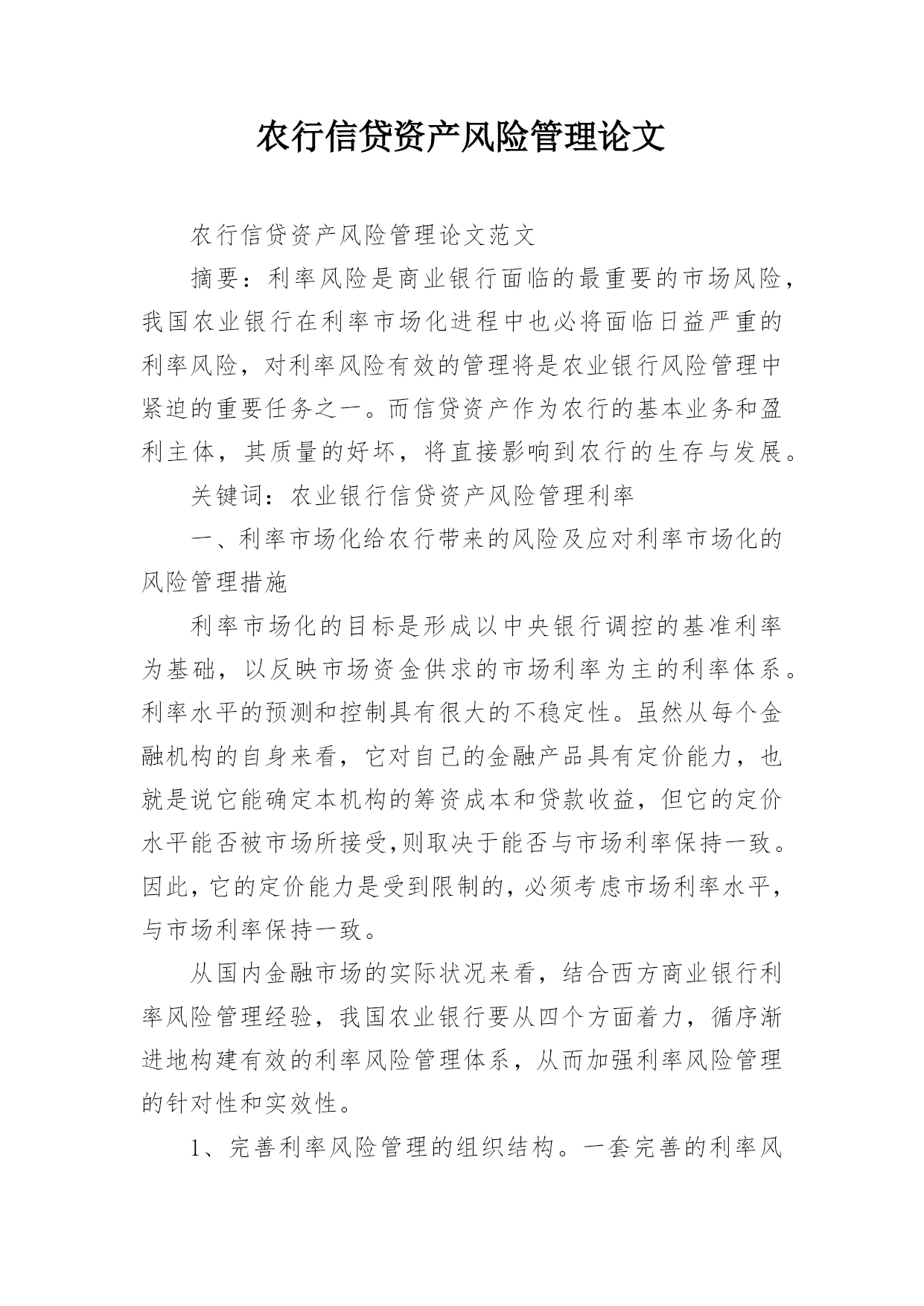 农行信贷资产风险管理论文农行信贷资产风险管理论文范文摘要:利率风险是商业银行面临的最重要的市场风险,我国农业银行在利率市场化进程中也必将面临日益严重的利率风险,对利率风险有效的管理将是农业银行风险管理中紧迫的重要任务之一。而信贷资产作为农行的基本业务和盈利主体,其质量的好坏,将直接影响到农行的生存与发展。关键词:农业银行信贷资产风险管理利率一、利率市场化给农行带来的风险及应对利率市场化的风险管理措施利率市场化的目标是形成以中央银行调控的基准利率为基础,以反映市场资金供求的市场利率为主的利率体系。利率水平的
