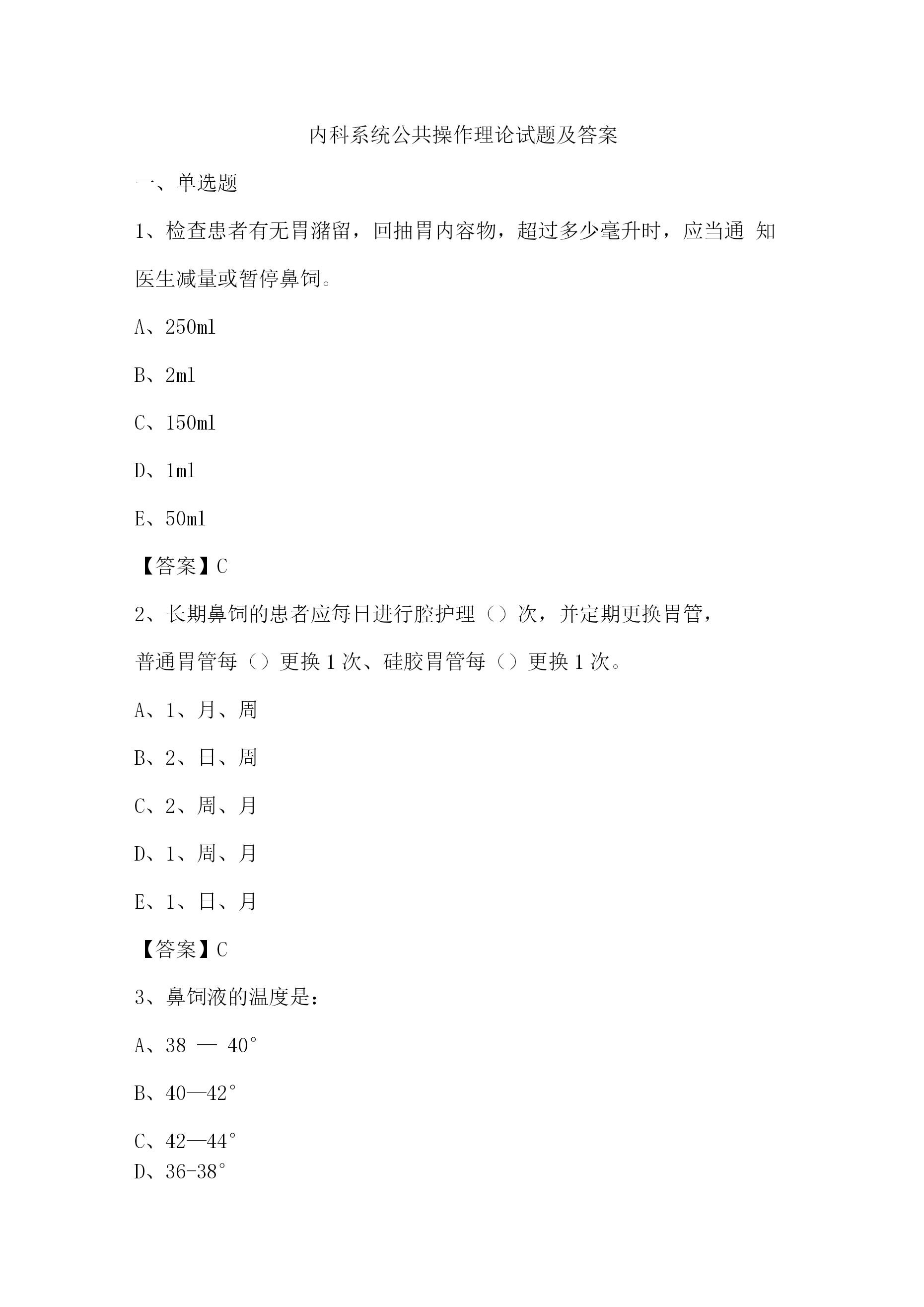 内科系统公共操作理论试题及答案一、单选题1、检查患者有无胃潴留,回抽胃内容物,超过多少毫升时,应当通知医生减量或暂停鼻饲。TOC\o"1-5"\h\zA、250mlB、2mlC、150mlD、1mlE、50ml【答案】C2、长期鼻饲的患者应每日进行腔护理()次,并定期更换胃管,普通胃管每()更换1次、硅胶胃管每()更换1次。A、1、月、周B、2、日、周C、2、周、月D、1、周、月E、1、日、月【答案】C3、鼻饲液的温度是:A、38—40°B、40—42°C、42—44°D、36-38°E、33-35