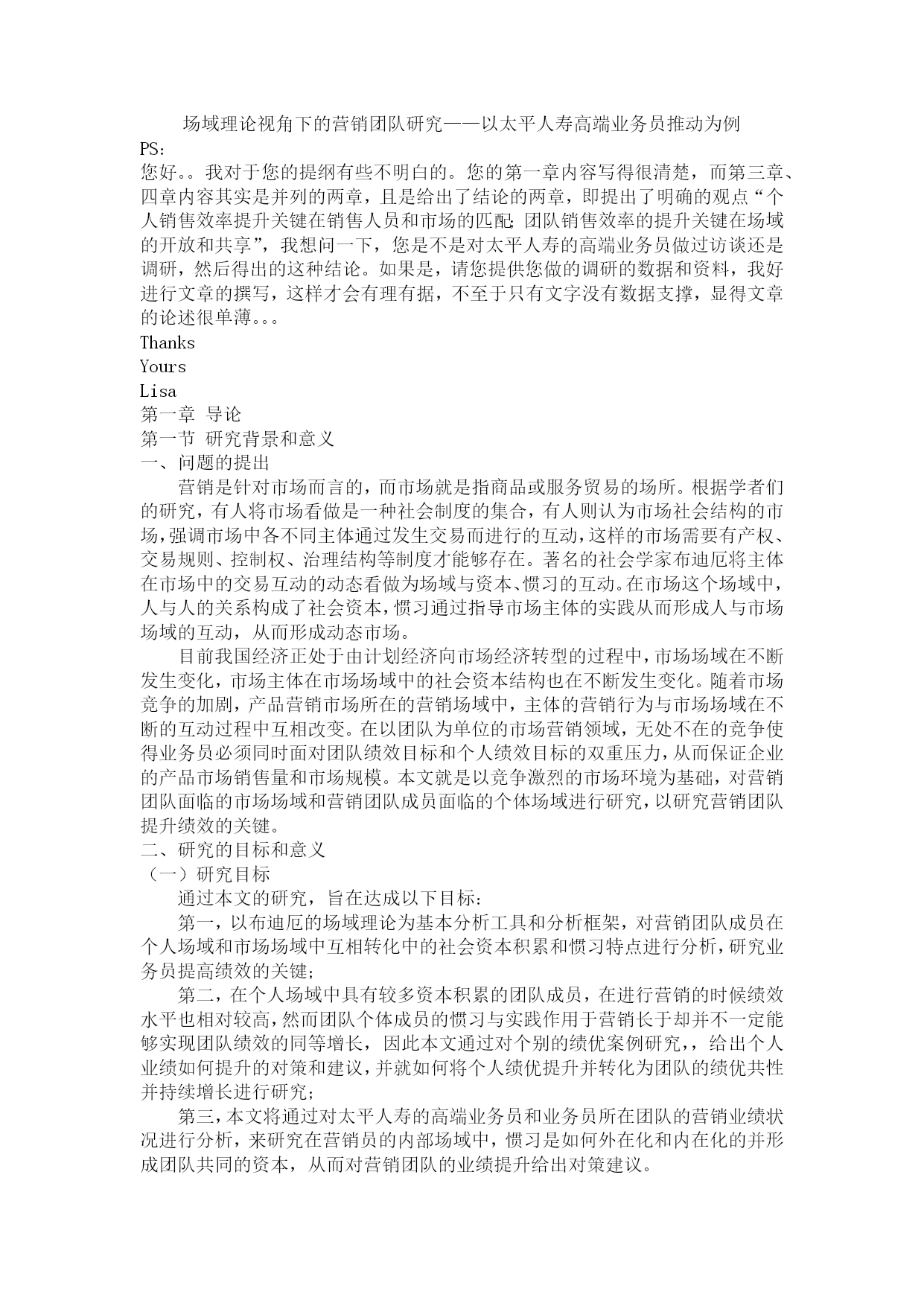 场域理论视角下的营销团队研究——以太平人寿高端业务员推动为例PS:您好。。我对于您的提纲有些不明白的。您的第一章内容写得很清楚,而第三章、四章内容其实是并列的两章,且是给出了结论的两章,即提出了明确的观点“个人销售效率提升关键在销售人员和市场的匹配;团队销售效率的提升关键在场域的开放和共享”,我想问一下,您是不是对太平人寿的高端业务员做过访谈还是调研,然后得出的这种结论。如果是,请您提供您做的调研的数据和资料,我好进行文章的撰写,这样才会有理有据,不至于只有文字没有数据支撑,显得文章的论述很单薄。。。Th