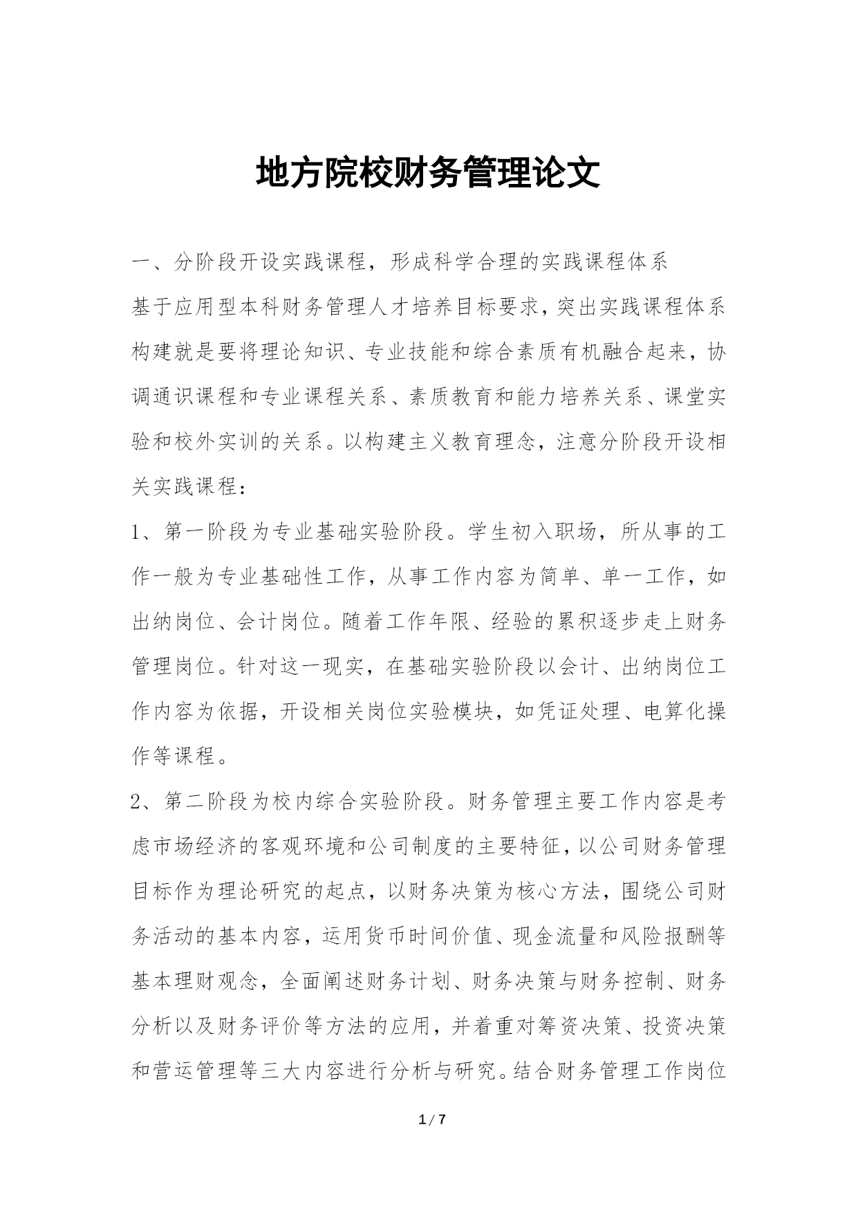 PAGE7/NUMPAGES7地方院校财务管理论文一、分阶段开设实践课程,形成科学合理的实践课程体系基于应用型本科财务管理人才培养目标要求,突出实践课程体系构建就是要将理论知识、专业技能和综合素质有机融合起来,协调通识课程和专业课程关系、素质教育和能力培养关系、课堂实验和校外实训的关系。以构建主义教育理念,注意分阶段开设相关实践课程:1、第一阶段为专业基础实验阶段。学生初入职场,所从事的工作一般为专业基础性工作,从事工作内容为简单、单一工作,如出纳岗位、会计岗位。随着工作年限、经验的累积逐步走