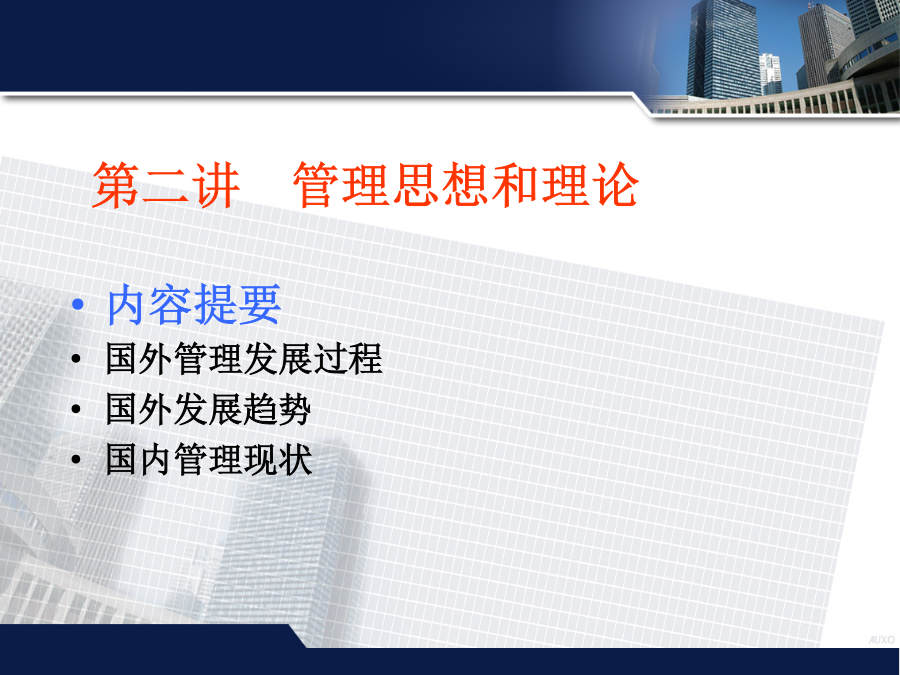 管理学Management第二章第二章管理理论的发展学习目标主要内容第一节中外早期管理思想对中外早期管理思想的学习,有利于我们了解管理学的起源及其发展历程。讲授与训练一、中国古代的管理智慧①儒家的管理智慧(续)儒家的管理智慧儒家的管理智慧儒家的管理智慧2、道家的管理智慧3、法家的管理智慧⑾法家的管理智慧介绍了中外古代的管理思想即管理学的起源。思考与训练第二节管理理论的形成与发展古典理论是古典的,然而也是现代的,古典管理的精华永存。联合邮包服务公司的科学管理【案例思考】管理理论的形成与发展古典管理理论古典管
