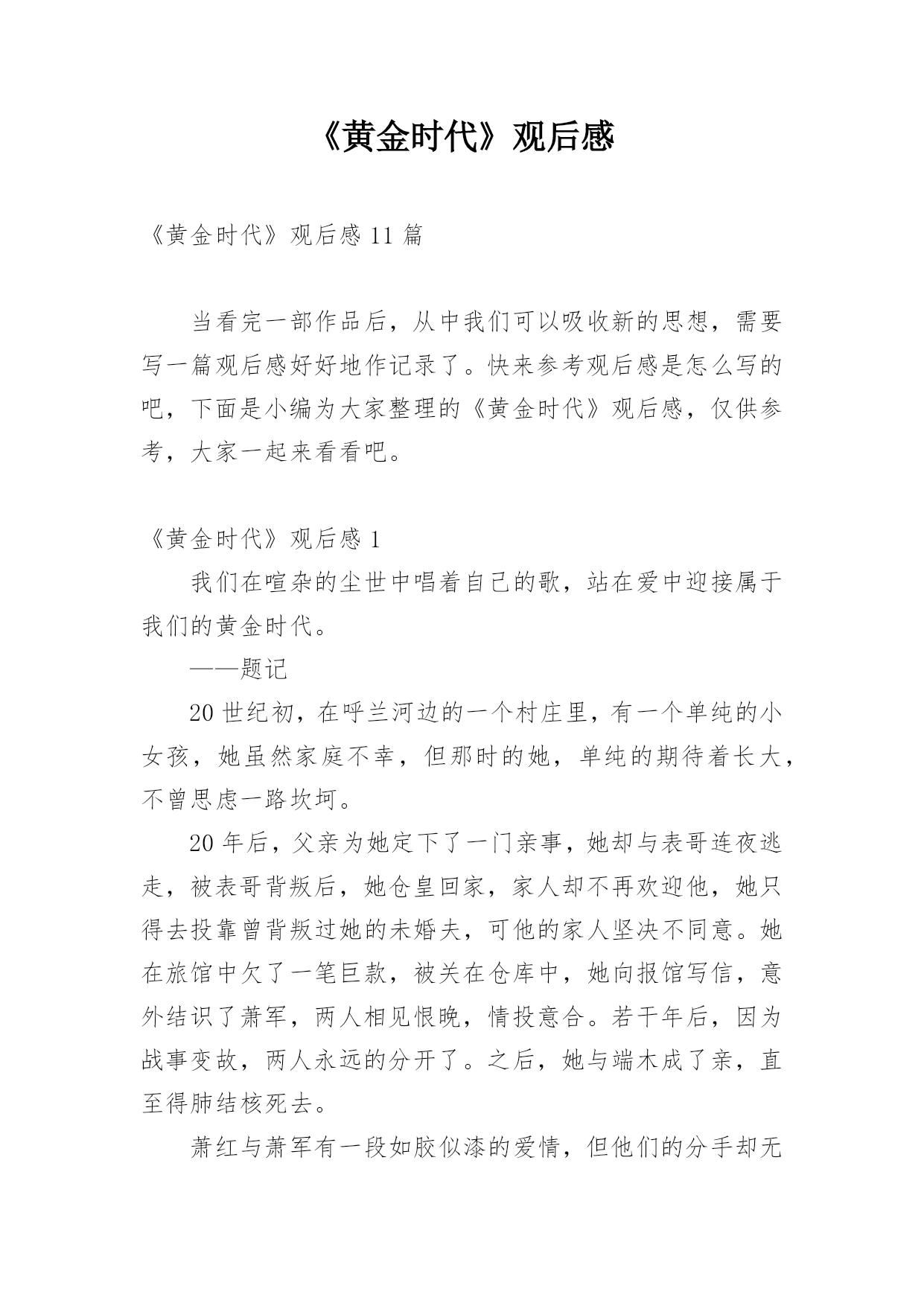 《黄金时代》观后感《黄金时代》观后感11篇当看完一部作品后,从中我们可以吸收新的思想,需要写一篇观后感好好地作记录了。快来参考观后感是怎么写的吧,下面是小编为大家整理的《黄金时代》观后感,仅供参考,大家一起来看看吧。《黄金时代》观后感1我们在喧杂的尘世中唱着自己的歌,站在爱中迎接属于我们的黄金时代。——题记20世纪初,在呼兰河边的一个村庄里,有一个单纯的小女孩,她虽然家庭不幸,但那时的她,单纯的期待着长大,不曾思虑一路坎坷。20年后,父亲为她定下了一门亲事,她却与表哥连夜逃走,被表哥背叛后,她仓皇回家,家