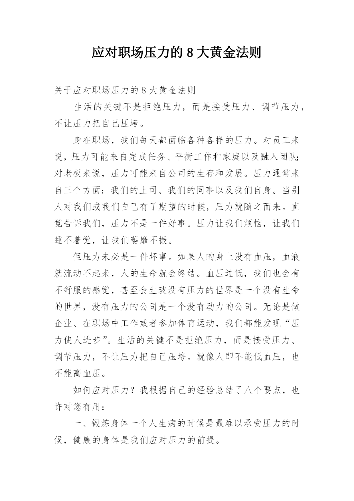 应对职场压力的8大黄金法则关于应对职场压力的8大黄金法则生活的关键不是拒绝压力,而是接受压力、调节压力,不让压力把自己压垮。身在职场,我们每天都面临各种各样的压力。对员工来说,压力可能来自完成任务、平衡工作和家庭以及融入团队;对老板来说,压力可能来自公司的生存和发展。压力通常来自三个方面:我们的上司、我们的同事以及我们自身。当别人对我们或我们自己有了期望的时候,压力就随之而来。直觉告诉我们,压力不是一件好事。压力让我们烦恼,让我们睡不着觉,让我们萎靡不振。但压力未必是一件坏事。如果人的身上没有血压,血液就