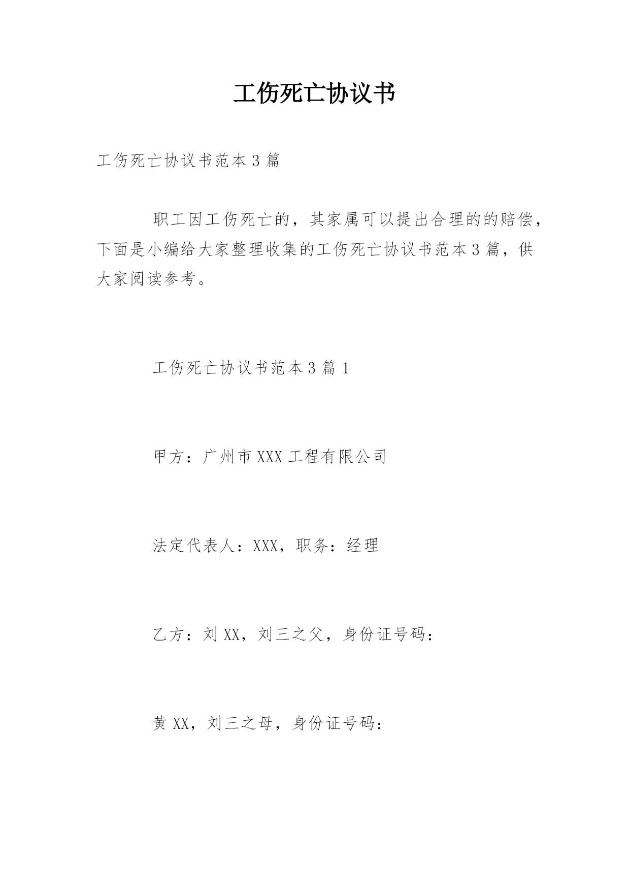 工伤死亡协议书工伤死亡协议书范本3篇职工因工伤死亡的,其家属可以提出合理的的赔偿,下面是小编给大家整理收集的工伤死亡协议书范本3篇,供大家阅读参考。工伤死亡协议书范本3篇1甲方:广州市XXX工程有限公司法定代表人:XXX,职务:经理乙方:刘XX,刘三之父,身份证号码:黄XX,刘三之母,身份证号码:乙方之子刘三系甲方单位的工人,因工作原因于20xx年8月7日发生工伤事故,经抢救无效于20xx年8月7日死亡。刘三,男,19岁,身份证号码:410721XXX2173015,供养亲属及直系亲属身份情况:父亲:刘X
