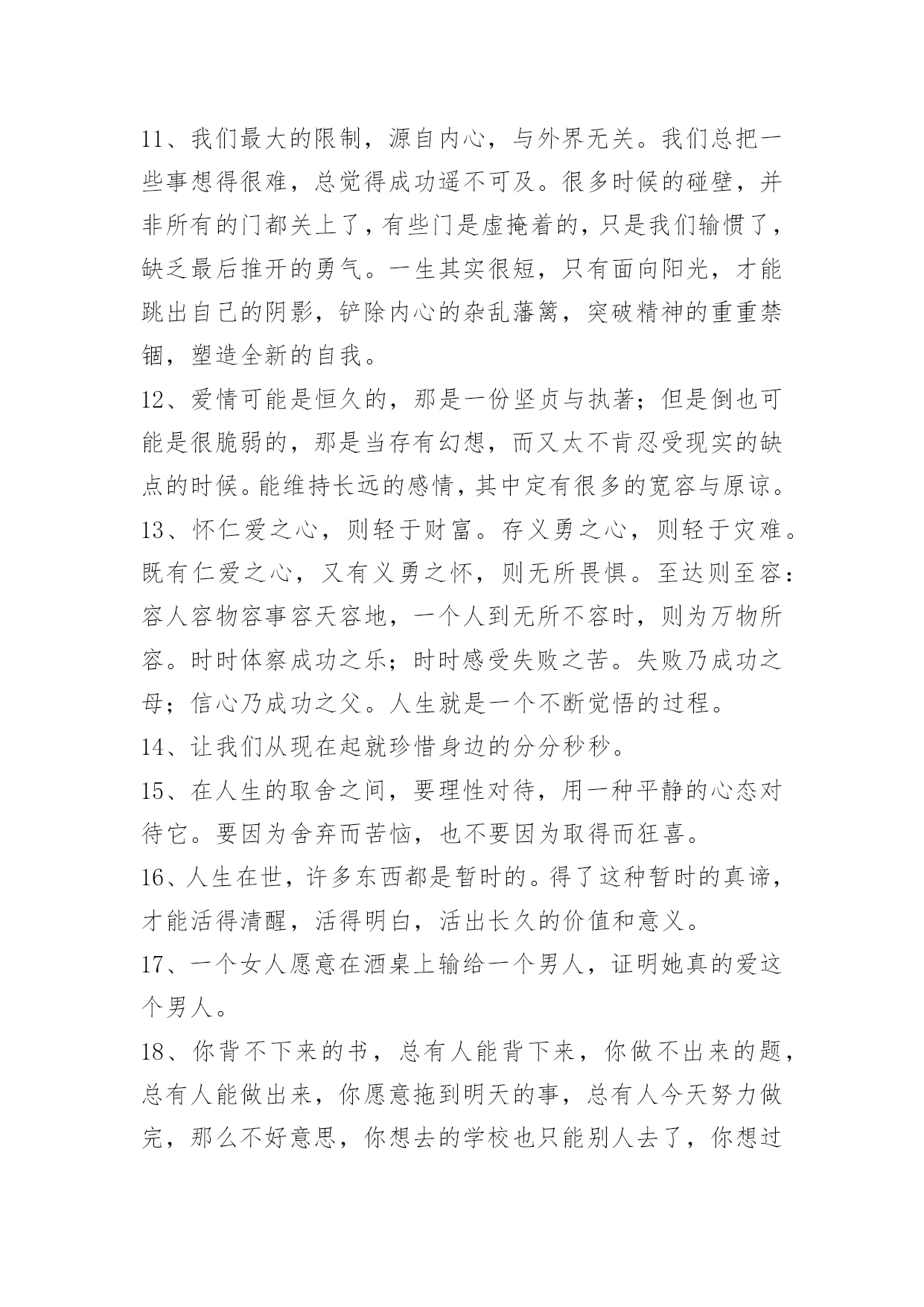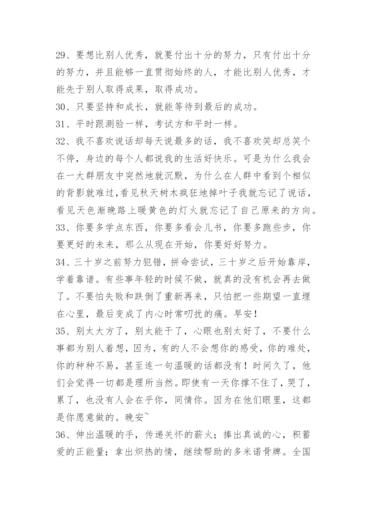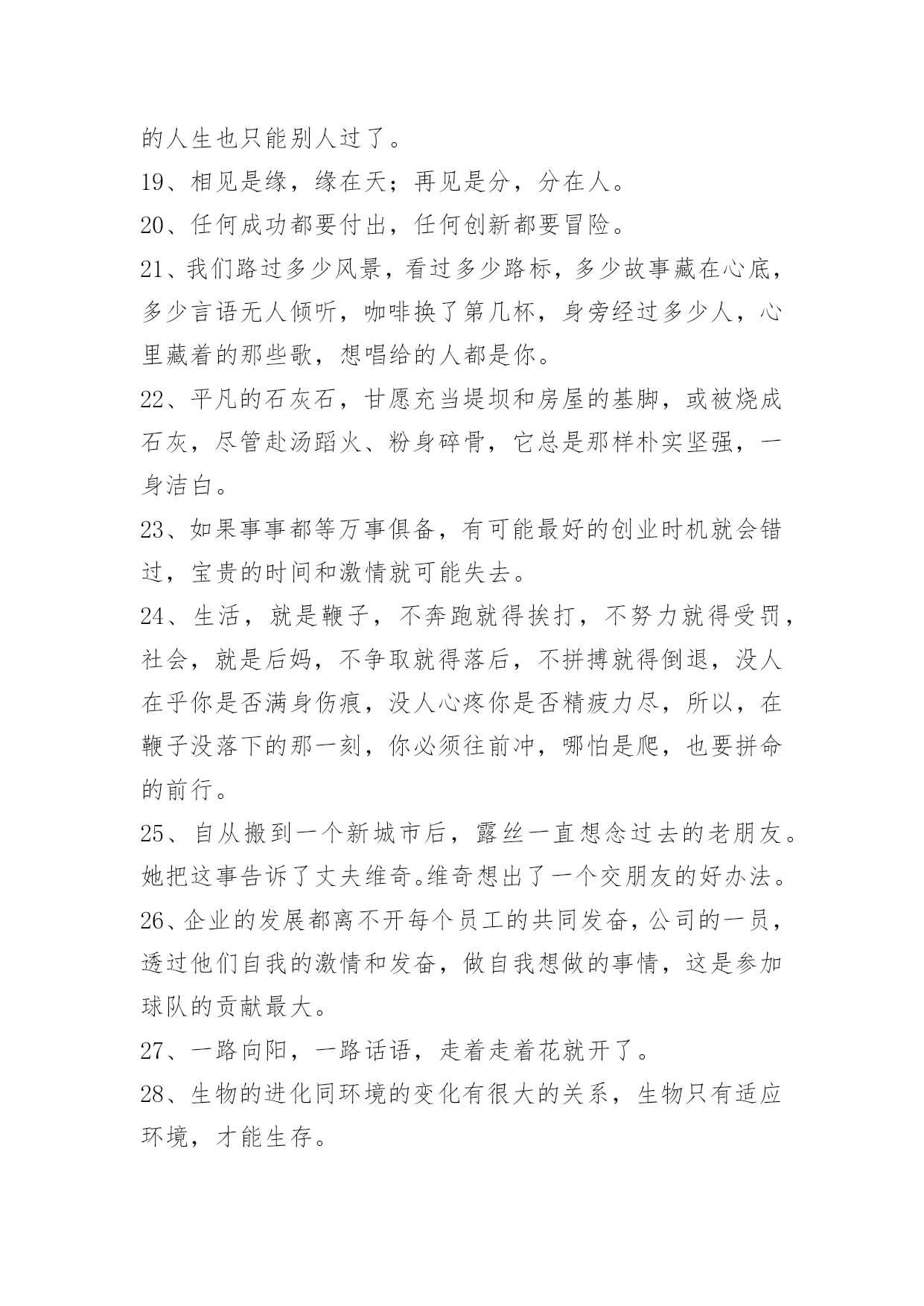 工作励志语录64条【必备】工作励志语录汇总64条上进心其实是个特别可怕的东西,它开始很容易,结束却很难,因为我们不知道上进心的尽头在那里,因为我们会害怕,害怕没有了上进心我们会怎么样。以下是小编为大家整理推荐的工作励志语录64条,欢迎阅读,希望大家能够喜欢。1、所有的成功,都来自于不倦的努力与奔跑;所有幸福,都来自平凡的奋斗与坚持,你无法找到捷径。2、需要自问的事情包括,第一,你是否可以允许自己的个性被有限度的减损?婚姻从来不是加法,它是一种融合,这决定了在很多事情上,认可这个人际关系的人必须做出妥协。任何一种成功相处的人际关系都是妥协的结果,婚姻也绝不例外。3、人生漫漫只有奋斗的人才会知道人生的价值。虽然人与人之间有差距,但成功不是属于个别人的。4、人与人之间本来只有很少的差异,但这很小的差异却往往造成了巨大的差异,巨大的差异当然决定了成功、幸福,还是平庸、不幸,而原本很小的差异就是凡事所采取的心理暗示不同。所以说,两种不同的心理暗示必然会产生两种不同的结果。5、如果成功有诀窍的话,这个诀窍就在于洞悉他人的立场,并能够同时兼顾自己与他人的立场。6、这个世界,总有你不喜欢的人,也总有人不喜欢你。这都很正常。而且,无论你有多好,无论对方有多好,都苛求彼此不得。因为,好不好是一回事,喜欢不喜欢是另一回事。刻意去讨人喜欢,折损的,只能是自我的尊严。不要用无数次的折腰,去换得一个漠然的低眉。在辽阔的生命里,总会有一朵祥云为你缭绕。7、潇洒的风度和幽雅的谈吐是与生俱来的,或者从摇篮时期就开始教育培养出来的。8、人生如果一直保持着淡如君子的情怀去面对所有人,保持着初见时的那份朦胧。避免了许多交往中有过的误会、猜测和费解。就像面对网友一样,未谋一面,对对方永远都不了解,俩个人之间对彼此都是个迷,一直都保持着君子之间的情怀,不用担心背叛、失去和消逝,不曾拥有过的东西,也永远不懂伤感、怀念。9、一个没有信心、没有希望的女人,就算她长得不难看,也绝不会有那种令人心动的吸引力。这就正如在女人眼中,只要是成功的男人,就一定不会是丑陋的。只有事业的成功,才是男人最好的装饰品。10、在漫长的人生之路上,有梦想,有成功,有失败,成功时不沾沾自喜;失败时,不垂头丧气。战胜自己就能实现梦想,成功之路上,最大的敌人就是你自己。年轻人,无论在什么情况下,都保持清醒的理智和顽强的.毅力,只有这样才能从失败中走出,战胜自己,战胜困难,达到人生的顶峰。11、我们最大的限制,源自内心,与外界无关。我们总把一些事想得很难,总觉得成功遥不可及。很多时候的碰壁,并非所有的门都关上了,有些门是虚掩着的,只是我们输惯了,缺乏最后推开的勇气。一生其实很短,只有面向阳光,才能跳出自己的阴影,铲除内心的杂乱藩篱,突破精神的重重禁锢,塑造全新的自我。12、爱情可能是恒久的,那是一份坚贞与执著;但是倒也可能是很脆弱的,那是当存有幻想,而又太不肯忍受现实的缺点的时候。能维持长远的感情,其中定有很多的宽容与原谅。13、怀仁爱之心,则轻于财富。存义勇之心,则轻于灾难。既有仁爱之心,又有义勇之怀,则无所畏惧。至达则至容:容人容物容事容天容地,一个人到无所不容时,则为万物所容。时时体察成功之乐;时时感受失败之苦。失败乃成功之母;信心乃成功之父。人生就是一个不断觉悟的过程。14、让我们从现在起就珍惜身边的分分秒秒。15、在人生的取舍之间,要理性对待,用一种平静的心态对待它。要因为舍弃而苦恼,也不要因为取得而狂喜。16、人生在世,许多东西都是暂时的。得了这种暂时的真谛,才能活得清醒,活得明白,活出长久的价值和意义。17、一个女人愿意在酒桌上输给一个男人,证明她真的爱这个男人。18、你背不下来的书,总有人能背下来,你做不出来的题,总有人能做出来,你愿意拖到明天的事,总有人今天努力做完,那么不好意思,你想去的学校也只能别人去了,你想过的人生也只能别人过了。19、相见是缘,缘在天;再见是分,分在人。20、任何成功都要付出,任何创新都要冒险。21、我们路过多少风景,看过多少路标,多少故事藏在心底,多少言语无人倾听,咖啡换了第几杯,身旁经过多少人,心里藏着的那些歌,想唱给的人都是你。22、平凡的石灰石,甘愿充当堤坝和房屋的基脚,或被烧成石灰,尽管赴汤蹈火、粉身碎骨,它总是那样朴实坚强,一身洁白。23、如果事事都等万事俱备,有可能最好的创业时机就会错过,宝贵的时间和激情就可能失去。24、生活,就是鞭子,不奔跑就得挨打,不努力就得受罚,社会,就是后妈,不争取就得落后,不拼搏就得倒退,没人在乎你是否满身伤痕,没人心疼你是否精疲力尽,所以,在鞭子没落下的那一刻,你必须往前冲,哪怕是爬,也要拼命的前行。25、自从搬到一个新城市后,露丝一直想念过去的老朋友。她把这事告诉了丈夫维奇。维奇想出了一个交朋友的好办法。26、企业的