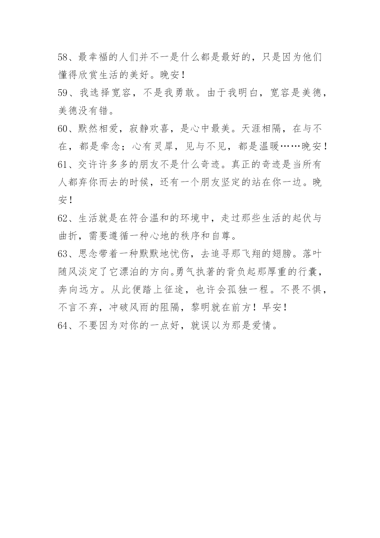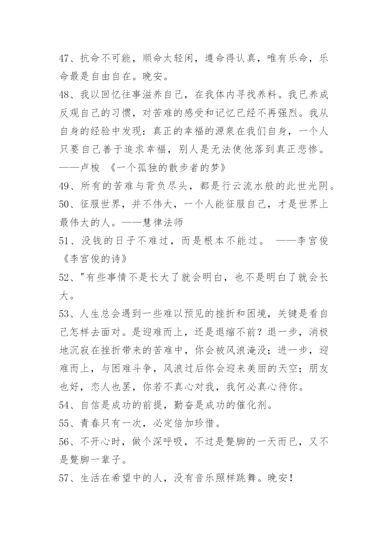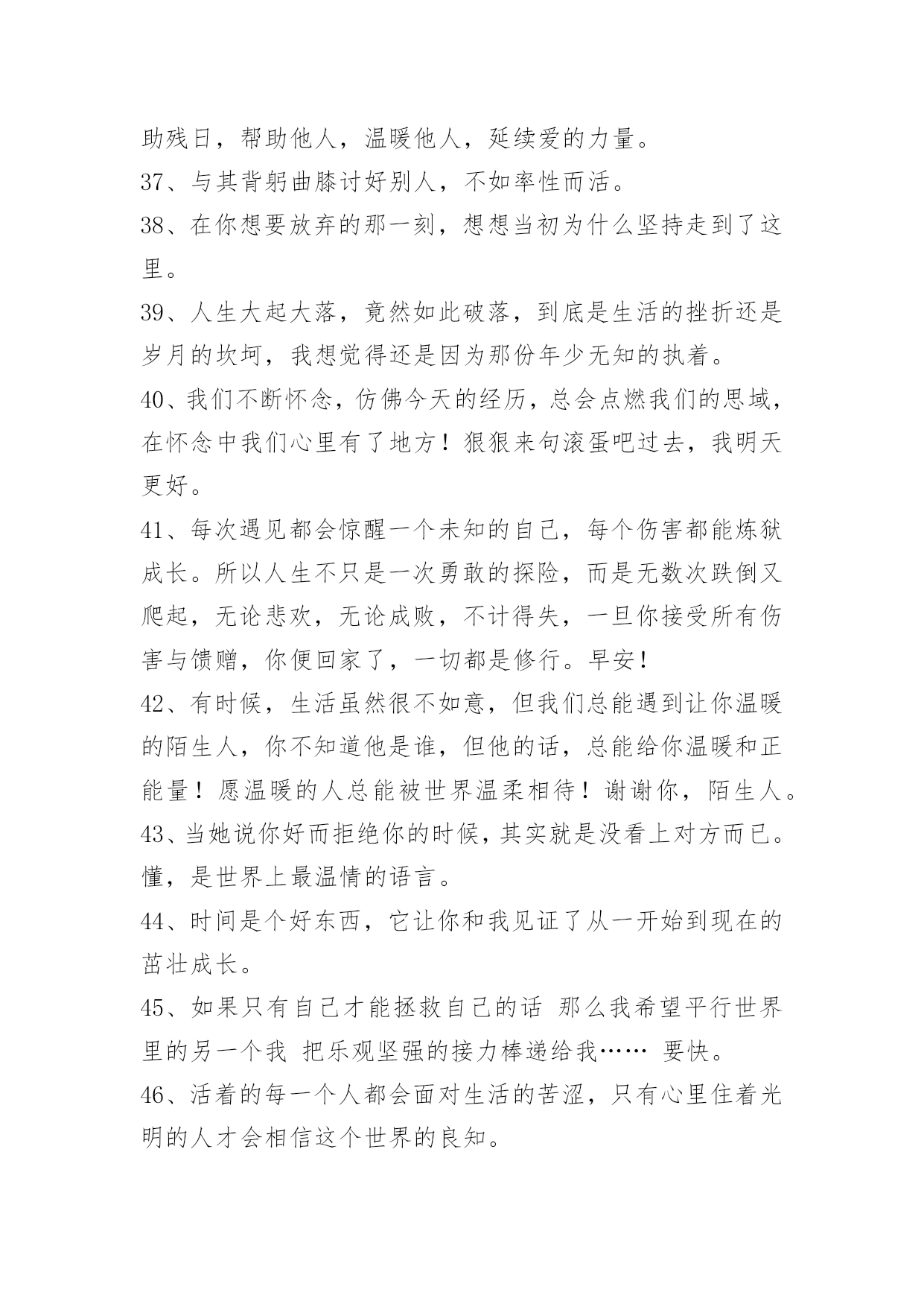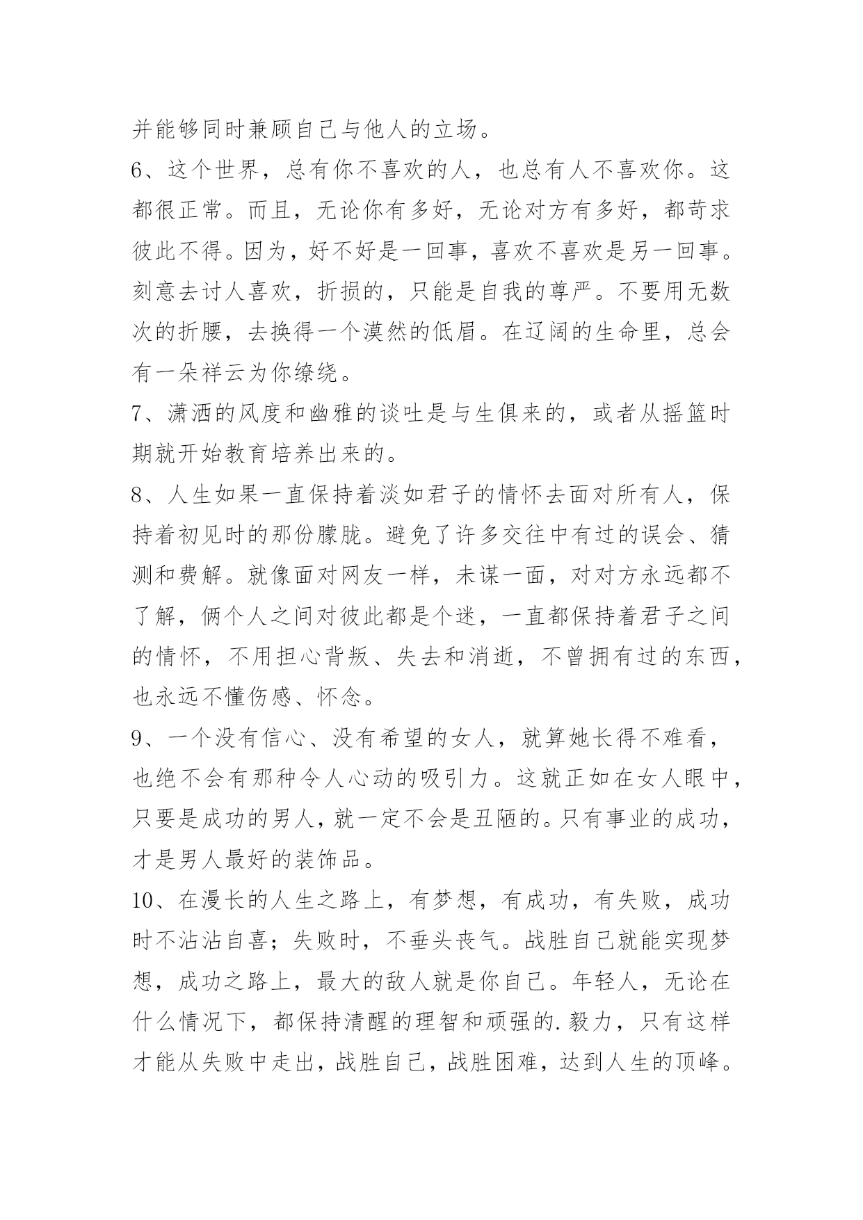 工作励志语录64条【必备】工作励志语录汇总64条上进心其实是个特别可怕的东西,它开始很容易,结束却很难,因为我们不知道上进心的尽头在那里,因为我们会害怕,害怕没有了上进心我们会怎么样。以下是小编为大家整理推荐的工作励志语录64条,欢迎阅读,希望大家能够喜欢。1、所有的成功,都来自于不倦的努力与奔跑;所有幸福,都来自平凡的奋斗与坚持,你无法找到捷径。2、需要自问的事情包括,第一,你是否可以允许自己的个性被有限度的减损?婚姻从来不是加法,它是一种融合,这决定了在很多事情上,认可这个人际关系的人必须做出妥协。任何一种成功相处的人际关系都是妥协的结果,婚姻也绝不例外。3、人生漫漫只有奋斗的人才会知道人生的价值。虽然人与人之间有差距,但成功不是属于个别人的。4、人与人之间本来只有很少的差异,但这很小的差异却往往造成了巨大的差异,巨大的差异当然决定了成功、幸福,还是平庸、不幸,而原本很小的差异就是凡事所采取的心理暗示不同。所以说,两种不同的心理暗示必然会产生两种不同的结果。5、如果成功有诀窍的话,这个诀窍就在于洞悉他人的立场,并能够同时兼顾自己与他人的立场。6、这个世界,总有你不喜欢的人,也总有人不喜欢你。这都很正常。而且,无论你有多好,无论对方有多好,都苛求彼此不得。因为,好不好是一回事,喜欢不喜欢是另一回事。刻意去讨人喜欢,折损的,只能是自我的尊严。不要用无数次的折腰,去换得一个漠然的低眉。在辽阔的生命里,总会有一朵祥云为你缭绕。7、潇洒的风度和幽雅的谈吐是与生俱来的,或者从摇篮时期就开始教育培养出来的。8、人生如果一直保持着淡如君子的情怀去面对所有人,保持着初见时的那份朦胧。避免了许多交往中有过的误会、猜测和费解。就像面对网友一样,未谋一面,对对方永远都不了解,俩个人之间对彼此都是个迷,一直都保持着君子之间的情怀,不用担心背叛、失去和消逝,不曾拥有过的东西,也永远不懂伤感、怀念。9、一个没有信心、没有希望的女人,就算她长得不难看,也绝不会有那种令人心动的吸引力。这就正如在女人眼中,只要是成功的男人,就一定不会是丑陋的。只有事业的成功,才是男人最好的装饰品。10、在漫长的人生之路上,有梦想,有成功,有失败,成功时不沾沾自喜;失败时,不垂头丧气。战胜自己就能实现梦想,成功之路上,最大的敌人就是你自己。年轻人,无论在什么情况下,都保持清醒的理智和顽强的.毅力,只有这样才能从失败中走出,战胜自己,战胜困难,达到人生的顶峰。11、我们最大的限制,源自内心,与外界无关。我们总把一些事想得很难,总觉得成功遥不可及。很多时候的碰壁,并非所有的门都关上了,有些门是虚掩着的,只是我们输惯了,缺乏最后推开的勇气。一生其实很短,只有面向阳光,才能跳出自己的阴影,铲除内心的杂乱藩篱,突破精神的重重禁锢,塑造全新的自我。12、爱情可能是恒久的,那是一份坚贞与执著;但是倒也可能是很脆弱的,那是当存有幻想,而又太不肯忍受现实的缺点的时候。能维持长远的感情,其中定有很多的宽容与原谅。13、怀仁爱之心,则轻于财富。存义勇之心,则轻于灾难。既有仁爱之心,又有义勇之怀,则无所畏惧。至达则至容:容人容物容事容天容地,一个人到无所不容时,则为万物所容。时时体察成功之乐;时时感受失败之苦。失败乃成功之母;信心乃成功之父。人生就是一个不断觉悟的过程。14、让我们从现在起就珍惜身边的分分秒秒。15、在人生的取舍之间,要理性对待,用一种平静的心态对待它。要因为舍弃而苦恼,也不要因为取得而狂喜。16、人生在世,许多东西都是暂时的。得了这种暂时的真谛,才能活得清醒,活得明白,活出长久的价值和意义。17、一个女人愿意在酒桌上输给一个男人,证明她真的爱这个男人。18、你背不下来的书,总有人能背下来,你做不出来的题,总有人能做出来,你愿意拖到明天的事,总有人今天努力做完,那么不好意思,你想去的学校也只能别人去了,你想过的人生也只能别人过了。19、相见是缘,缘在天;再见是分,分在人。20、任何成功都要付出,任何创新都要冒险。21、我们路过多少风景,看过多少路标,多少故事藏在心底,多少言语无人倾听,咖啡换了第几杯,身旁经过多少人,心里藏着的那些歌,想唱给的人都是你。22、平凡的石灰石,甘愿充当堤坝和房屋的基脚,或被烧成石灰,尽管赴汤蹈火、粉身碎骨,它总是那样朴实坚强,一身洁白。23、如果事事都等万事俱备,有可能最好的创业时机就会错过,宝贵的时间和激情就可能失去。24、生活,就是鞭子,不奔跑就得挨打,不努力就得受罚,社会,就是后妈,不争取就得落后,不拼搏就得倒退,没人在乎你是否满身伤痕,没人心疼你是否精疲力尽,所以,在鞭子没落下的那一刻,你必须往前冲,哪怕是爬,也要拼命的前行。25、自从搬到一个新城市后,露丝一直想念过去的老朋友。她把这事告诉了丈夫维奇。维奇想出了一个交朋友的好办法。26、企业的