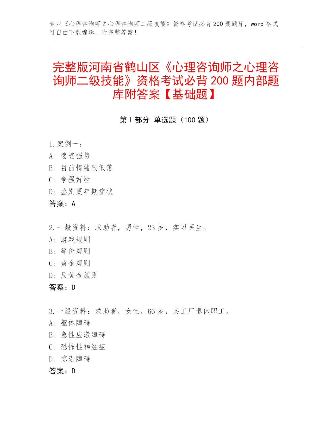 完整版河南省鹤山区《心理咨询师之心理咨询师二级技能》资格考试必背200题内部题库附答案【基础题】