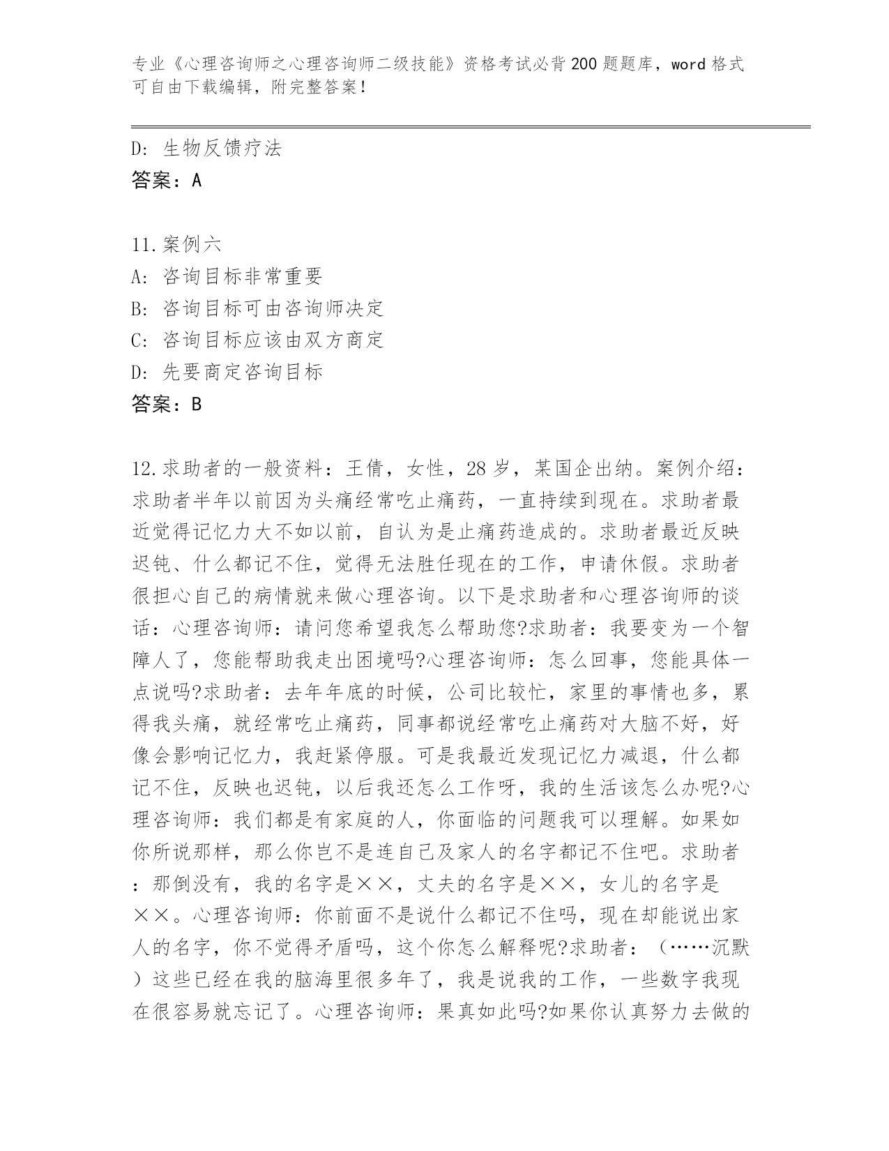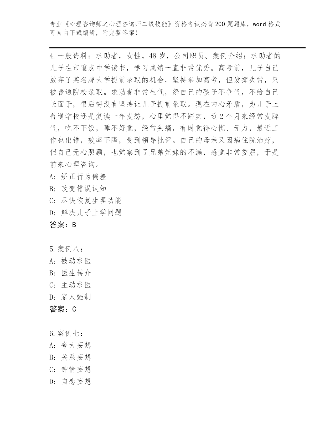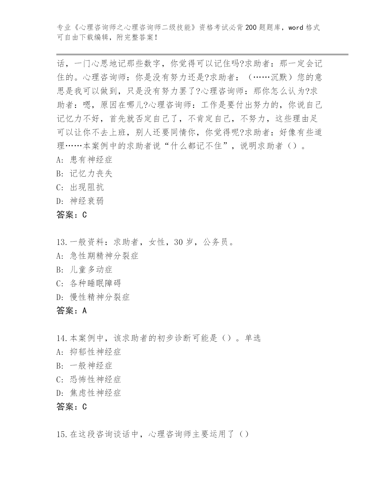 河南省内部使用《心理咨询师之心理咨询师二级技能》资格考试必背200题真题题库及答案(名师系列)
