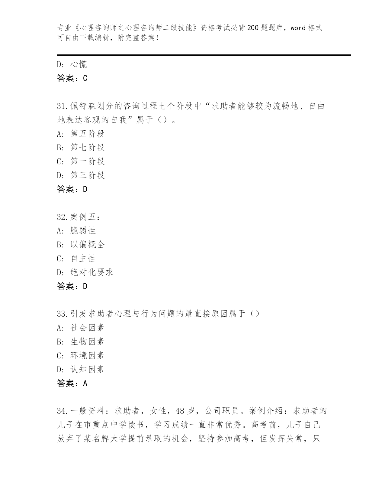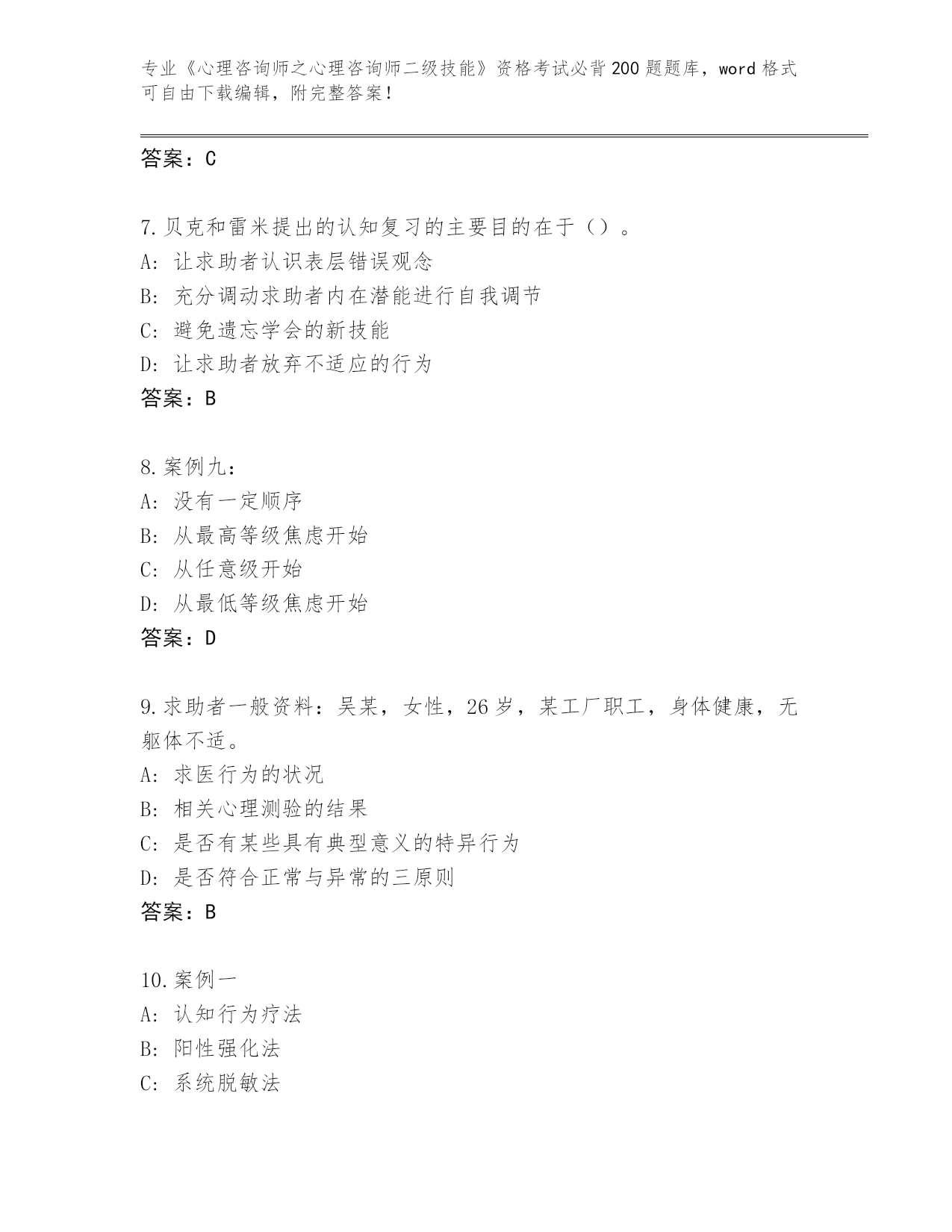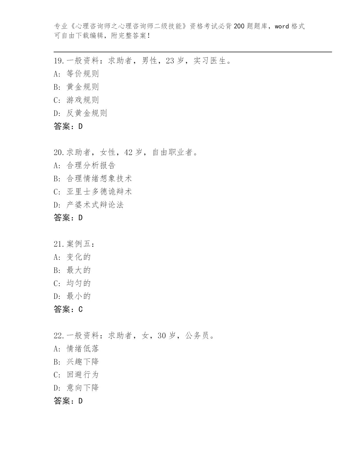 河南省内部使用《心理咨询师之心理咨询师二级技能》资格考试必背200题真题题库及答案(名师系列)