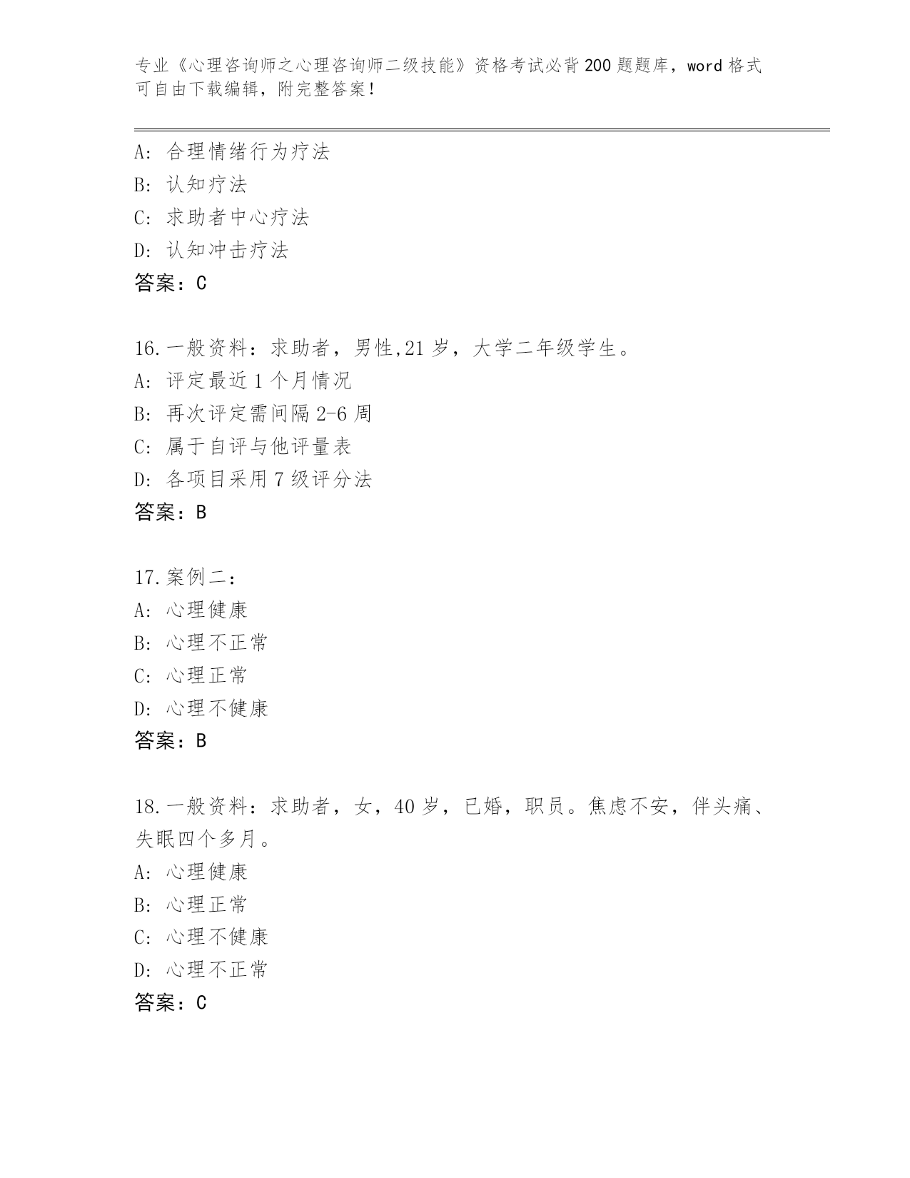 内部使用河南省湛河区《心理咨询师之心理咨询师二级技能》资格考试必背200题附下载答案