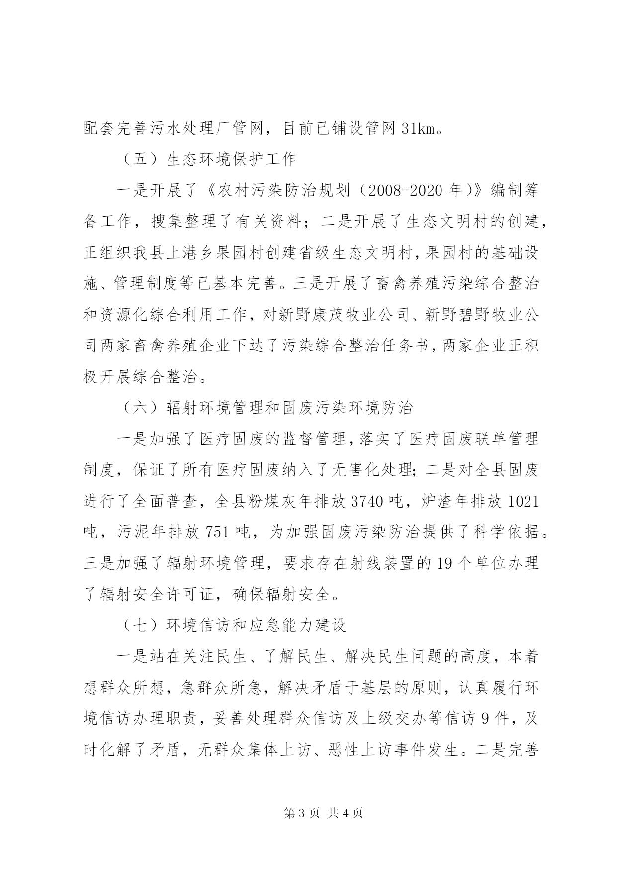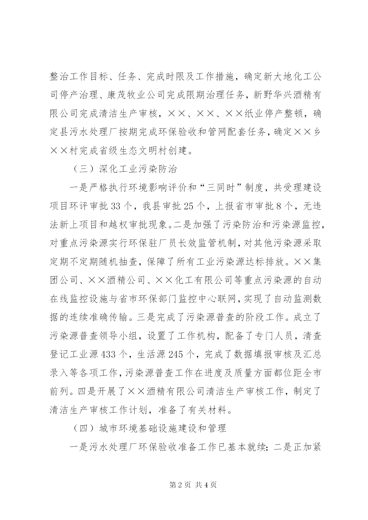 第PAGE\*Arabic\*MERGEFORMAT4页共NUMPAGES\*MERGEFORMAT4页环保目标自查报告按照市政府及市环保局的要求,现将我县环保目标进展情况报告如下:一、环境质量(一)元至五月份我县出境水×河桥断面化学耗氧量3月份超标,1、2、4、5月份达标,氨氮2、5月份达标,1、3、4月份超标。(二)城市集中饮用水源地水质达标率100%。二、工作目标(一)主要污染物总量削减工作2008年市政府下达给我县的主要污染物总量控制指标为:cod排放总量控制在7500吨,so2排放总量控制在1935吨以内,减排任务非常艰巨,县委、县政府、县主要领导非常重视,一是我县多次召开会议研究减排目标,分析减排形势,明确了减排工作重点和突破口;二是详细核算了减排量,制定了减排计划;三是与有关单位签了主要污染物减排目标责任书,把减排任务科学分解了有关企业和单位,并建立了定期督查制度,确保减排工作进度和质量。(二)环境综合整治我县印发了《2008年环境综合整治实施方案》,明确了综合整治工作目标、任务、完成时限及工作措施,确定新大地化工公司停产治理、康茂牧业公司完成限期治理任务,新野华兴酒精有限公司完成清洁生产审核,××、××、××纸业停产整顿,确定县污水处理厂按期完成环保验收和管网配套任务,确定××乡××村完成省级生态文明村创建。(三)深化工业污染防治一是严格执行环境影响评价和“三同时”制度,共受理建设项目环评审批33个,我县审批25个,上报省市审批8个,无违法新上项目和越权审批现象。二是加强了污染防治和污染源监控,对重点污染源实行环保驻厂员长效监管机制,对其他污染源采取定期不定期随机抽查,保障了所有工业污染源达标排放。××集团公司、××酒精公司、××化工有限公司等重点污染源的自动在线监控设施与省市环保部门监控中心联网,实现了自动监测数据的连续准确传输。三是完成了污染源普查的阶段工作。成立了污染源普查领导小组,设置了工作机构,配备了专门人员,清查登记工业源433个,生活源245个,完成了数据填报审核及汇总录入等各项工作,污染源普查工作在进度及质量方面都位距全市前列。四是开展了××酒精有限公司清洁生产审核工作,制定了清洁生产审核工作计划,准备了有关材料。(四)城市环境基础设施建设和管理一是污水处理厂环保验收准备工作已基本就续;二是正加紧配套完善污水处理厂管网,目前已铺设管网31km。(五)生态环境保护工作一是开展了《农村污染防治规划(2008-2020年)》编制筹备工作,搜集整理了有关资料;二是开展了生态文明村的创建,正组织我县上港乡果园村创建省级生态文明村,果园村的基础设施、管理制度等已基本完善。三是开展了畜禽养殖污染综合整治和资源化综合利用工作,对新野康茂牧业公司、新野碧野牧业公司两家畜禽养殖企业下达了污染综合整治任务书,两家企业正积极开展综合整治。(六)辐射环境管理和固废污染环境防治一是加强了医疗固废的监督管理,落实了医疗固废联单管理制度,保证了所有医疗固废纳入了无害化处理;二是对全县固废进行了全面普查,全县粉煤灰年排放3740吨,炉渣年排放1021吨,污泥年排放751吨,为加强固废污染防治提供了科学依据。三是加强了辐射环境管理,要求存在射线装置的19个单位办理了辐射安全许可证,确保辐射安全。(七)环境信访和应急能力建设一是站在关注民生、了解民生、解决民生问题的高度,本着想群众所想,急群众所急,解决矛盾于基层的原则,认真履行环境信访办理职责,妥善处理群众信访及上级交办等信访9件,及时化解了矛盾,无群众集体上访、恶性上访事件发生。二是完善了突发性环境安全事件应急处置预案,具备了突发性环境安全事件应急监测处置能力,上半年无重大环境安全事故和环境污染事件发生。下半年,我县将围绕2008年环境保护目标,采取更加有力措施,狠抓落实,确保按期完成各项年度环保目标任务。二○○八年六月二十日