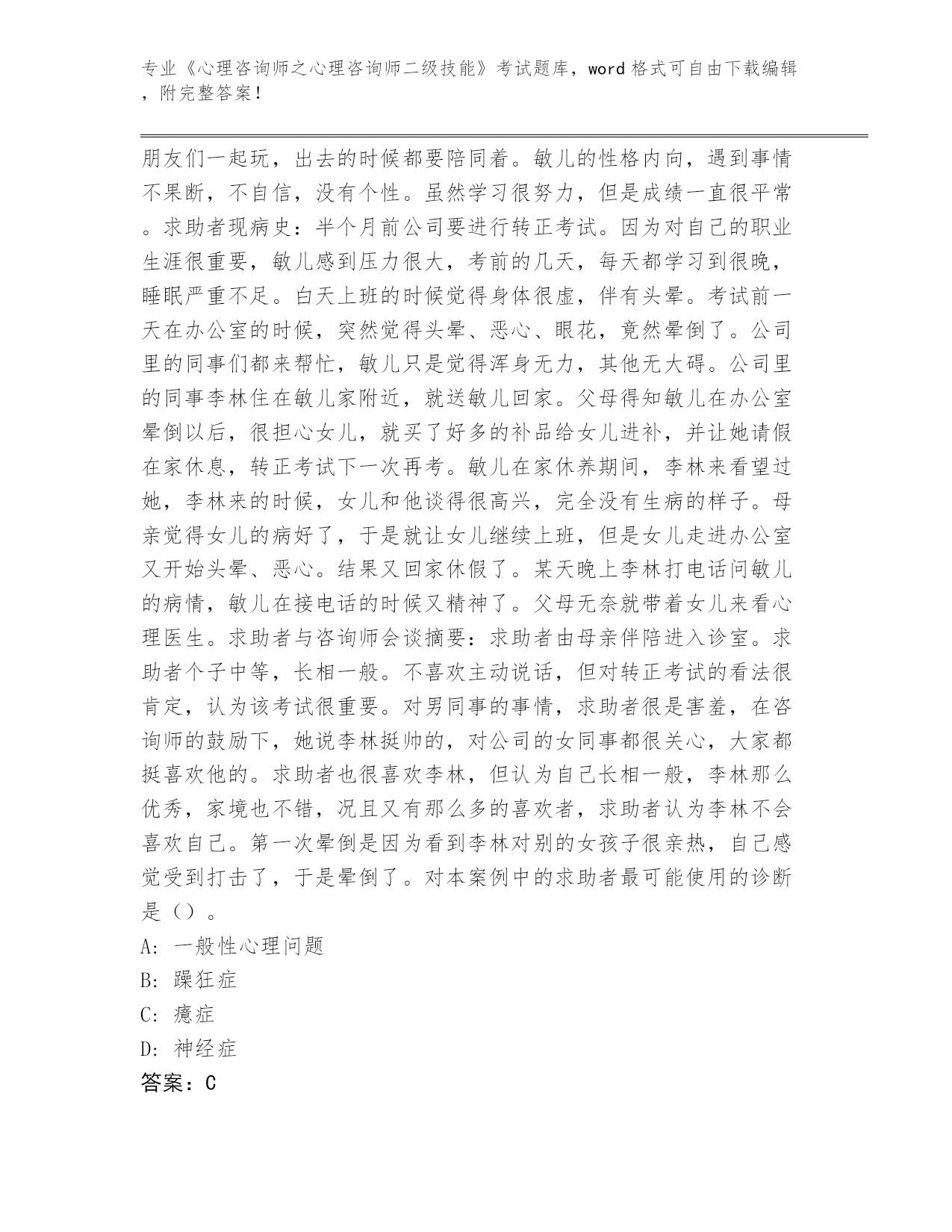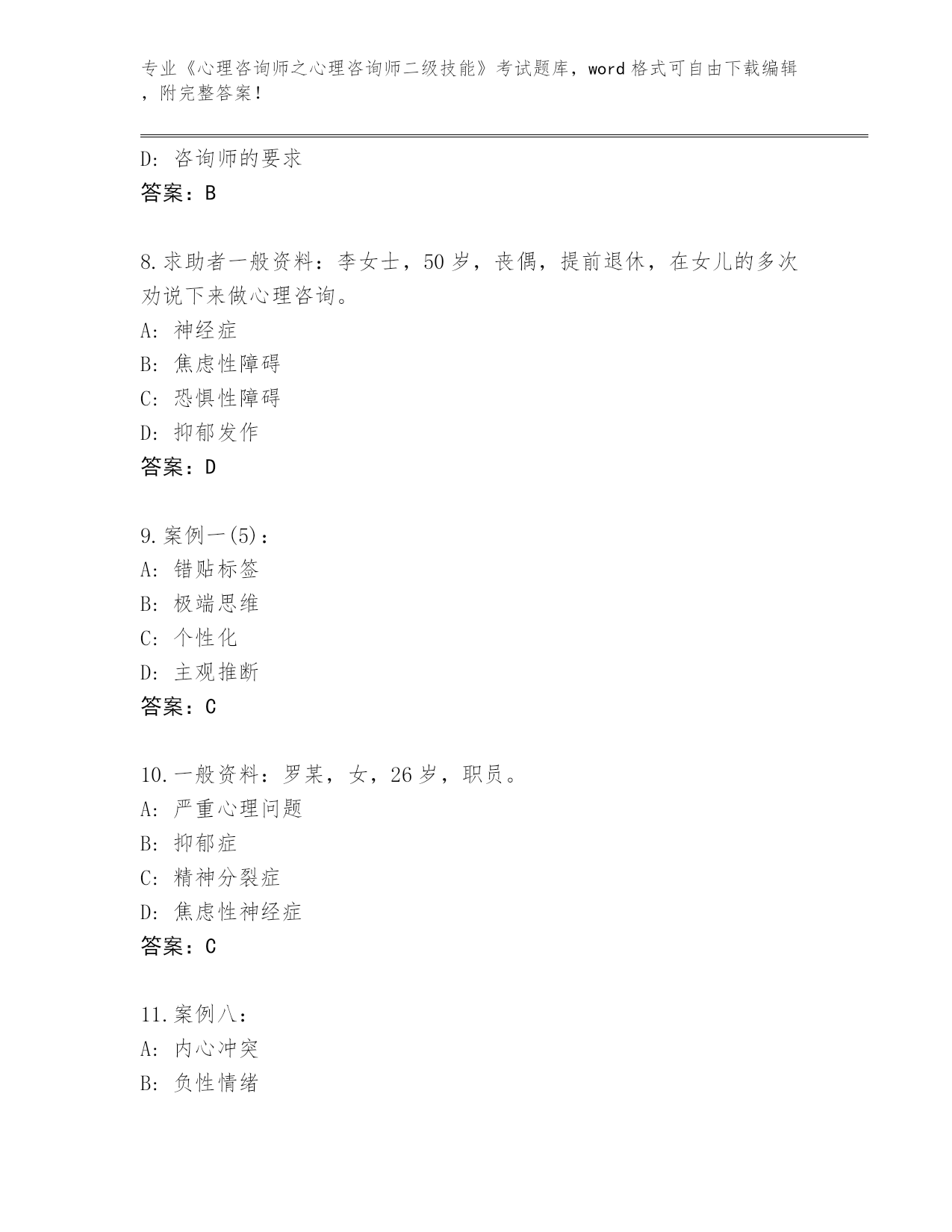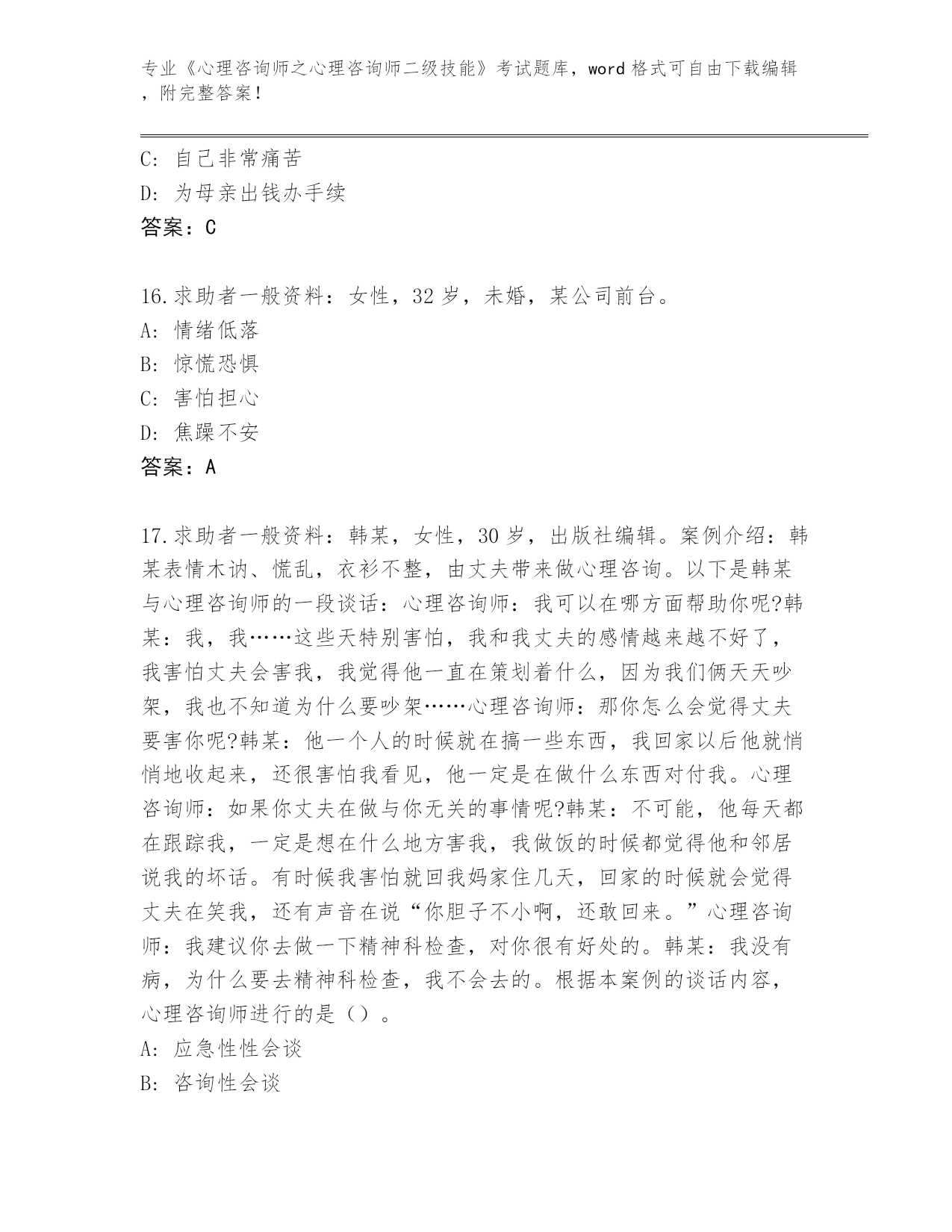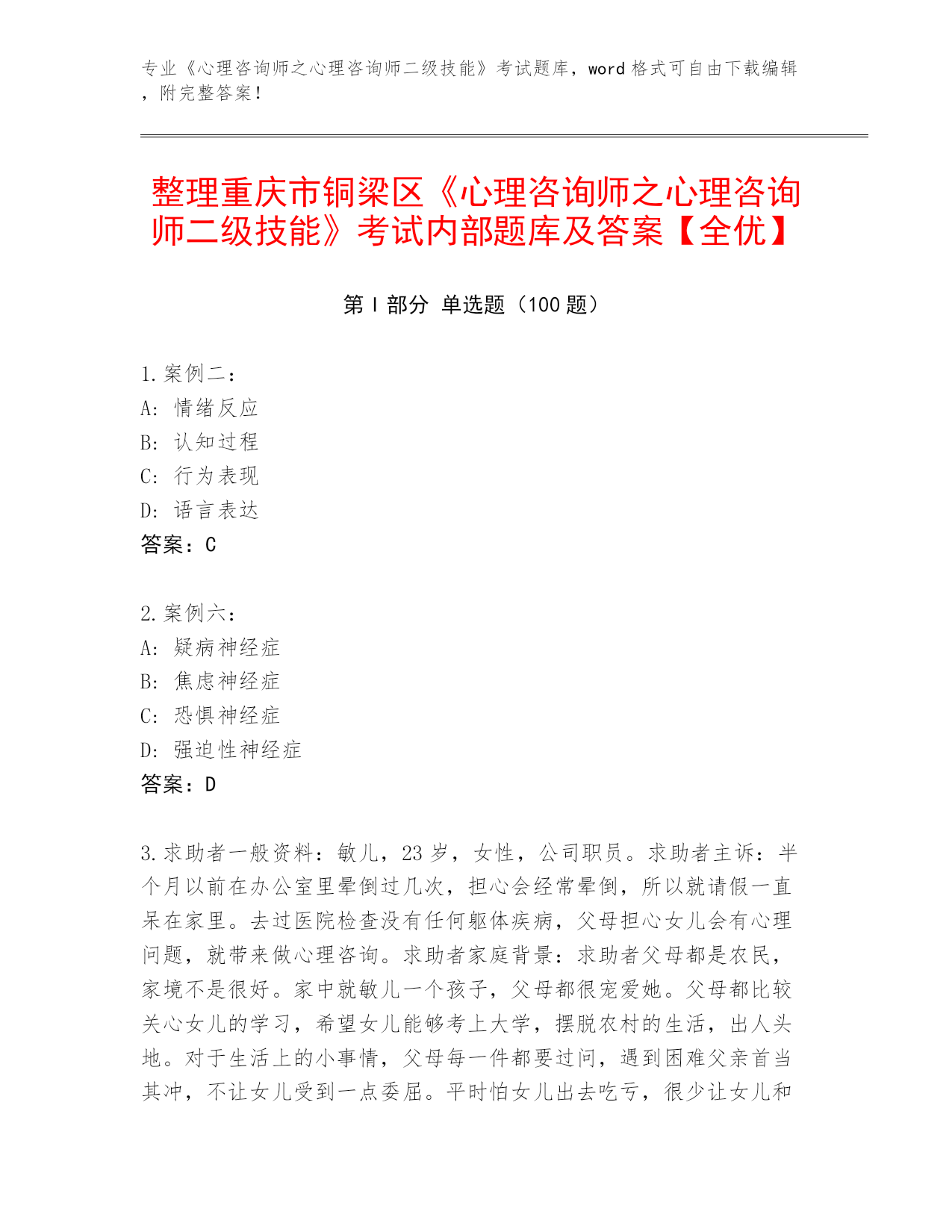 重庆市铜梁区整理《心理咨询师之心理咨询师二级技能》资格考试题库大全附参考答案(巩固)