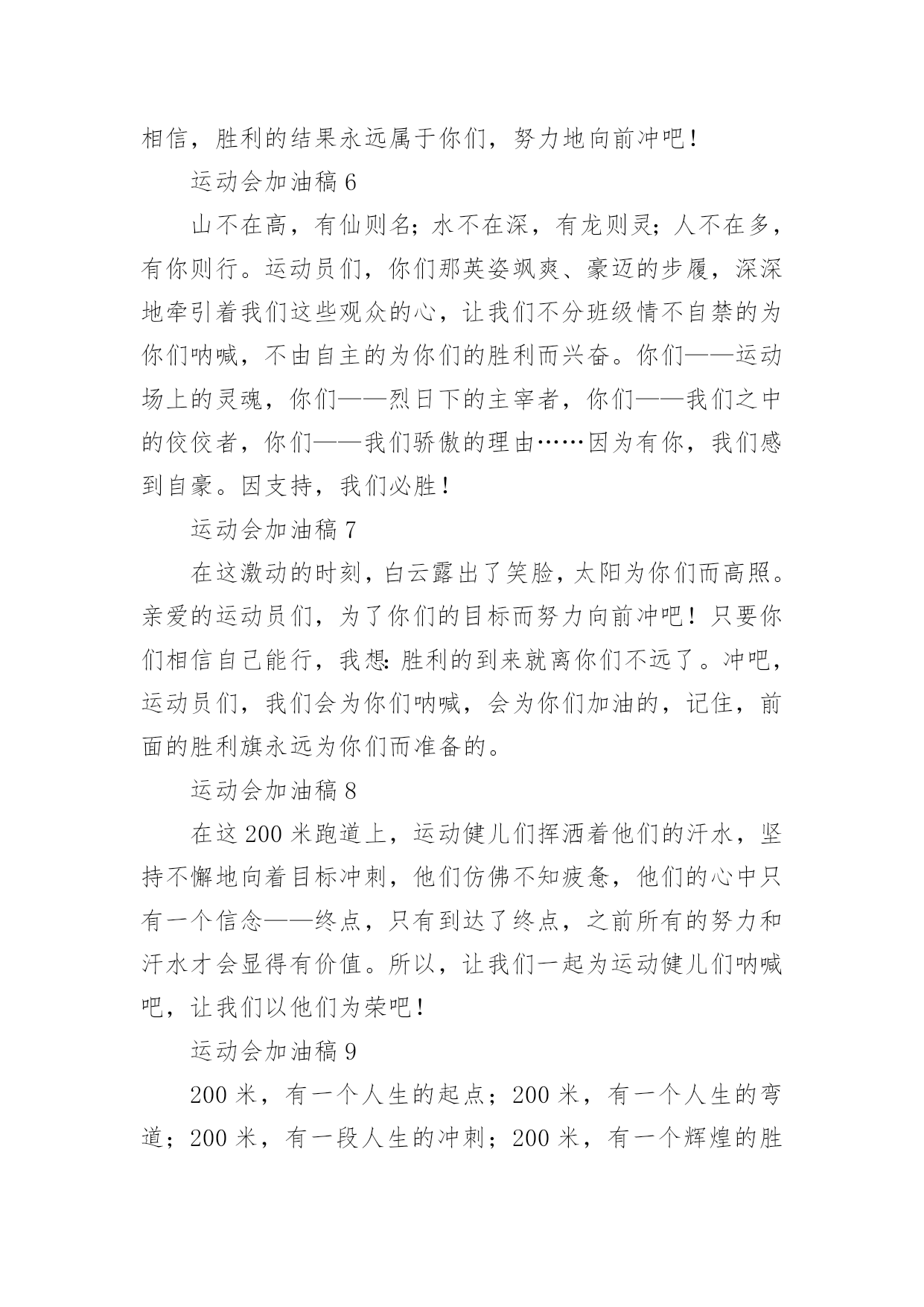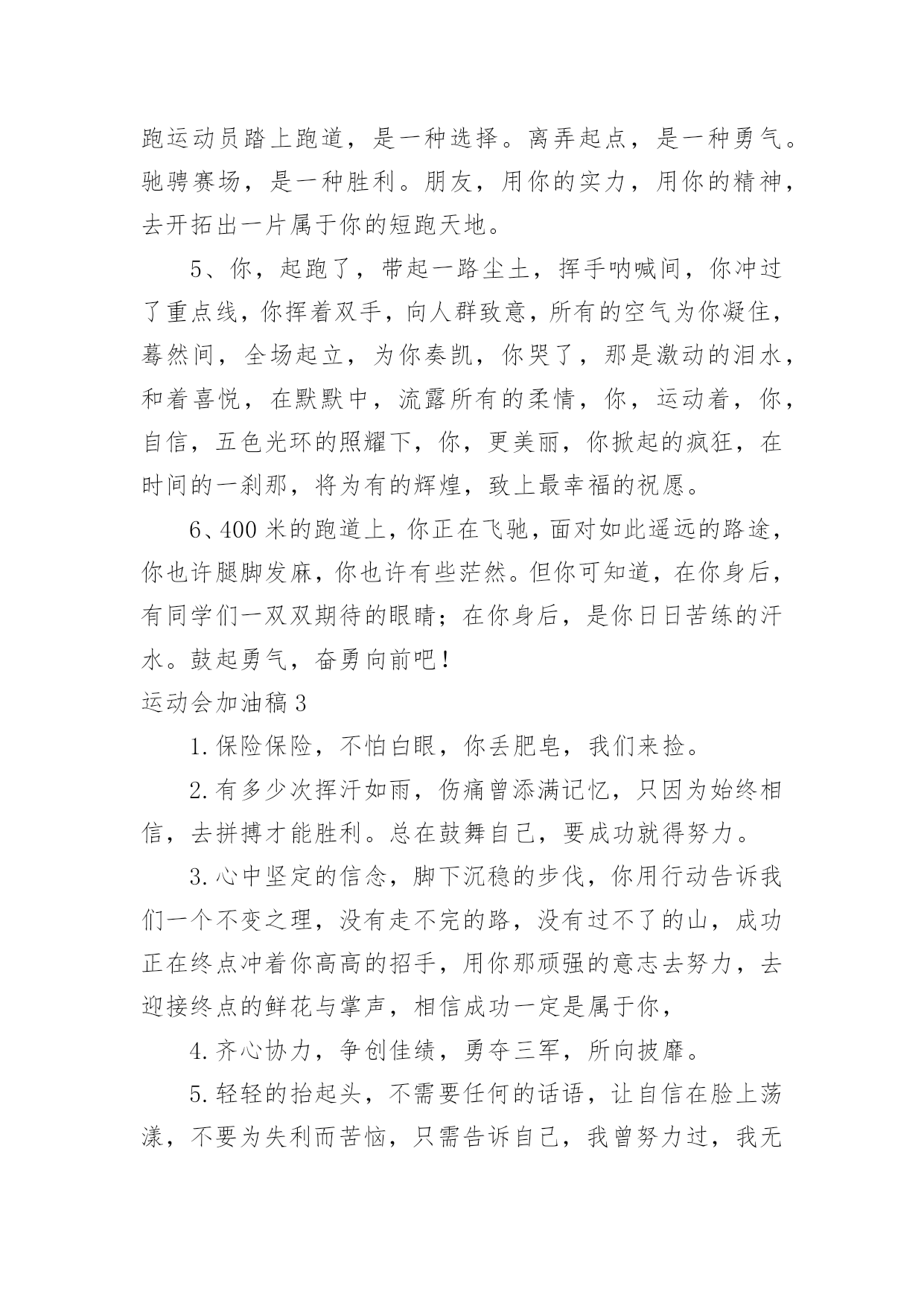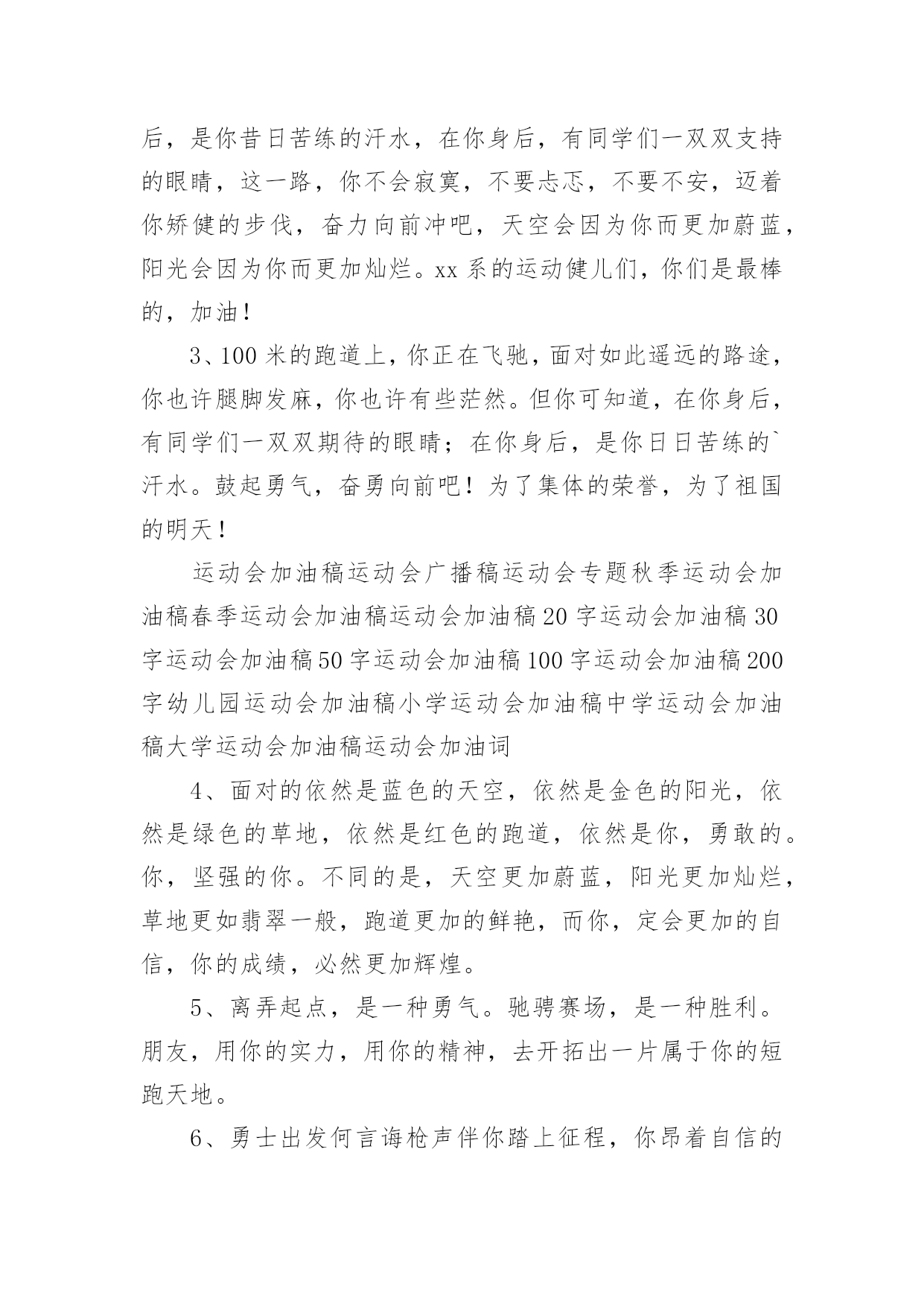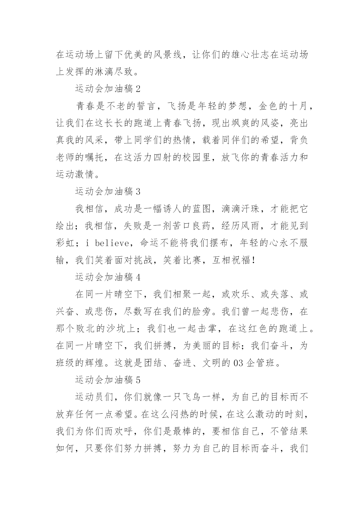 运动会加油稿【热门】运动会加油稿在现在社会,我们都跟加油稿有着直接或间接的联系,加油稿可以激励对方更好地参加活动。相信很多朋友都对写加油稿感到非常苦恼吧,以下是小编为大家整理的运动会加油稿,希望能够帮助到大家。运动会加油稿1★1你的汗水洒在跑道,浇灌着成功的花朵开放。你的欢笑飞扬在赛场,为班争光数你最棒。跑吧,追吧在这广阔的赛场上,你似骏马似离铉的箭。跑吧,追吧你比虎猛比豹强★2虽然你们在场上的时间很短暂,但你们的身影依然停留在人们的脑海里,因为你们是赛场上最可一一爱一一的人★3不为掌声的注释不为刻意的征服不为失败的痛苦只有辛勤的汗水化作成功的脚步★4你们挥舞着充满力量的双臂看着实心球化成美丽的弧线我着实在心里佩服你们你们抛出了自己的最佳水平3一根小小的木棒,连接的是一团一结和友一一爱一一一根小小的木棒,传递的是勇气和力量一根小小的.木棒,演绎的是奋斗和拼搏加油吧!让这Ji动人心的时刻,一直回荡在我们心中!★5深深的呼吸,等待你的是艰难的1500米。相信胜利会属于你们。但在这征一途上,需要你勇敢的心去面对。我们在为你加油,你是否听到了我们发自心中的呐喊?困难和胜利都在向你招手,去呀,快去呀,不要犹豫。快去击败困难、快去夺取胜利!相信你会送给我们一个汗水浸一湿的微笑!★6生活中,我们每天都在尝试尝试中,我们走向成功品味失败,走过心灵的一陰一雨晴空运动员们,不要放弃尝试无论失败与否重要的是你勇于参与的一一精一一神,付出的背后是胜利无论是否成功,我们永远赞美你,你们永远是我们的骄傲,★7心中坚定的信念,脚下沉稳的步伐,你用行动告诉我们一个不变之理,没有走不完的路,没有过不了的山,成功正在终点冲着你高高的招手,用你那顽强的意志去努力,去迎接终点的鲜花与掌声,相信成功一定是属于你,★8坚定,执着,耐力与希望,在延伸的白色跑道中点点凝聚!力量,信念,拼搏与奋斗,在遥远的终点线上渐渐明亮!时代的强音正在你的脚下踏响。★9环形的跑道一圈又一圈的坚持,毅力与一一精一一神活跃在会场上,湿一透的衣衫,满头的大汗,无限追求奋力追赶,我们为你欢呼跳跃,我们为你骄傲★10踏上跑道,是一种选择。离开起点,是一种勇气。驰骋赛场,是一种胜利。★11运动健将们,用你的实力,用你的一一精一一神,去开拓出,一片属于你的长跑天地!★12你是运动场的心脏,跳动梦想;你是漫长路的一一精一一神,激励辉煌;你们是将上下求索的人!风为你加油,云为你助兴,坚定,执着,耐力与希望,在延伸的白色跑道中点点凝聚!力量,信念,拼搏与奋斗,在遥远的终点线上渐渐明亮!时代的强音正在你的脚下踏响。运动会加油稿21、四个完美的弧线,被一根小小的棒儿连接。这是人生的完美,这是运动的极限。莫要问,我们为什么配合这样默契,莫要问,我们为什么这样紧密团结。因为,我们是情同手足的,体育健儿!、2、400米的跑道上,你正在飞驰,面对如此遥远的路途,你也许腿脚发麻,你也许有些茫然。但你可知道,在你身后,有同学们一双双期待的眼睛;在你身后,是你日日苦练的汗水。鼓起勇气,奋勇向前吧!为了集体的荣誉,为了祖国的明天!3。你和红色的地面有个约定,那上面,总有你奔跑的`身影;你与绿色的草坪有个约定,那上面,浸着你辛劳的汗渍。你与我们有个约定,说你一定要赢,也一定会赢。枪声响了四百米九秒,却又相几个世纪你喊着,跑着迈开大步跨过世纪。4、400米不算长,人生贵在拼一场。健儿奔跑比健康,同龄同路谁最强!风采撒满跑道上,赛场佳绩美名扬!致短跑运动员踏上跑道,是一种选择。离弄起点,是一种勇气。驰骋赛场,是一种胜利。朋友,用你的实力,用你的精神,去开拓出一片属于你的短跑天地。5、你,起跑了,带起一路尘土,挥手呐喊间,你冲过了重点线,你挥着双手,向人群致意,所有的空气为你凝住,蓦然间,全场起立,为你奏凯,你哭了,那是激动的泪水,和着喜悦,在默默中,流露所有的柔情,你,运动着,你,自信,五色光环的照耀下,你,更美丽,你掀起的疯狂,在时间的一刹那,将为有的辉煌,致上最幸福的祝愿。6、400米的跑道上,你正在飞驰,面对如此遥远的路途,你也许腿脚发麻,你也许有些茫然。但你可知道,在你身后,有同学们一双双期待的眼睛;在你身后,是你日日苦练的汗水。鼓起勇气,奋勇向前吧!运动会加油稿31.保险保险,不怕白眼,你丢肥皂,我们来捡。2.有多少次挥汗如雨,伤痛曾添满记忆,只因为始终相信,去拼搏才能胜利。总在鼓舞自己,要成功就得努力。3.心中坚定的信念,脚下沉稳的步伐,你用行动告诉我们一个不变之理,没有走不完的路,没有过不了的山,成功正在终点冲着你高高的招手,用你那顽强的意志去努力,去迎接终点的鲜花与掌声,相信成功一定是属于你,4.齐心协力,争创佳绩,勇夺三军,所向披靡。5.轻轻的抬起头,不需要任何的话语,让自信在脸上荡漾,不要为失利而苦恼,只需告诉