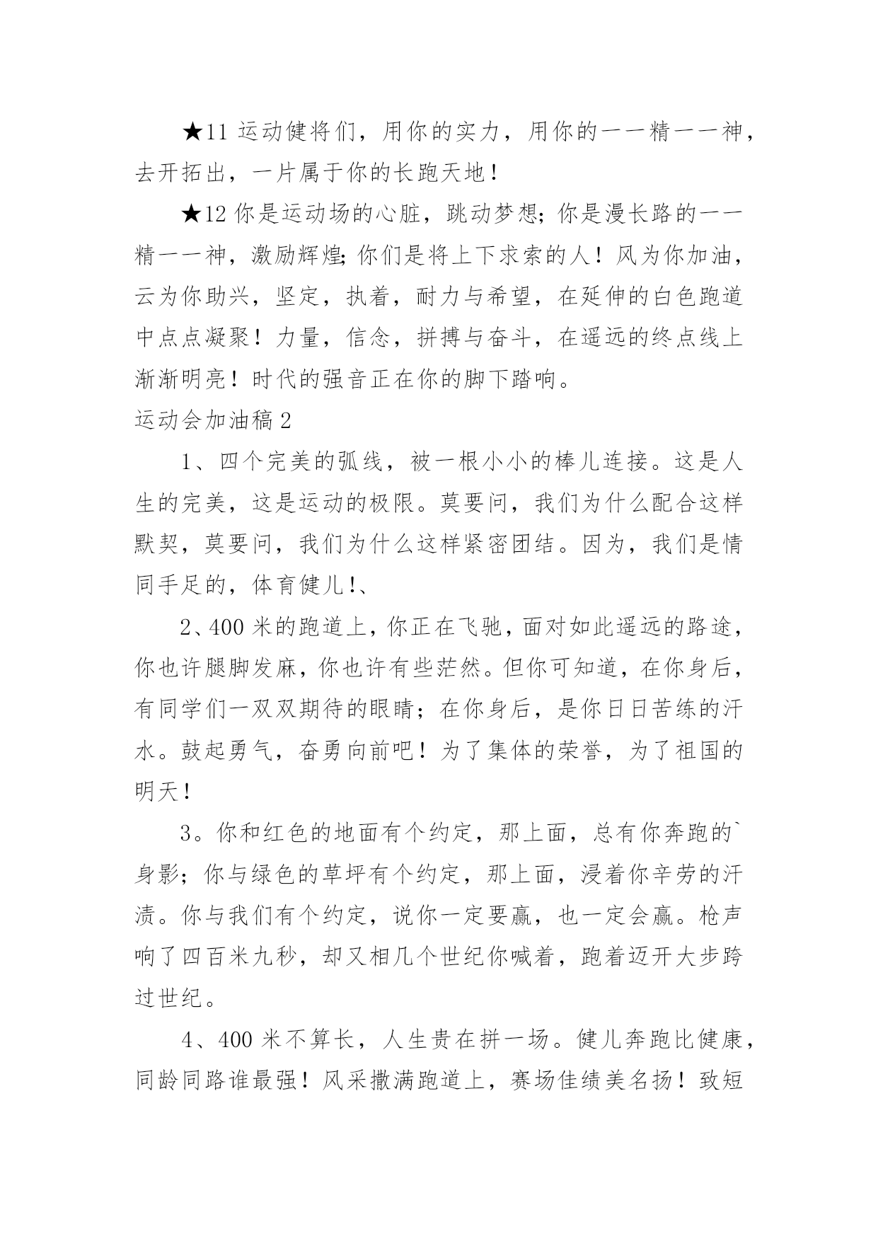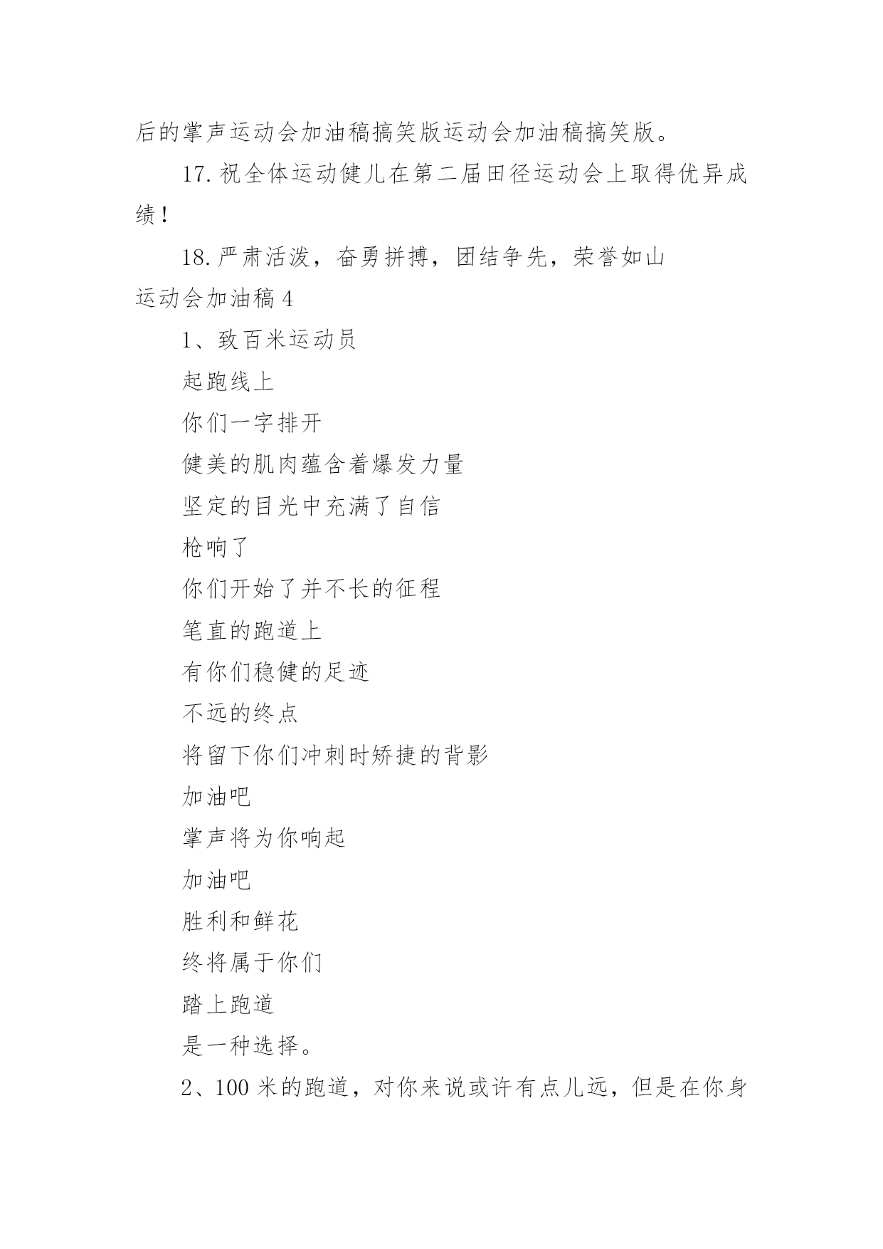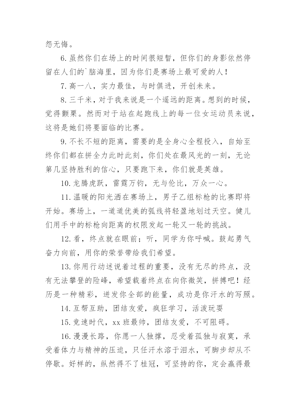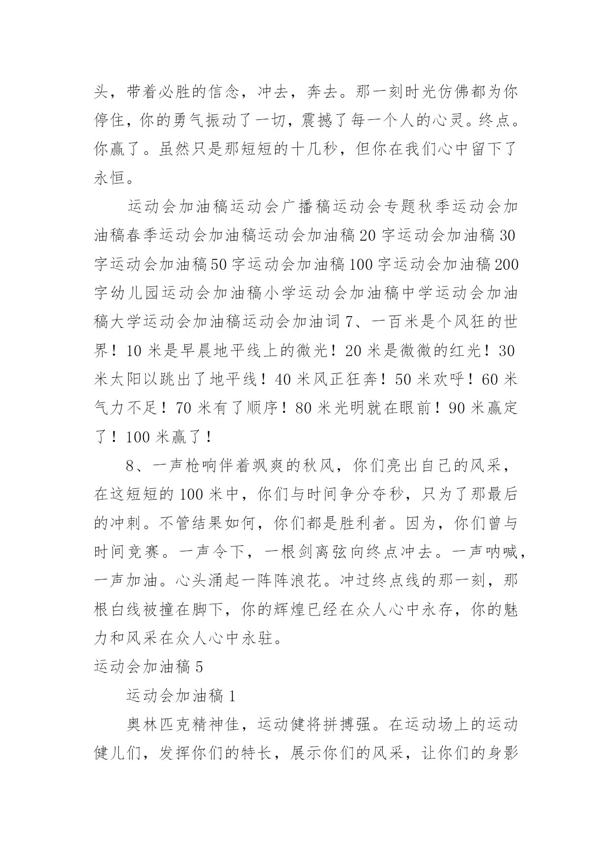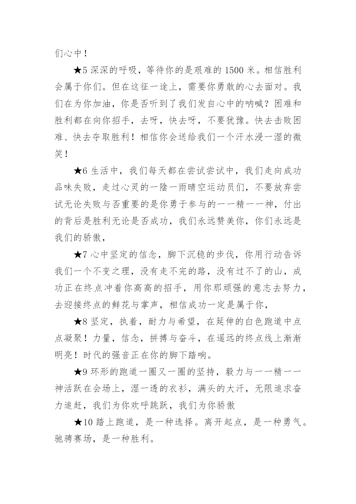 运动会加油稿【热门】运动会加油稿在现在社会,我们都跟加油稿有着直接或间接的联系,加油稿可以激励对方更好地参加活动。相信很多朋友都对写加油稿感到非常苦恼吧,以下是小编为大家整理的运动会加油稿,希望能够帮助到大家。运动会加油稿1★1你的汗水洒在跑道,浇灌着成功的花朵开放。你的欢笑飞扬在赛场,为班争光数你最棒。跑吧,追吧在这广阔的赛场上,你似骏马似离铉的箭。跑吧,追吧你比虎猛比豹强★2虽然你们在场上的时间很短暂,但你们的身影依然停留在人们的脑海里,因为你们是赛场上最可一一爱一一的人★3不为掌声的注释不为刻意的征服不为失败的痛苦只有辛勤的汗水化作成功的脚步★4你们挥舞着充满力量的双臂看着实心球化成美丽的弧线我着实在心里佩服你们你们抛出了自己的最佳水平3一根小小的木棒,连接的是一团一结和友一一爱一一一根小小的木棒,传递的是勇气和力量一根小小的.木棒,演绎的是奋斗和拼搏加油吧!让这Ji动人心的时刻,一直回荡在我们心中!★5深深的呼吸,等待你的是艰难的1500米。相信胜利会属于你们。但在这征一途上,需要你勇敢的心去面对。我们在为你加油,你是否听到了我们发自心中的呐喊?困难和胜利都在向你招手,去呀,快去呀,不要犹豫。快去击败困难、快去夺取胜利!相信你会送给我们一个汗水浸一湿的微笑!★6生活中,我们每天都在尝试尝试中,我们走向成功品味失败,走过心灵的一陰一雨晴空运动员们,不要放弃尝试无论失败与否重要的是你勇于参与的一一精一一神,付出的背后是胜利无论是否成功,我们永远赞美你,你们永远是我们的骄傲,★7心中坚定的信念,脚下沉稳的步伐,你用行动告诉我们一个不变之理,没有走不完的路,没有过不了的山,成功正在终点冲着你高高的招手,用你那顽强的意志去努力,去迎接终点的鲜花与掌声,相信成功一定是属于你,★8坚定,执着,耐力与希望,在延伸的白色跑道中点点凝聚!力量,信念,拼搏与奋斗,在遥远的终点线上渐渐明亮!时代的强音正在你的脚下踏响。★9环形的跑道一圈又一圈的坚持,毅力与一一精一一神活跃在会场上,湿一透的衣衫,满头的大汗,无限追求奋力追赶,我们为你欢呼跳跃,我们为你骄傲★10踏上跑道,是一种选择。离开起点,是一种勇气。驰骋赛场,是一种胜利。★11运动健将们,用你的实力,用你的一一精一一神,去开拓出,一片属于你的长跑天地!★12你是运动场的心脏,跳动梦想;你是漫长路的一一精一一神,激励辉煌;你们是将上下求索的人!风为你加油,云为你助兴,坚定,执着,耐力与希望,在延伸的白色跑道中点点凝聚!力量,信念,拼搏与奋斗,在遥远的终点线上渐渐明亮!时代的强音正在你的脚下踏响。运动会加油稿21、四个完美的弧线,被一根小小的棒儿连接。这是人生的完美,这是运动的极限。莫要问,我们为什么配合这样默契,莫要问,我们为什么这样紧密团结。因为,我们是情同手足的,体育健儿!、2、400米的跑道上,你正在飞驰,面对如此遥远的路途,你也许腿脚发麻,你也许有些茫然。但你可知道,在你身后,有同学们一双双期待的眼睛;在你身后,是你日日苦练的汗水。鼓起勇气,奋勇向前吧!为了集体的荣誉,为了祖国的明天!3。你和红色的地面有个约定,那上面,总有你奔跑的`身影;你与绿色的草坪有个约定,那上面,浸着你辛劳的汗渍。你与我们有个约定,说你一定要赢,也一定会赢。枪声响了四百米九秒,却又相几个世纪你喊着,跑着迈开大步跨过世纪。4、400米不算长,人生贵在拼一场。健儿奔跑比健康,同龄同路谁最强!风采撒满跑道上,赛场佳绩美名扬!致短跑运动员踏上跑道,是一种选择。离弄起点,是一种勇气。驰骋赛场,是一种胜利。朋友,用你的实力,用你的精神,去开拓出一片属于你的短跑天地。5、你,起跑了,带起一路尘土,挥手呐喊间,你冲过了重点线,你挥着双手,向人群致意,所有的空气为你凝住,蓦然间,全场起立,为你奏凯,你哭了,那是激动的泪水,和着喜悦,在默默中,流露所有的柔情,你,运动着,你,自信,五色光环的照耀下,你,更美丽,你掀起的疯狂,在时间的一刹那,将为有的辉煌,致上最幸福的祝愿。6、400米的跑道上,你正在飞驰,面对如此遥远的路途,你也许腿脚发麻,你也许有些茫然。但你可知道,在你身后,有同学们一双双期待的眼睛;在你身后,是你日日苦练的汗水。鼓起勇气,奋勇向前吧!运动会加油稿31.保险保险,不怕白眼,你丢肥皂,我们来捡。2.有多少次挥汗如雨,伤痛曾添满记忆,只因为始终相信,去拼搏才能胜利。总在鼓舞自己,要成功就得努力。3.心中坚定的信念,脚下沉稳的步伐,你用行动告诉我们一个不变之理,没有走不完的路,没有过不了的山,成功正在终点冲着你高高的招手,用你那顽强的意志去努力,去迎接终点的鲜花与掌声,相信成功一定是属于你,4.齐心协力,争创佳绩,勇夺三军,所向披靡。5.轻轻的抬起头,不需要任何的话语,让自信在脸上荡漾,不要为失利而苦恼,只需告诉