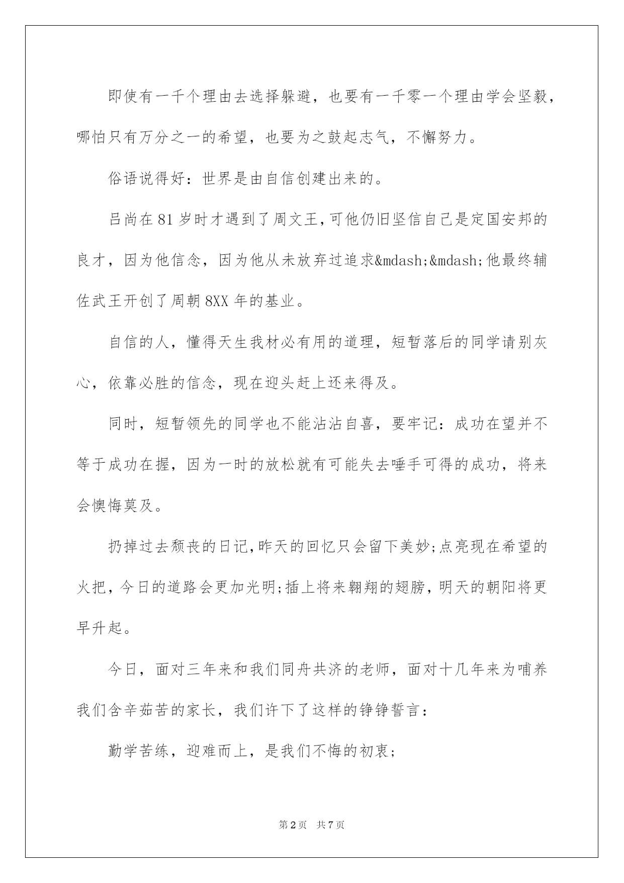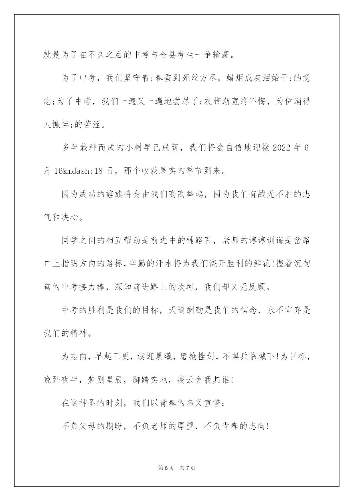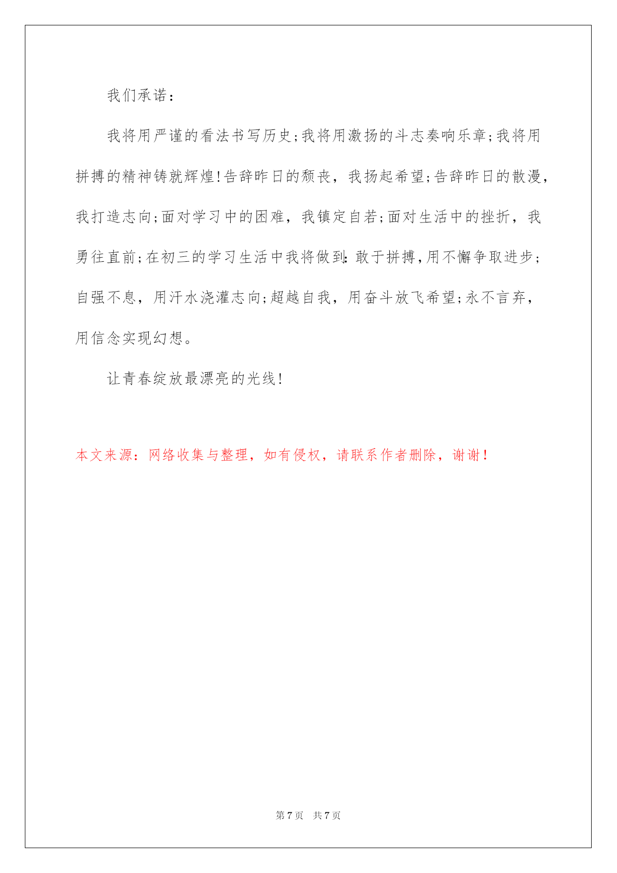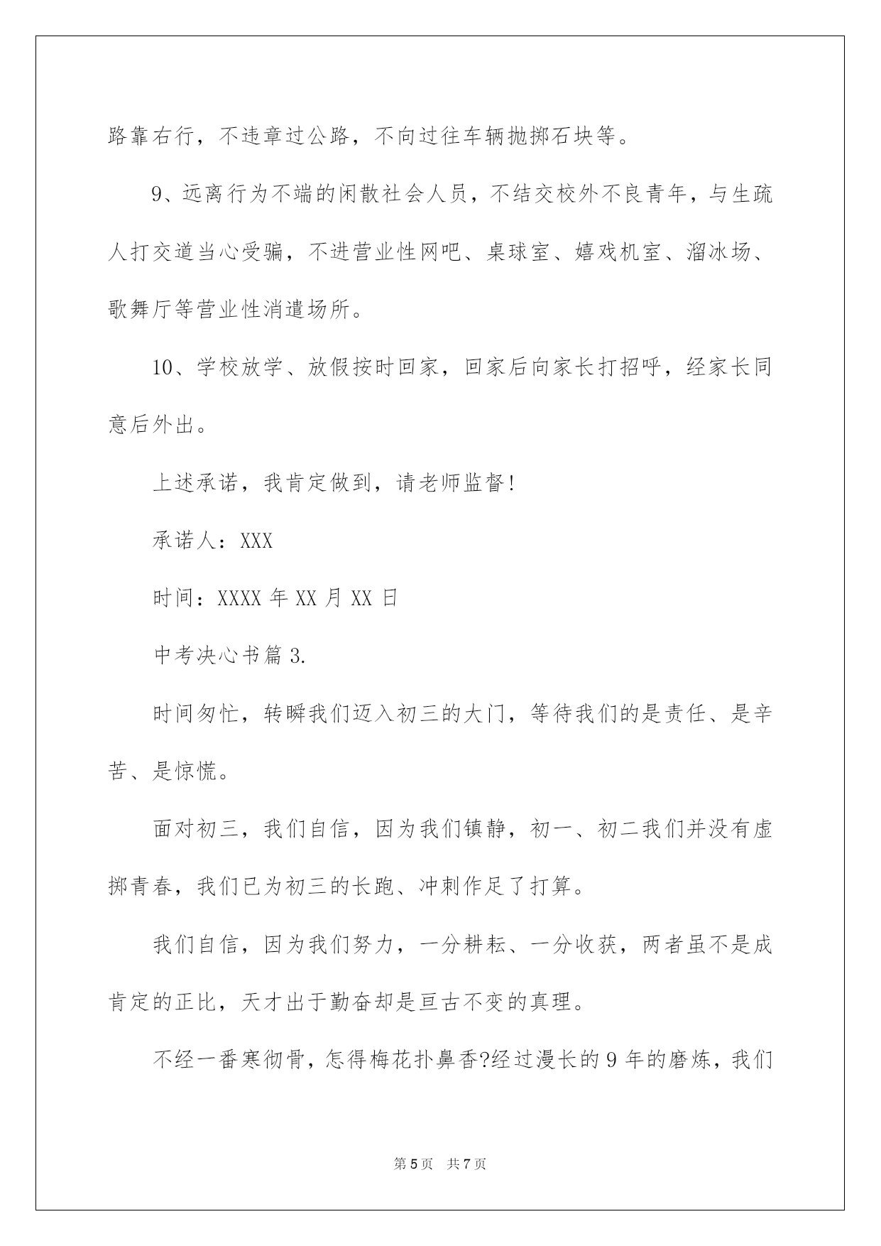 第PAGE\*Arabic\*MERGEFORMAT7页共NUMPAGES\*Arabic\*MERGEFORMAT7页第PAGE\*MERGEFORMAT7页共NUMPAGES\*MERGEFORMAT7页第PAGE\*MERGEFORMAT7页共NUMPAGES\*MERGEFORMAT7页第PAGE\*MERGEFORMAT7页共NUMPAGES\*MERGEFORMAT7页第PAGE\*MERGEFORMAT7页共NUMPAGES\*MERGEFORMAT7页第PAGE\*MERGEFORMAT7页共NUMPAGES\*MERGEFORMAT7页第PAGE\*MERGEFORMAT7页共NUMPAGES\*MERGEFORMAT7页第PAGE\*MERGEFORMAT7页共NUMPAGES\*MERGEFORMAT7页第PAGE\*MERGEFORMAT7页共NUMPAGES\*MERGEFORMAT7页第PAGE\*MERGEFORMAT7页共NUMPAGES\*MERGEFORMAT7页第PAGE\*MERGEFORMAT7页共NUMPAGES\*MERGEFORMAT7页2022初中中考决心书初中中考决心书中考是我们升入中学的考试,初中中考决心书应当怎么写!我为大家整理了初中中考决心书范文,欢迎阅读!中考决心书篇1中考的脚步声越来越近,最终冲刺的时刻已到,以往的成功或失败,汗水和泪水都已远去,从现在起先,我们将起先一段新的寻梦之旅。战斗中最艰难的是最终几分钟,成败与否就看是否能坚持究竟。当然,困难和不顺在所难免,假如总是懊丧,我们的学习生活只能是荒芜的沙漠,不如拿出十二分的志气和二十四分的毅力去战胜困难,超越自我。或许,志向与现实相距太遥远,无法把自己放飞;或许,初中生活平淡的轮回交替,早已把斗志磨碎。然而,这一切都会变更,百日之后的中考是一次空前的考验,;优胜劣汰;的生存法则会以最残酷的方式呈现。即使有一千个理由去选择躲避,也要有一千零一个理由学会坚毅,哪怕只有万分之一的希望,也要为之鼓起志气,不懈努力。俗语说得好:世界是由自信创建出来的。吕尚在81岁时才遇到了周文王,可他仍旧坚信自己是定国安邦的良才,因为他信念,因为他从未放弃过追求——他最终辅佐武王开创了周朝8XX年的基业。自信的人,懂得天生我材必有用的道理,短暂落后的同学请别灰心,依靠必胜的信念,现在迎头赶上还来得及。同时,短暂领先的同学也不能沾沾自喜,要牢记:成功在望并不等于成功在握,因为一时的放松就有可能失去唾手可得的成功,将来会懊悔莫及。扔掉过去颓丧的日记,昨天的回忆只会留下美妙;点亮现在希望的火把,今日的道路会更加光明;插上将来翱翔的翅膀,明天的朝阳将更早升起。今日,面对三年来和我们同舟共济的老师,面对十几年来为哺养我们含辛茹苦的家长,我们许下了这样的铮铮誓言:勤学苦练,迎难而上,是我们不悔的初衷;戒骄戒躁,稳扎稳打,是我们恪守的信条;书山顶峰,学海彼岸,是我们金色的航向!最终诚心祝福同学们中考胜利!初中学生承诺书范文篇2敬重的老师:为了保证我自己在学生期间能够平安学习,平安生活,不断的强化自己的`生命平安意识,我向学校、老师庄重承诺:1、严格根据《中小学生守则》和《中学生日常行为规范》要求自己,遵守学校的平安管理制度,保证学习、生活的平安。2、严格遵守课堂纪律,遵守作息时间,不旷课,不迟到,不到校外游逛,根据老师要求严格遵守操作程序、教学步骤;不擅自讲话,必需先举手,经老师允许再讲。3、有事向老师请假,获得批准以后凭请假条离开学校,并且按时返校。4、生命是最为珍贵的,生命对每个人只有一次,;珍爱生命远离危急;是我们的神圣职责与义务,真正相识到下河游泳的危害性,做到绝不到无平安设施的地方下河游泳;发觉其他同学有下河游泳的想法或下河游泳者刚好报告班主任、政教处、校领导;自觉参加学校、班级组织的各种禁止下河游泳活动。5、严禁打架斗殴、同学之间有冲突要请班主任或其他老师解决,小偷小摸、酗酒闹事、巧取豪夺、情节严峻,看法恶劣者将从严从重处理,够成犯法犯罪的,交有关司法部门处理。6、遵守依照规定线路依序上下,轻言慢步;休息时间,文明守纪,不疯逗打闹,不惊嚷怪叫;定期参与学校组织的平安演练:不翻越围墙、栏杆、窗台、校门等,不玩火,不做危急嬉戏,严防火灾以及其他意外损害事故的发生。7、不向班主任隐瞒病史,防止疾病突发,救助不刚好。不到地摊及卫生状况不佳的店铺购买食品和物品。8、仔细学习交通法规和交通平安学问,提高自己的平安意识和防护自救实力,时刻提示自己留意维护自己和他人的交通平安。