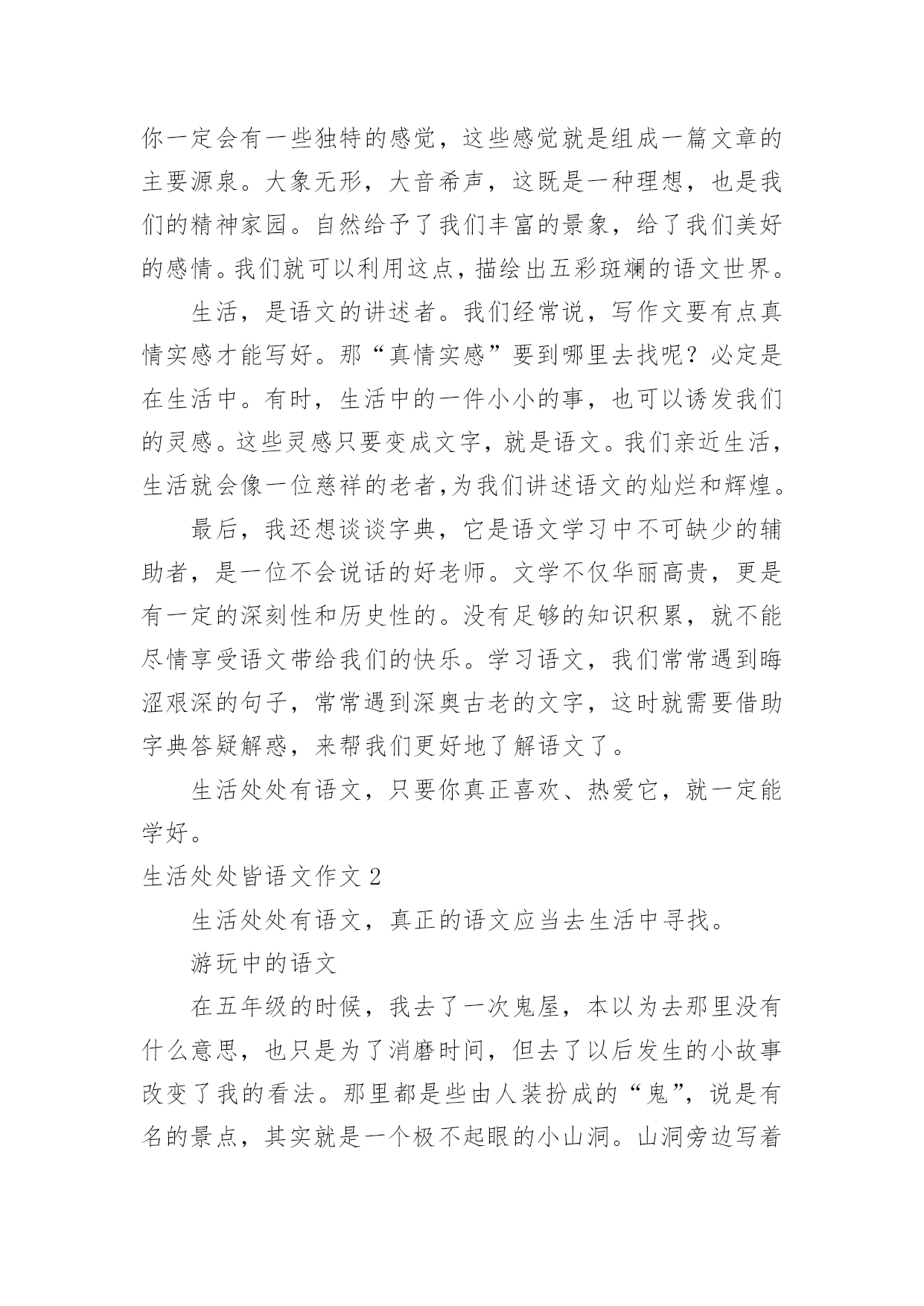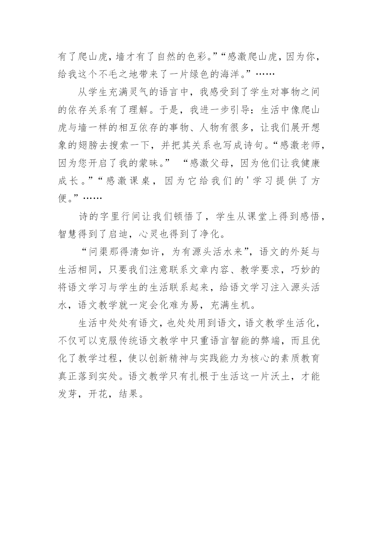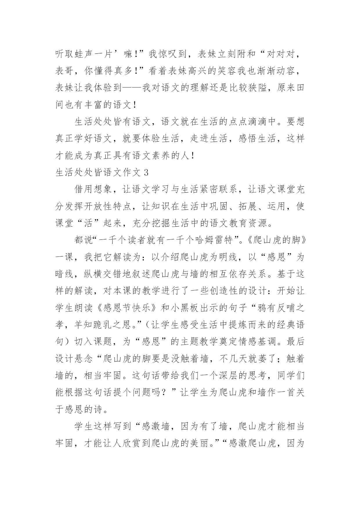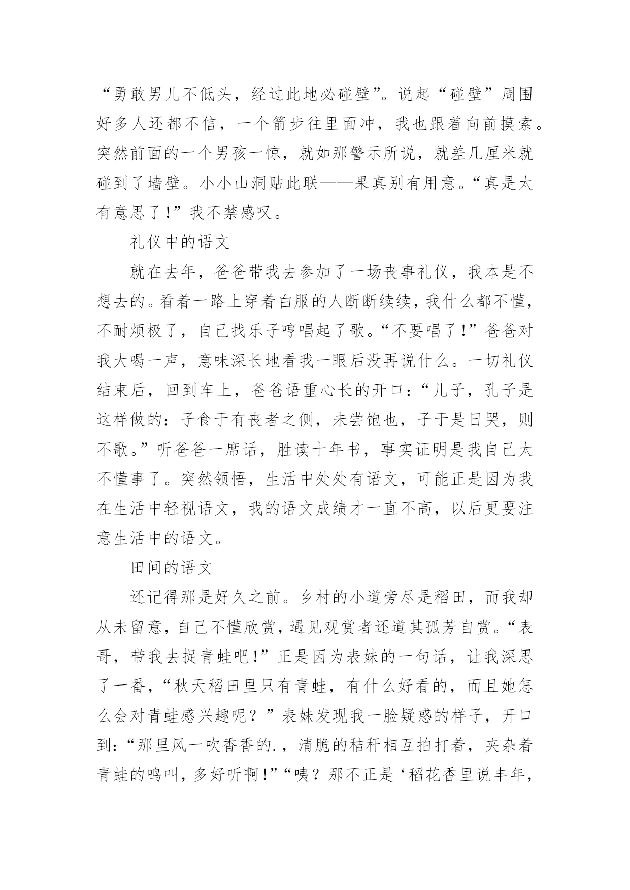 生活处处皆语文作文生活处处皆语文作文3篇[热]在学习、工作乃至生活中,大家都经常看到作文的身影吧,作文是经过人的思想考虑和语言组织,通过文字来表达一个主题意义的记叙方法。你知道作文怎样才能写的好吗?以下是小编精心整理的生活处处皆语文作文,欢迎阅读与收藏。生活处处皆语文作文1不知不觉,语文已经轻轻迈入我们的生活,走进每一个角落。语文的优雅、趣味已渗入每一个人的心里了。我们可以从书本、课堂、街道甚至是自然中,去学习到语文,感受到语文,捕捉到语文的踪影。语文,如同一条蜿蜒流淌的小溪,清澈湛蓝,流入每个人的心灵深处,叮咚作响……书籍,是传递语文的重要工具。“书中自有黄金屋,书中自有颜如玉”,此话不假。书的魅力,没有经历过的人是不会懂那种瑰丽优美而梦幻轻盈的`篇章所能带给人的感受。当你捧起一本书,在书的幽谷中徘徊的时候,当你在美妙而又浪漫的文字中遨游的时候,当你为小说中的悲欢离合、生离死别而流连忘返的时候,就会突然醒悟,原来,这就是语文啊。自然,是孕育语文的摇篮。在山环水绕,莺歌燕舞中,你一定会有一些独特的感觉,这些感觉就是组成一篇文章的主要源泉。大象无形,大音希声,这既是一种理想,也是我们的精神家园。自然给予了我们丰富的景象,给了我们美好的感情。我们就可以利用这点,描绘出五彩斑斓的语文世界。生活,是语文的讲述者。我们经常说,写作文要有点真情实感才能写好。那“真情实感”要到哪里去找呢?必定是在生活中。有时,生活中的一件小小的事,也可以诱发我们的灵感。这些灵感只要变成文字,就是语文。我们亲近生活,生活就会像一位慈祥的老者,为我们讲述语文的灿烂和辉煌。最后,我还想谈谈字典,它是语文学习中不可缺少的辅助者,是一位不会说话的好老师。文学不仅华丽高贵,更是有一定的深刻性和历史性的。没有足够的知识积累,就不能尽情享受语文带给我们的快乐。学习语文,我们常常遇到晦涩艰深的句子,常常遇到深奥古老的文字,这时就需要借助字典答疑解惑,来帮我们更好地了解语文了。生活处处有语文,只要你真正喜欢、热爱它,就一定能学好。生活处处皆语文作文2生活处处有语文,真正的语文应当去生活中寻找。游玩中的语文在五年级的时候,我去了一次鬼屋,本以为去那里没有什么意思,也只是为了消磨时间,但去了以后发生的小故事改变了我的看法。那里都是些由人装扮成的“鬼”,说是有名的景点,其实就是一个极不起眼的小山洞。山洞旁边写着“勇敢男儿不低头,经过此地必碰壁”。说起“碰壁”周围好多人还都不信,一个箭步往里面冲,我也跟着向前摸索。突然前面的一个男孩一惊,就如那警示所说,就差几厘米就碰到了墙壁。小小山洞贴此联——果真别有用意。“真是太有意思了!”我不禁感叹。礼仪中的语文就在去年,爸爸带我去参加了一场丧事礼仪,我本是不想去的。看着一路上穿着白服的人断断续续,我什么都不懂,不耐烦极了,自己找乐子哼唱起了歌。“不要唱了!”爸爸对我大喝一声,意味深长地看我一眼后没再说什么。一切礼仪结束后,回到车上,爸爸语重心长的开口:“儿子,孔子是这样做的:子食于有丧者之侧,未尝饱也,子于是日哭,则不歌。”听爸爸一席话,胜读十年书,事实证明是我自己太不懂事了。突然领悟,生活中处处有语文,可能正是因为我在生活中轻视语文,我的语文成绩才一直不高,以后更要注意生活中的语文。田间的语文还记得那是好久之前。乡村的小道旁尽是稻田,而我却从未留意,自己不懂欣赏,遇见观赏者还道其孤芳自赏。“表哥,带我去捉青蛙吧!”正是因为表妹的一句话,让我深思了一番,“秋天稻田里只有青蛙,有什么好看的,而且她怎么会对青蛙感兴趣呢?”表妹发现我一脸疑惑的样子,开口到:“那里风一吹香香的.,清脆的秸秆相互拍打着,夹杂着青蛙的鸣叫,多好听啊!”“咦?那不正是‘稻花香里说丰年,听取蛙声一片’嘛!”我惊叹到,表妹立刻附和“对对对,表哥,你懂得真多!”看着表妹高兴的笑容我也渐渐动容,表妹让我体验到——我对语文的理解还是比较狭隘,原来田间也有丰富的语文!生活处处皆有语文,语文就在生活的点点滴滴中。要想真正学好语文,就要体验生活,走进生活,感悟生活,这样才能成为真正具有语文素养的人!生活处处皆语文作文3借用想象,让语文学习与生活紧密联系,让语文课堂充分发挥开放性特点,让知识在生活中巩固、拓展、运用,使课堂“活”起来,充分挖掘生活中的语文教育资源。都说“一千个读者就有一千个哈姆雷特”。《爬山虎的脚》一课,我把它解读为:以介绍爬山虎为明线,以“感恩”为暗线,纵横交错地叙述爬山虎与墙的相互依存关系。基于这样的解读,对本课的教学进行了一些创造性的设计:开始让学生朗读《感恩节快乐》和小黑板出示的句子“鸦有反哺之孝,羊知跪乳之恩。”(让学生感受生活中提炼而来的经典语句)切入课题,为“感恩”的主题教学奠定情感基调。最后设计悬念“爬山虎的脚要是没触着墙,不几天就萎了;触着墙的,相当牢
