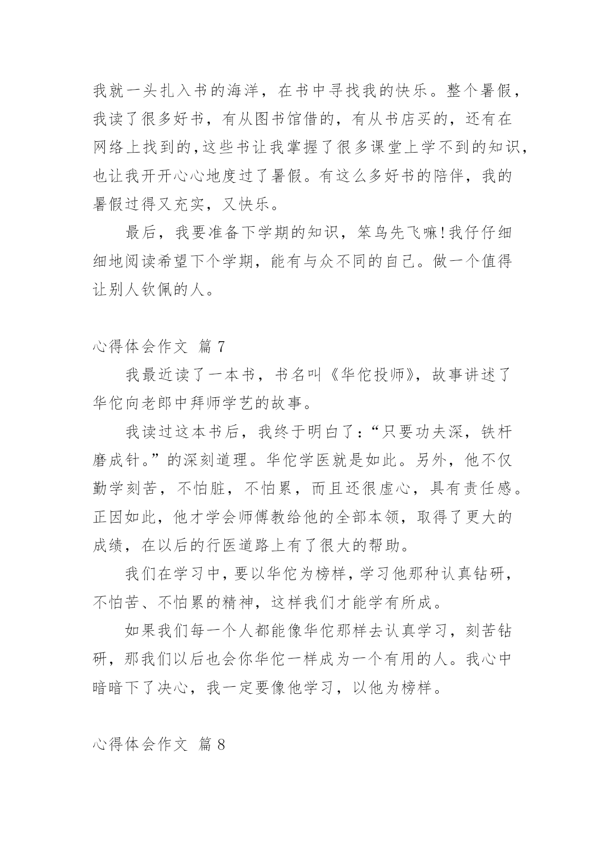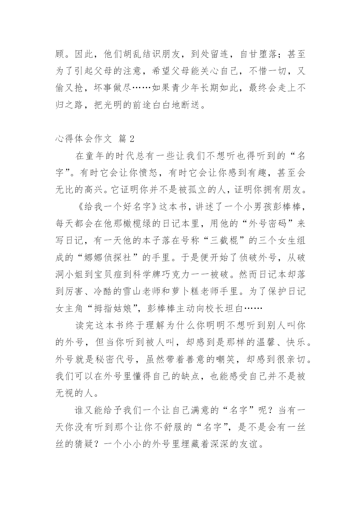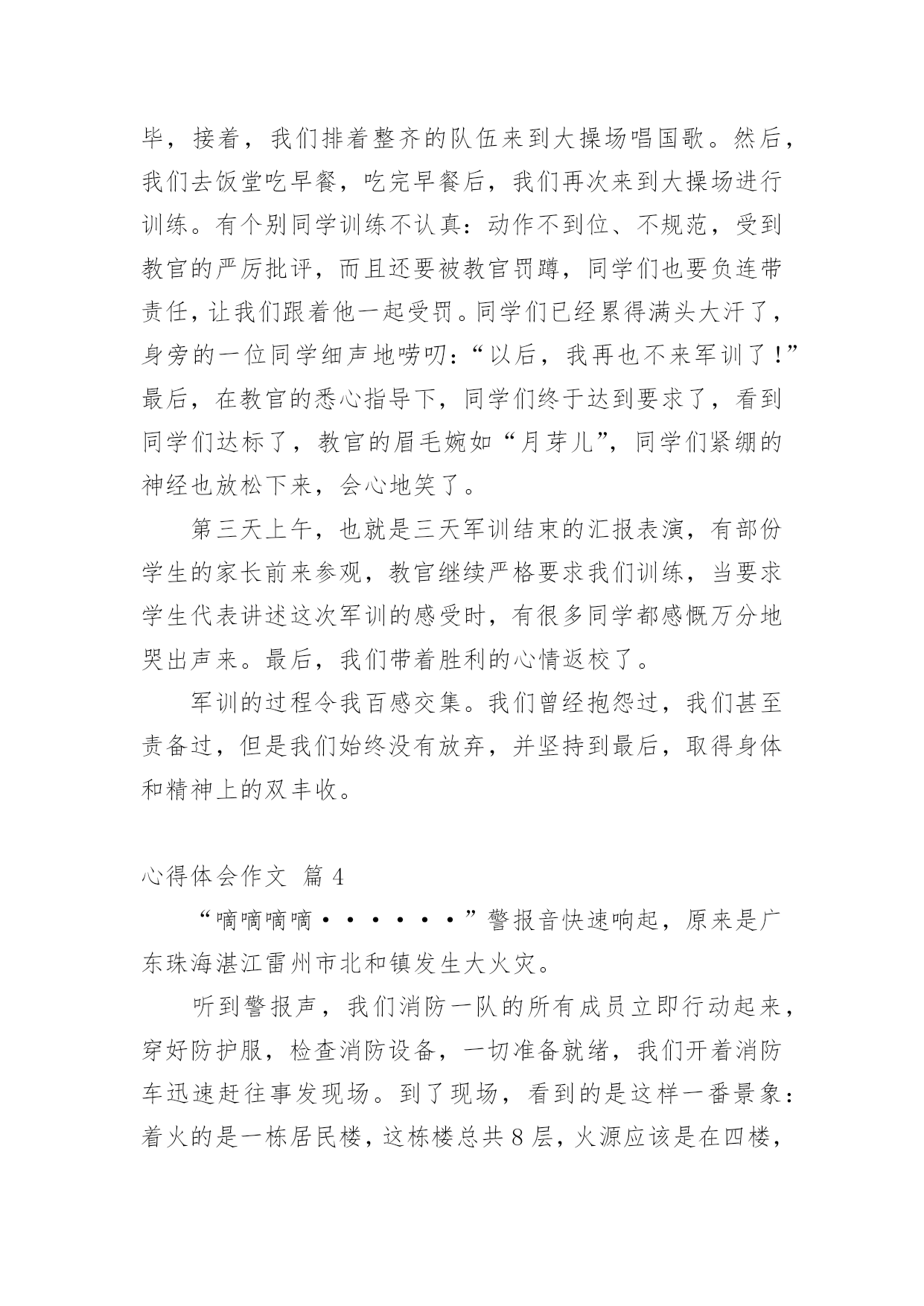 心得体会作文【精华】心得体会作文汇总8篇无论是身处学校还是步入社会,大家都经常接触到作文吧,借助作文人们可以实现文化交流的目的。你所见过的作文是什么样的呢?以下是小编收集整理的心得体会作文8篇,仅供参考,欢迎大家阅读。心得体会作文篇1随着语、数、英、政、物、化六个主科的期中考试结束的铃声打响后,迎来了一个新的旋风——有意义的法制教育课。这堂法制教育课主要是围绕导致青少年犯罪的各方面的原因展开论述。这次课题,使同学们更好地认识青少年的犯罪心理,加深了同学们对社会的了解,提高了同学们的自我防范、抵御能力。意义深刻,深入民心。家,是青少年第一个影响最深的地方,有什么事情都会直接影响到青少年的成长。有的青少年因家庭状况发生变化,觉得自己是父母的包袱,觉得父母抗拒他,不接受他,不能调节好自己的情绪。于是,借酒消愁,吸食毒品,做出一些损害自己的身体和一些匪夷所思的事情,真令人害怕;四处游荡,经常结伴到酒吧、迪士高、网吧等地方,乐而忘返,成为了逃学威龙。有的父母则忙于工作,疏忽了对子女的照顾。因此,他们胡乱结识朋友,到处留连,自甘堕落;甚至为了引起父母的注意,希望父母能关心自己,不惜一切,又偷又抢,坏事做尽……如果青少年长期如此,最终会走上不归之路,把光明的前途白白地断送。心得体会作文篇2在童年的时代总有一些让我们不想听也得听到的“名字”。有时它会让你愤怒,有时它会让你感到有趣,甚至会无比的高兴。它证明你并不是被孤立的人,证明你拥有朋友。《给我一个好名字》这本书,讲述了一个小男孩彭棒棒,每天都会在他那橄榄绿的日记本里,用他的“外号密码”来写日记,有一天他的本子落在号称“三截棍”的三个女生组成的“娜娜侦探社”的手里。于是便开始了侦破外号,从破洞小姐到宝贝痘到科学牌巧克力一一被破。然而日记本却落到厉害、冷酷的雪山老师和萝卜糕老师手里。为了保护日记女主角“拇指姑娘”,彭棒棒主动向校长坦白……读完这本书终于理解为什么你明明不想听到别人叫你的外号,但当你听到被人叫,却感到是那样的温馨、快乐。外号就是秘密代号,虽然带着善意的嘲笑,却感到很亲切。我们可以在外号里懂得自己的缺点,也能感受自己并不是被无视的人。谁又能给予我们一个让自己满意的“名字”呢?当有一天你没有听到那个让你不舒服的“名字”,是不是会有一丝丝的猜疑?一个小小的外号里埋藏着深深的友谊。心得体会作文篇3三天两晚的军训活动终于结束了。要问我对这次的军训活动有什么体会?那就是既辛苦、又刺激,更重要的是给了我一次思想和意志上的磨炼。这几天的军训时光充满着酸、甜、苦、辣。记得接到学校的军训通知时,我有一种说不出来的激动、兴奋、畏惧。军训那天早晨,教官来到我们班教室,他用那“锋利”的声音告诫同学们:到达目的地的各种约法三章的纪律。于是,我带着好奇和恐惧的心情向深圳龙岗园山出发了。到了那里,高山上一片片绿茵茵的树林展现在我眼前,仿佛到了一片“绿色的海洋”。首先,我们换上了军装,同学们立刻显得精神抖数。之后,我们投入了紧张的训练之中。第一天晚上,我和几位同学在宿舍里开“联欢晚会”,一位同学乐意地为大家讲笑话。突然,“哒哒哒!”的脚步声越来越响,一定是教官来了,大家迅速回到各自床上装睡。等到脚步声越来越远,大家又继续自己的“联欢晚会”。等到真正规定睡觉时,我觉得有点心酸,因为这是我第一次真正意义上离开自己的家,离开亲爱的妈妈,我开始想家了,想到妈妈对我的好,不过,我又想到:我现在已经长大了,不能总是依靠父母,我要学会自立生活,总有一天,我要离开父母去创造自己的生活。第二天早上,音乐声一响,我们在最短的时间内洗漱完毕,接着,我们排着整齐的队伍来到大操场唱国歌。然后,我们去饭堂吃早餐,吃完早餐后,我们再次来到大操场进行训练。有个别同学训练不认真:动作不到位、不规范,受到教官的严厉批评,而且还要被教官罚蹲,同学们也要负连带责任,让我们跟着他一起受罚。同学们已经累得满头大汗了,身旁的一位同学细声地唠叨:“以后,我再也不来军训了!”最后,在教官的悉心指导下,同学们终于达到要求了,看到同学们达标了,教官的眉毛婉如“月芽儿”,同学们紧绷的神经也放松下来,会心地笑了。第三天上午,也就是三天军训结束的汇报表演,有部份学生的家长前来参观,教官继续严格要求我们训练,当要求学生代表讲述这次军训的感受时,有很多同学都感慨万分地哭出声来。最后,我们带着胜利的心情返校了。军训的过程令我百感交集。我们曾经抱怨过,我们甚至责备过,但是我们始终没有放弃,并坚持到最后,取得身体和精神上的双丰收。心得体会作文篇4“嘀嘀嘀嘀······”警报音快速响起,原来是广东珠海湛江雷州市北和镇发生大火灾。听到警报声,我们消防一队的所有成员立即行动起来,穿好防护服,检查消防设备,一切准备就绪,我们开着消防车迅速赶往事发现场。到了现场,看到的是这样一番景象:着