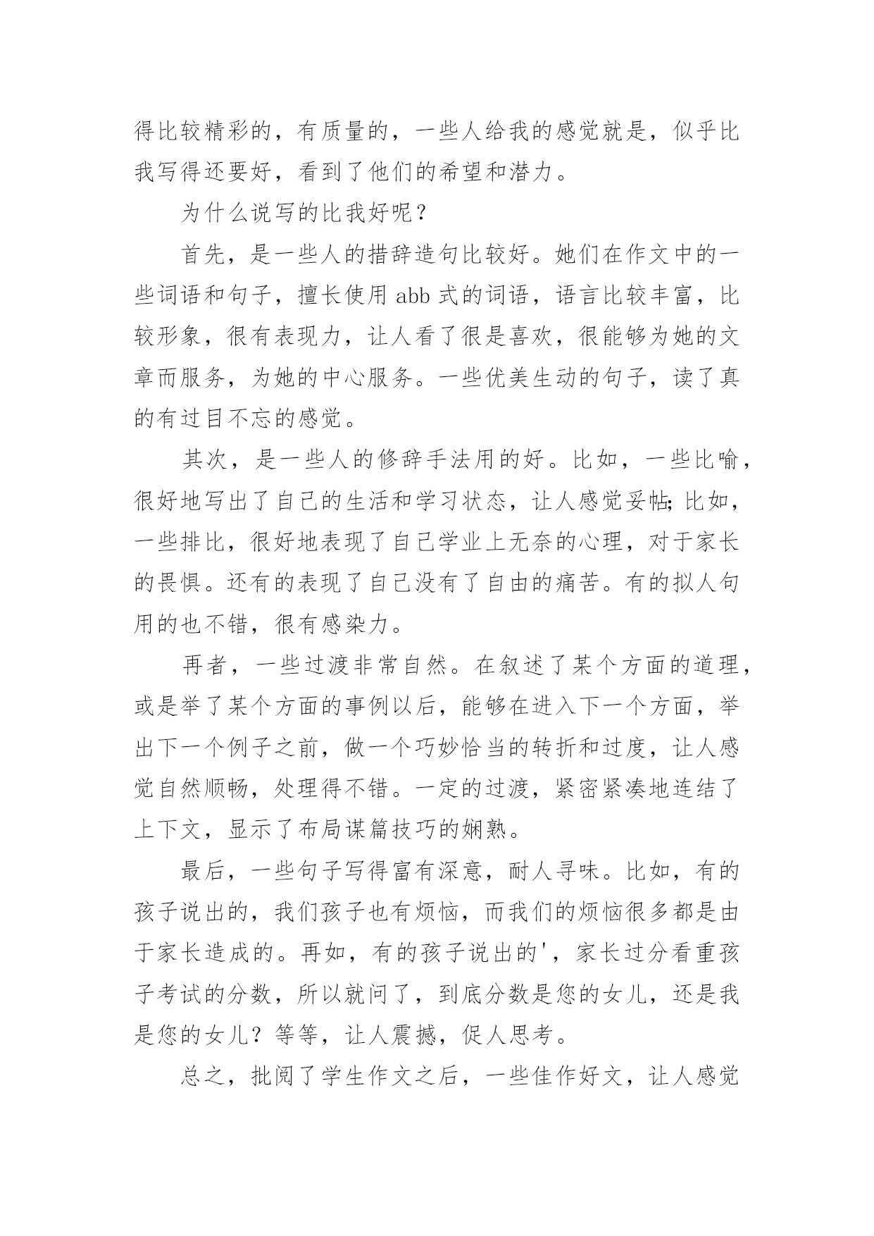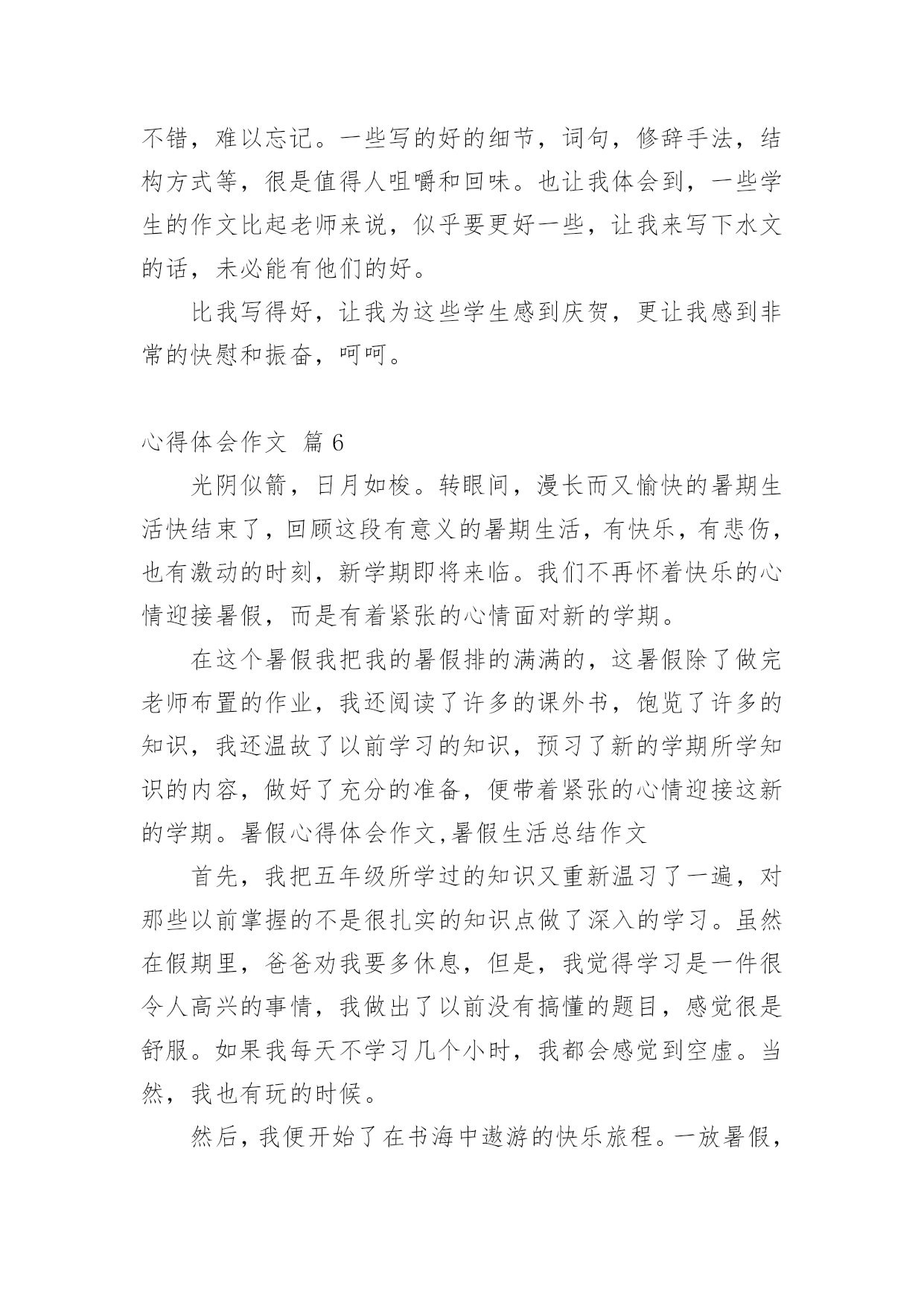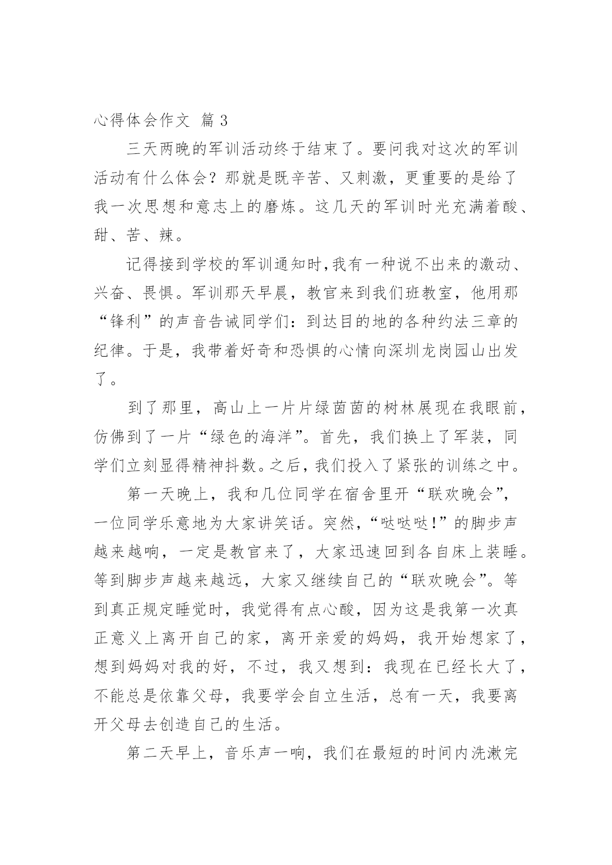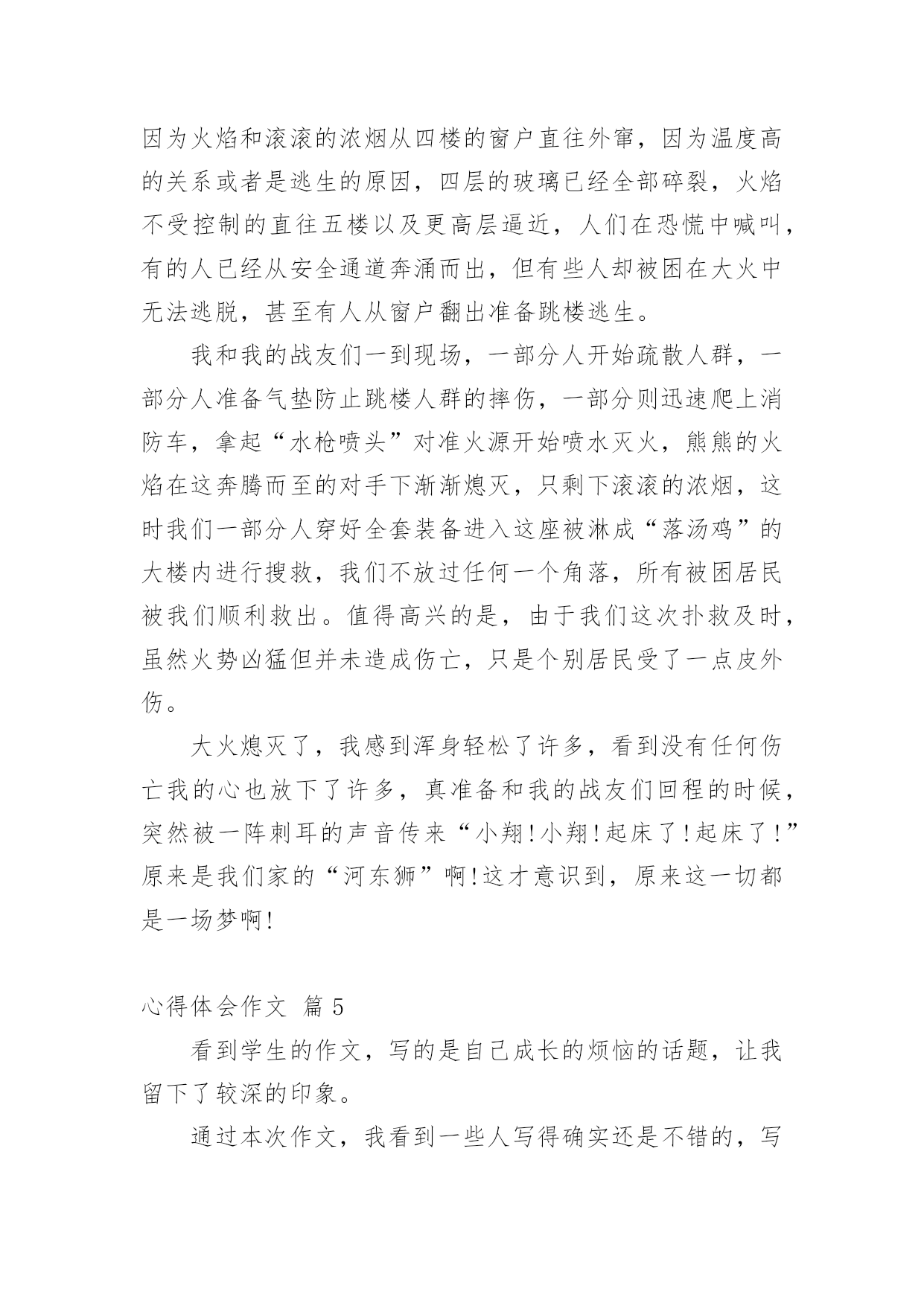 心得体会作文【精华】心得体会作文汇总8篇无论是身处学校还是步入社会,大家都经常接触到作文吧,借助作文人们可以实现文化交流的目的。你所见过的作文是什么样的呢?以下是小编收集整理的心得体会作文8篇,仅供参考,欢迎大家阅读。心得体会作文篇1随着语、数、英、政、物、化六个主科的期中考试结束的铃声打响后,迎来了一个新的旋风——有意义的法制教育课。这堂法制教育课主要是围绕导致青少年犯罪的各方面的原因展开论述。这次课题,使同学们更好地认识青少年的犯罪心理,加深了同学们对社会的了解,提高了同学们的自我防范、抵御能力。意义深刻,深入民心。家,是青少年第一个影响最深的地方,有什么事情都会直接影响到青少年的成长。有的青少年因家庭状况发生变化,觉得自己是父母的包袱,觉得父母抗拒他,不接受他,不能调节好自己的情绪。于是,借酒消愁,吸食毒品,做出一些损害自己的身体和一些匪夷所思的事情,真令人害怕;四处游荡,经常结伴到酒吧、迪士高、网吧等地方,乐而忘返,成为了逃学威龙。有的父母则忙于工作,疏忽了对子女的照顾。因此,他们胡乱结识朋友,到处留连,自甘堕落;甚至为了引起父母的注意,希望父母能关心自己,不惜一切,又偷又抢,坏事做尽……如果青少年长期如此,最终会走上不归之路,把光明的前途白白地断送。心得体会作文篇2在童年的时代总有一些让我们不想听也得听到的“名字”。有时它会让你愤怒,有时它会让你感到有趣,甚至会无比的高兴。它证明你并不是被孤立的人,证明你拥有朋友。《给我一个好名字》这本书,讲述了一个小男孩彭棒棒,每天都会在他那橄榄绿的日记本里,用他的“外号密码”来写日记,有一天他的本子落在号称“三截棍”的三个女生组成的“娜娜侦探社”的手里。于是便开始了侦破外号,从破洞小姐到宝贝痘到科学牌巧克力一一被破。然而日记本却落到厉害、冷酷的雪山老师和萝卜糕老师手里。为了保护日记女主角“拇指姑娘”,彭棒棒主动向校长坦白……读完这本书终于理解为什么你明明不想听到别人叫你的外号,但当你听到被人叫,却感到是那样的温馨、快乐。外号就是秘密代号,虽然带着善意的嘲笑,却感到很亲切。我们可以在外号里懂得自己的缺点,也能感受自己并不是被无视的人。谁又能给予我们一个让自己满意的“名字”呢?当有一天你没有听到那个让你不舒服的“名字”,是不是会有一丝丝的猜疑?一个小小的外号里埋藏着深深的友谊。心得体会作文篇3三天两晚的军训活动终于结束了。要问我对这次的军训活动有什么体会?那就是既辛苦、又刺激,更重要的是给了我一次思想和意志上的磨炼。这几天的军训时光充满着酸、甜、苦、辣。记得接到学校的军训通知时,我有一种说不出来的激动、兴奋、畏惧。军训那天早晨,教官来到我们班教室,他用那“锋利”的声音告诫同学们:到达目的地的各种约法三章的纪律。于是,我带着好奇和恐惧的心情向深圳龙岗园山出发了。到了那里,高山上一片片绿茵茵的树林展现在我眼前,仿佛到了一片“绿色的海洋”。首先,我们换上了军装,同学们立刻显得精神抖数。之后,我们投入了紧张的训练之中。第一天晚上,我和几位同学在宿舍里开“联欢晚会”,一位同学乐意地为大家讲笑话。突然,“哒哒哒!”的脚步声越来越响,一定是教官来了,大家迅速回到各自床上装睡。等到脚步声越来越远,大家又继续自己的“联欢晚会”。等到真正规定睡觉时,我觉得有点心酸,因为这是我第一次真正意义上离开自己的家,离开亲爱的妈妈,我开始想家了,想到妈妈对我的好,不过,我又想到:我现在已经长大了,不能总是依靠父母,我要学会自立生活,总有一天,我要离开父母去创造自己的生活。第二天早上,音乐声一响,我们在最短的时间内洗漱完毕,接着,我们排着整齐的队伍来到大操场唱国歌。然后,我们去饭堂吃早餐,吃完早餐后,我们再次来到大操场进行训练。有个别同学训练不认真:动作不到位、不规范,受到教官的严厉批评,而且还要被教官罚蹲,同学们也要负连带责任,让我们跟着他一起受罚。同学们已经累得满头大汗了,身旁的一位同学细声地唠叨:“以后,我再也不来军训了!”最后,在教官的悉心指导下,同学们终于达到要求了,看到同学们达标了,教官的眉毛婉如“月芽儿”,同学们紧绷的神经也放松下来,会心地笑了。第三天上午,也就是三天军训结束的汇报表演,有部份学生的家长前来参观,教官继续严格要求我们训练,当要求学生代表讲述这次军训的感受时,有很多同学都感慨万分地哭出声来。最后,我们带着胜利的心情返校了。军训的过程令我百感交集。我们曾经抱怨过,我们甚至责备过,但是我们始终没有放弃,并坚持到最后,取得身体和精神上的双丰收。心得体会作文篇4“嘀嘀嘀嘀······”警报音快速响起,原来是广东珠海湛江雷州市北和镇发生大火灾。听到警报声,我们消防一队的所有成员立即行动起来,穿好防护服,检查消防设备,一切准备就绪,我们开着消防车迅速赶往事发现场。到了现场,看到的是这样一番景象:着