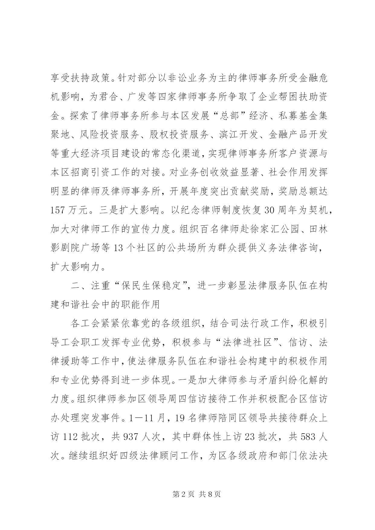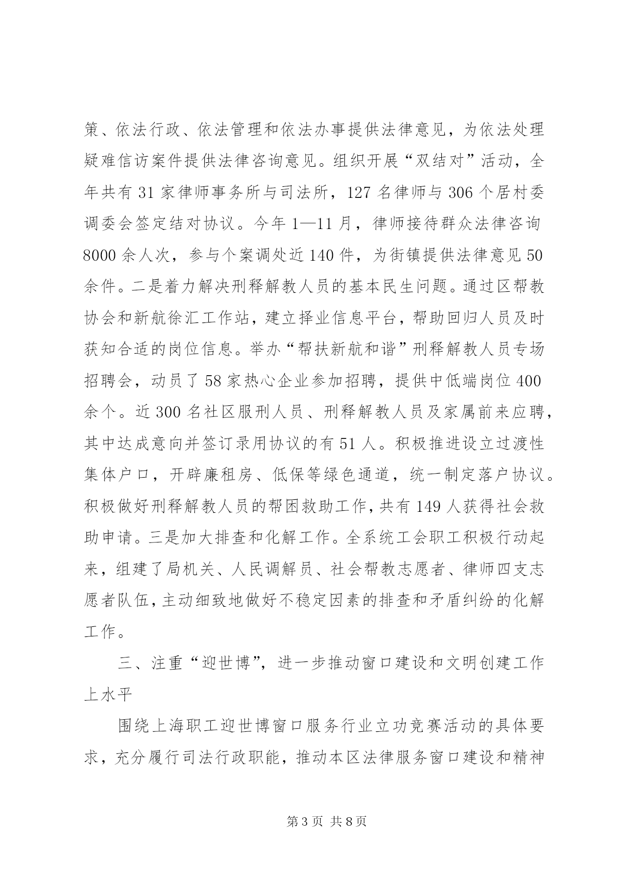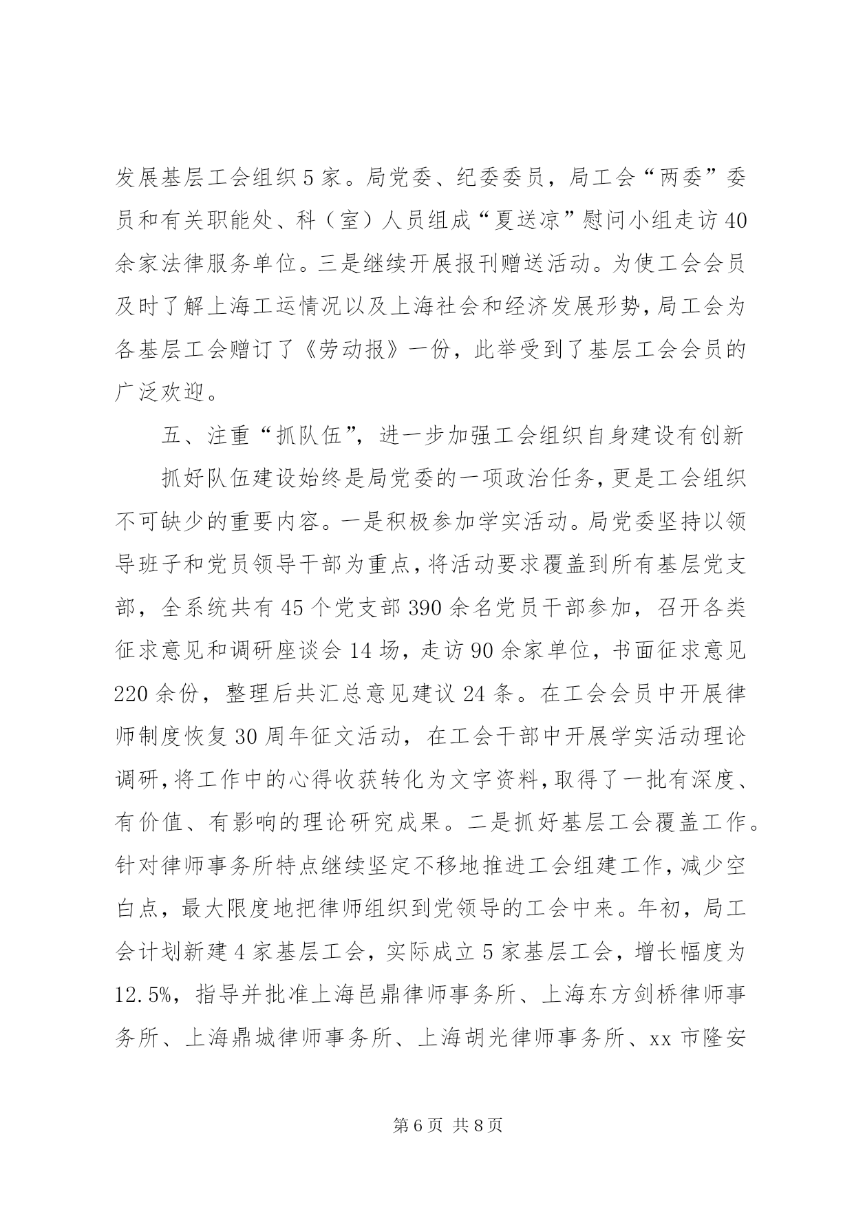 第PAGE\*Arabic\*MERGEFORMAT8页共NUMPAGES\*MERGEFORMAT8页司法局工会工作总结2009年,xx区司法局工会在局党委和区总工会的正确领导下,以开展学习实践科学发展观活动为契机,以推进“迎世博”立功竞赛活动为抓手,聚焦“四个确保”,紧紧围绕区委、区府的中心工作,按照区总工会的总体要求,依法履行工会职责,坚持把学实活动与工作有机结合起来,并结合形势和自身工作特点,积极开展各项活动,工会组织活力不断增强,充分发挥了工会组织凝聚力作用,有效激发了广大工会职工做好法律服务工作的积极性。一、注重“保增长”,进一步提升法律服务业对区域经济发展的贡献度针对年初严峻的经济形势,局工会及时组织引导广大工会干部和职工群众认真学习中央领导的重要讲话及工会十五大工作报告,深刻认识工人阶级承担的历史使命,增强信心,同舟共济,形成共识,效果显现。一是服务发展。截至11月底,我区共有律师事务所103家,执业律师1205人,提前完成《xx区2006—2010年律师发展纲要》确定的发展目标。1-11月,各律师事务所共办理各类案件2.05万件,创收3.9亿元,实现税收5000余万元,同比增长7.4%。1-11月,公证处共办理各类公证案件24496万件,创收约2894万元。二是保障发展。在局工会的推动下,继续做好对律师事务所的财政扶持,全区共有57家律师事务所享受扶持政策。针对部分以非讼业务为主的律师事务所受金融危机影响,为君合、广发等四家律师事务所争取了企业帮困扶助资金。探索了律师事务所参与本区发展“总部”经济、私募基金集聚地、风险投资服务、股权投资服务、滨江开发、金融产品开发等重大经济项目建设的常态化渠道,实现律师事务所客户资源与本区招商引资工作的对接。对业务创收效益显著、社会作用发挥明显的律师及律师事务所,开展年度突出贡献奖励,奖励总额达157万元。三是扩大影响。以纪念律师制度恢复30周年为契机,加大对律师工作的宣传力度。组织百名律师赴徐家汇公园、田林影剧院广场等13个社区的公共场所为群众提供义务法律咨询,扩大影响力。二、注重“保民生保稳定”,进一步彰显法律服务队伍在构建和谐社会中的职能作用各工会紧紧依靠党的各级组织,结合司法行政工作,积极引导工会职工发挥专业优势,积极参与“法律进社区”、信访、法律援助等工作中,使法律服务队伍在和谐社会构建中的积极作用和专业优势得到进一步体现。一是加大律师参与矛盾纠纷化解的力度。组织律师参加区领导周四信访接待工作并积极配合区信访办处理突发事件。1-11月,19名律师陪同区领导共接待群众上访112批次,共937人次,其中群体性上访23批次,共583人次。继续组织好四级法律顾问工作,为区各级政府和部门依法决策、依法行政、依法管理和依法办事提供法律意见,为依法处理疑难信访案件提供法律咨询意见。组织开展“双结对”活动,全年共有31家律师事务所与司法所,127名律师与306个居村委调委会签定结对协议。今年1—11月,律师接待群众法律咨询8000余人次,参与个案调处近140件,为街镇提供法律意见50余件。二是着力解决刑释解教人员的基本民生问题。通过区帮教协会和新航徐汇工作站,建立择业信息平台,帮助回归人员及时获知合适的岗位信息。举办“帮扶新航和谐”刑释解教人员专场招聘会,动员了58家热心企业参加招聘,提供中低端岗位400余个。近300名社区服刑人员、刑释解教人员及家属前来应聘,其中达成意向并签订录用协议的有51人。积极推进设立过渡性集体户口,开辟廉租房、低保等绿色通道,统一制定落户协议。积极做好刑释解教人员的帮困救助工作,共有149人获得社会救助申请。三是加大排查和化解工作。全系统工会职工积极行动起来,组建了局机关、人民调解员、社会帮教志愿者、律师四支志愿者队伍,主动细致地做好不稳定因素的排查和矛盾纠纷的化解工作。三、注重“迎世博”,进一步推动窗口建设和文明创建工作上水平围绕上海职工迎世博窗口服务行业立功竞赛活动的具体要求,充分履行司法行政职能,推动本区法律服务窗口建设和精神文明创建工作上水平。一是开展立功竞赛。在全区法律服务行业中开展“迎世博”立功竞赛活动和迎世博培训测试活动,并于6月底评选出本系统上半年度集体奖项12家、个人奖项23名。徐汇公证处在办公场所紧张、办公条件比较困难的情况下,将公证处环境最好、朝向最好的办公室腾出来作为群众接待受理大厅,对xx区范围内行动不便的当事人推出上门服务项目和双休息日安排一天时间接待当事人等便民举措。建立窗口接待应急疏导机制,将公证处主任的手机与座机联通,确保随时都能接听到当事人的投诉或咨询。区法律援助中心设立农民工欠薪欠保案件专项接待咨询窗口,成立迎世博法律援助志愿团,推出“5+1”窗口接待日。开展“xx区法律援助示范联络点”活动