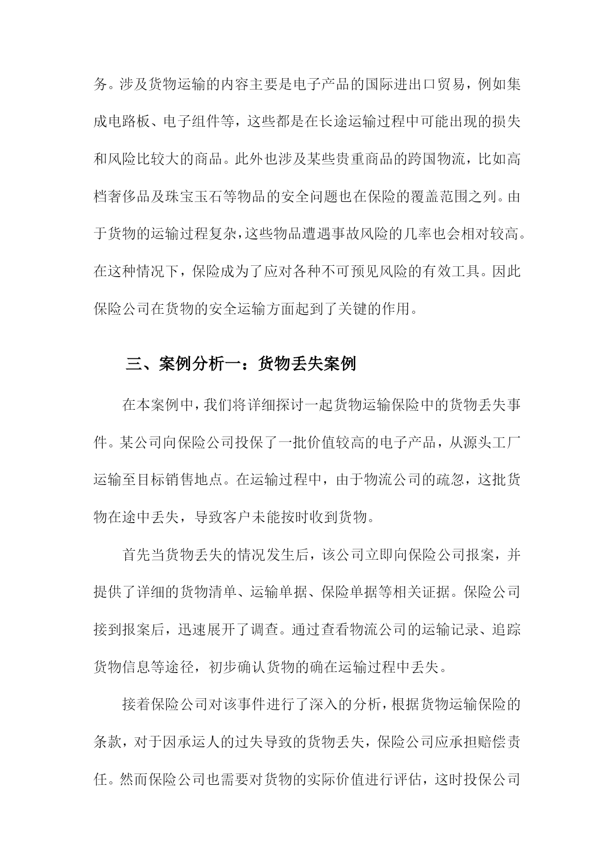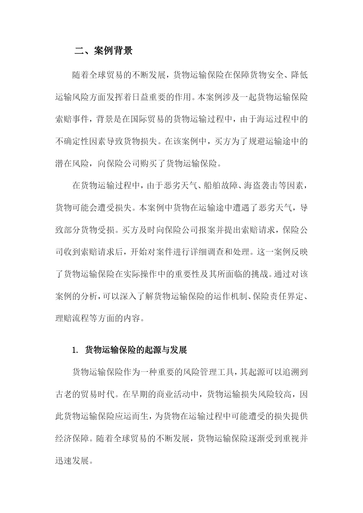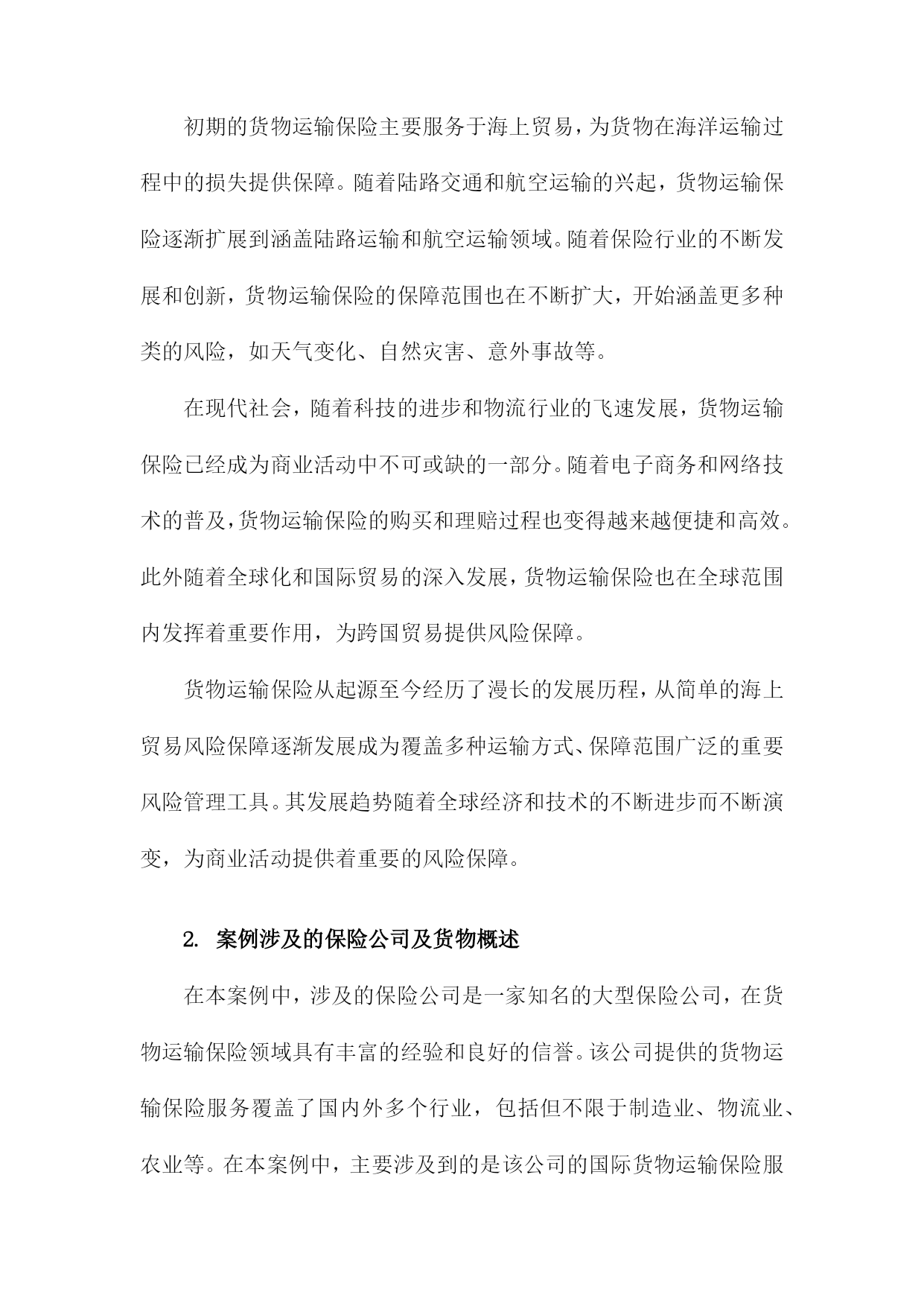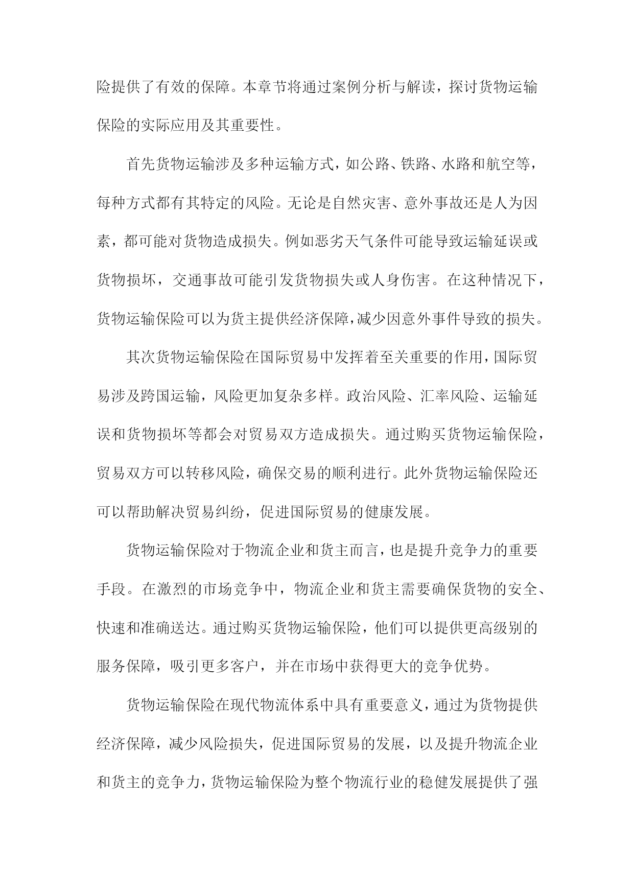 货物运输保险案例分析一、内容概括本文将详细分析一个货物运输保险案例,主要探讨涉及货物运输保险的基本概念和重要性、保险合同的细节解读、保险索赔与理赔过程以及可能遇到的法律问题和争议解决机制。文章首先介绍了案例的背景,包括货物运输的起点和终点、货物种类及价值等基本情况。接着阐述了保险购买的过程以及保险合同的主要内容,包括保险责任、赔偿限额、除外责任等关键条款。然后重点分析了保险事件发生后,被保险人如何进行保险索赔,保险公司如何展开理赔工作,包括理赔程序、理赔标准以及可能遇到的拒赔情况。此外文章还深入探讨了案例中可能出现的法律问题和争议解决机制,如保险合同纠纷、保险欺诈等风险的防范与处理措施。总结了本次案例分析的主要观点和启示,强调了货物运输保险在保障货物安全、降低运输风险方面的重要作用。通过本次案例分析,读者可以更好地了解货物运输保险的运作机制及其在实际运输中的重要性。1.介绍货物运输保险的重要性在现代物流体系中,货物运输保险的重要性不容忽视。货物运输保险作为一种风险管理工具,为货物在运输过程中可能遭遇的各种风险提供了有效的保障。本章节将通过案例分析与解读,探讨货物运输保险的实际应用及其重要性。首先货物运输涉及多种运输方式,如公路、铁路、水路和航空等,每种方式都有其特定的风险。无论是自然灾害、意外事故还是人为因素,都可能对货物造成损失。例如恶劣天气条件可能导致运输延误或货物损坏,交通事故可能引发货物损失或人身伤害。在这种情况下,货物运输保险可以为货主提供经济保障,减少因意外事件导致的损失。其次货物运输保险在国际贸易中发挥着至关重要的作用,国际贸易涉及跨国运输,风险更加复杂多样。政治风险、汇率风险、运输延误和货物损坏等都会对贸易双方造成损失。通过购买货物运输保险,贸易双方可以转移风险,确保交易的顺利进行。此外货物运输保险还可以帮助解决贸易纠纷,促进国际贸易的健康发展。货物运输保险对于物流企业和货主而言,也是提升竞争力的重要手段。在激烈的市场竞争中,物流企业和货主需要确保货物的安全、快速和准确送达。通过购买货物运输保险,他们可以提供更高级别的服务保障,吸引更多客户,并在市场中获得更大的竞争优势。货物运输保险在现代物流体系中具有重要意义,通过为货物提供经济保障,减少风险损失,促进国际贸易的发展,以及提升物流企业和货主的竞争力,货物运输保险为整个物流行业的稳健发展提供了强有力的支持。在接下来的案例分析中,我们将进一步探讨货物运输保险的实际应用及其效果。2.阐述案例分析的目的和意义在货物运输保险领域进行案例分析具有重要的理论与实践意义。首先案例分析的目的在于通过具体情境的深入剖析,揭示货物运输保险运作过程中的关键问题和解决方案,从而为从业人员提供实际操作中的参考与指导。通过对实际案例的细致研究,我们可以更直观地理解保险条款在实际场景中的应用,以及面对风险时如何采取有效措施。此外案例分析还能帮助我们总结经验和教训,发现现有流程或制度中的不足,为优化和改进提供有力依据。其次案例分析的意义在于其现实性和针对性,随着全球贸易的不断发展,货物运输风险日益多样化和复杂化,如何合理规避风险、保障货物安全成为业界关注的焦点。通过案例分析,我们可以更加准确地把握市场趋势和行业需求,深入理解货物运输保险在物流链条中的重要作用。同时案例分析也有助于提升行业人员的专业素养和风险管理能力,为行业的健康稳定发展提供支撑。通过这样的研究与分析,我们不仅能够丰富保险领域的理论体系,而且能够为实践提供有力的指导,推动货物运输保险行业的持续进步与发展。二、案例背景随着全球贸易的不断发展,货物运输保险在保障货物安全、降低运输风险方面发挥着日益重要的作用。本案例涉及一起货物运输保险索赔事件,背景是在国际贸易的货物运输过程中,由于海运过程中的不确定性因素导致货物损失。在该案例中,买方为了规避运输途中的潜在风险,向保险公司购买了货物运输保险。在货物运输过程中,由于恶劣天气、船舶故障、海盗袭击等因素,货物可能会遭受损失。本案例中货物在运输途中遭遇了恶劣天气,导致部分货物受损。买方及时向保险公司报案并提出索赔请求,保险公司收到索赔请求后,开始对案件进行详细调查和处理。这一案例反映了货物运输保险在实际操作中的重要性及其所面临的挑战。通过对该案例的分析,可以深入了解货物运输保险的运作机制、保险责任界定、理赔流程等方面的内容。1.货物运输保险的起源与发展货物运输保险作为一种重要的风险管理工具,其起源可以追溯到古老的贸易时代。在早期的商业活动中,货物运输损失风险较高,因此货物运输保险应运而生,为货物在运输过程中可能遭受的损失提供经济保障。随着全球贸易的不断发展,货物运输保险逐渐受到重视并迅速发展。初期的货物运输保险主要服务于海上贸易,为货物在海洋运输过程中的损失