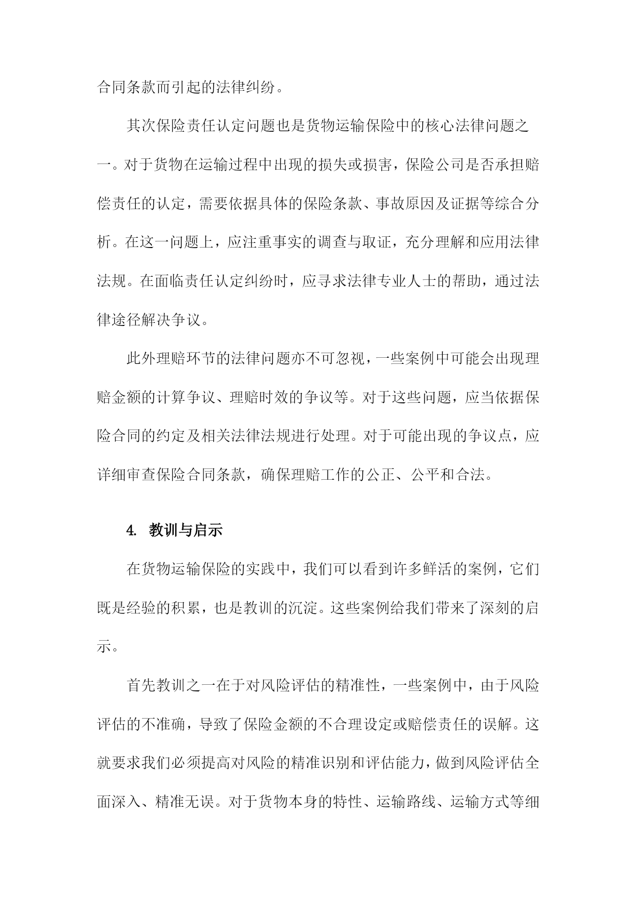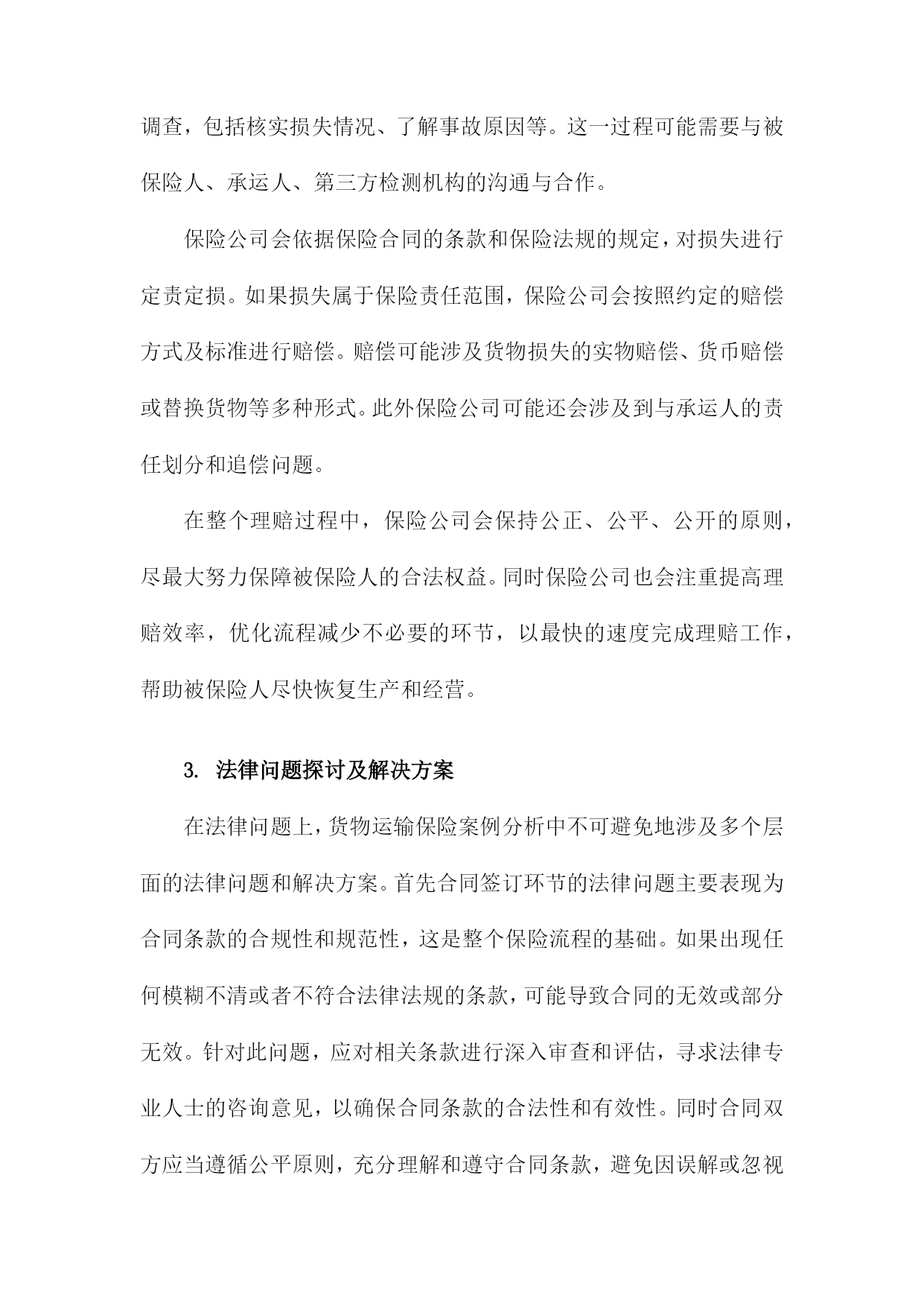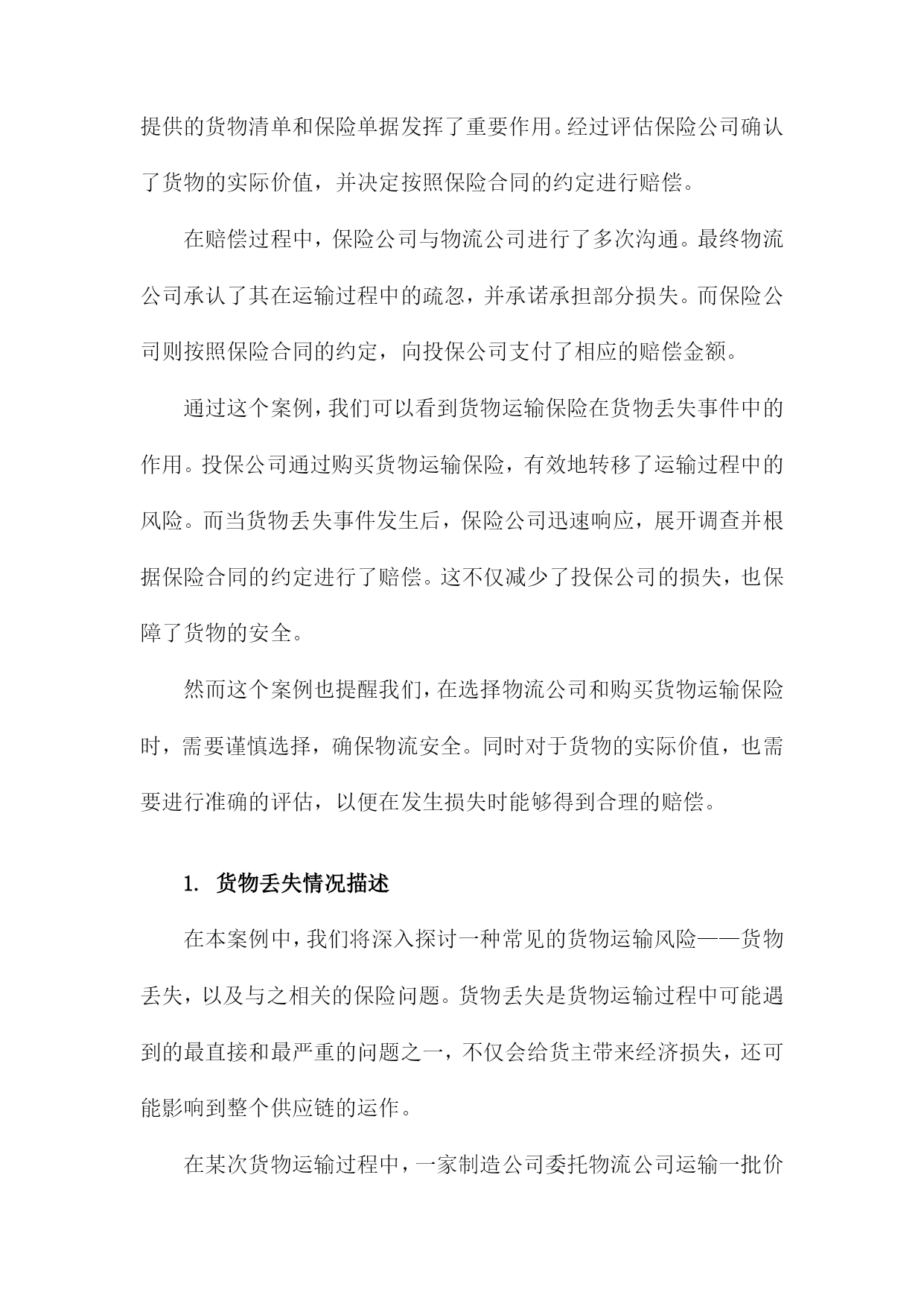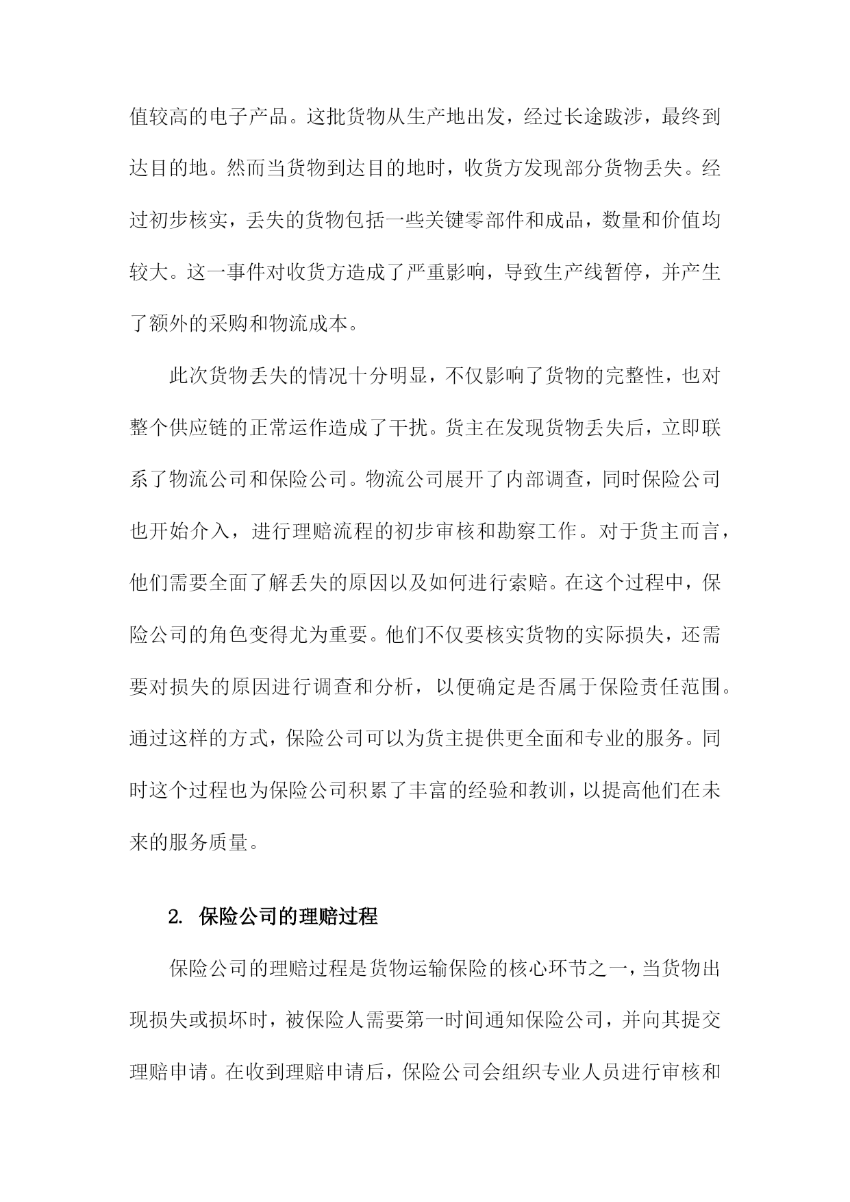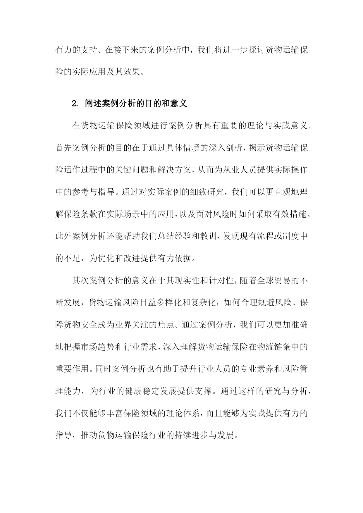 货物运输保险案例分析一、内容概括本文将详细分析一个货物运输保险案例,主要探讨涉及货物运输保险的基本概念和重要性、保险合同的细节解读、保险索赔与理赔过程以及可能遇到的法律问题和争议解决机制。文章首先介绍了案例的背景,包括货物运输的起点和终点、货物种类及价值等基本情况。接着阐述了保险购买的过程以及保险合同的主要内容,包括保险责任、赔偿限额、除外责任等关键条款。然后重点分析了保险事件发生后,被保险人如何进行保险索赔,保险公司如何展开理赔工作,包括理赔程序、理赔标准以及可能遇到的拒赔情况。此外文章还深入探讨了案例中可能出现的法律问题和争议解决机制,如保险合同纠纷、保险欺诈等风险的防范与处理措施。总结了本次案例分析的主要观点和启示,强调了货物运输保险在保障货物安全、降低运输风险方面的重要作用。通过本次案例分析,读者可以更好地了解货物运输保险的运作机制及其在实际运输中的重要性。1.介绍货物运输保险的重要性在现代物流体系中,货物运输保险的重要性不容忽视。货物运输保险作为一种风险管理工具,为货物在运输过程中可能遭遇的各种风险提供了有效的保障。本章节将通过案例分析与解读,探讨货物运输保险的实际应用及其重要性。首先货物运输涉及多种运输方式,如公路、铁路、水路和航空等,每种方式都有其特定的风险。无论是自然灾害、意外事故还是人为因素,都可能对货物造成损失。例如恶劣天气条件可能导致运输延误或货物损坏,交通事故可能引发货物损失或人身伤害。在这种情况下,货物运输保险可以为货主提供经济保障,减少因意外事件导致的损失。其次货物运输保险在国际贸易中发挥着至关重要的作用,国际贸易涉及跨国运输,风险更加复杂多样。政治风险、汇率风险、运输延误和货物损坏等都会对贸易双方造成损失。通过购买货物运输保险,贸易双方可以转移风险,确保交易的顺利进行。此外货物运输保险还可以帮助解决贸易纠纷,促进国际贸易的健康发展。货物运输保险对于物流企业和货主而言,也是提升竞争力的重要手段。在激烈的市场竞争中,物流企业和货主需要确保货物的安全、快速和准确送达。通过购买货物运输保险,他们可以提供更高级别的服务保障,吸引更多客户,并在市场中获得更大的竞争优势。货物运输保险在现代物流体系中具有重要意义,通过为货物提供经济保障,减少风险损失,促进国际贸易的发展,以及提升物流企业和货主的竞争力,货物运输保险为整个物流行业的稳健发展提供了强有力的支持。在接下来的案例分析中,我们将进一步探讨货物运输保险的实际应用及其效果。2.阐述案例分析的目的和意义在货物运输保险领域进行案例分析具有重要的理论与实践意义。首先案例分析的目的在于通过具体情境的深入剖析,揭示货物运输保险运作过程中的关键问题和解决方案,从而为从业人员提供实际操作中的参考与指导。通过对实际案例的细致研究,我们可以更直观地理解保险条款在实际场景中的应用,以及面对风险时如何采取有效措施。此外案例分析还能帮助我们总结经验和教训,发现现有流程或制度中的不足,为优化和改进提供有力依据。其次案例分析的意义在于其现实性和针对性,随着全球贸易的不断发展,货物运输风险日益多样化和复杂化,如何合理规避风险、保障货物安全成为业界关注的焦点。通过案例分析,我们可以更加准确地把握市场趋势和行业需求,深入理解货物运输保险在物流链条中的重要作用。同时案例分析也有助于提升行业人员的专业素养和风险管理能力,为行业的健康稳定发展提供支撑。通过这样的研究与分析,我们不仅能够丰富保险领域的理论体系,而且能够为实践提供有力的指导,推动货物运输保险行业的持续进步与发展。二、案例背景随着全球贸易的不断发展,货物运输保险在保障货物安全、降低运输风险方面发挥着日益重要的作用。本案例涉及一起货物运输保险索赔事件,背景是在国际贸易的货物运输过程中,由于海运过程中的不确定性因素导致货物损失。在该案例中,买方为了规避运输途中的潜在风险,向保险公司购买了货物运输保险。在货物运输过程中,由于恶劣天气、船舶故障、海盗袭击等因素,货物可能会遭受损失。本案例中货物在运输途中遭遇了恶劣天气,导致部分货物受损。买方及时向保险公司报案并提出索赔请求,保险公司收到索赔请求后,开始对案件进行详细调查和处理。这一案例反映了货物运输保险在实际操作中的重要性及其所面临的挑战。通过对该案例的分析,可以深入了解货物运输保险的运作机制、保险责任界定、理赔流程等方面的内容。1.货物运输保险的起源与发展货物运输保险作为一种重要的风险管理工具,其起源可以追溯到古老的贸易时代。在早期的商业活动中,货物运输损失风险较高,因此货物运输保险应运而生,为货物在运输过程中可能遭受的损失提供经济保障。随着全球贸易的不断发展,货物运输保险逐渐受到重视并迅速发展。初期的货物运输保险主要服务于海上贸易,为货物在海洋运输过程中的损失