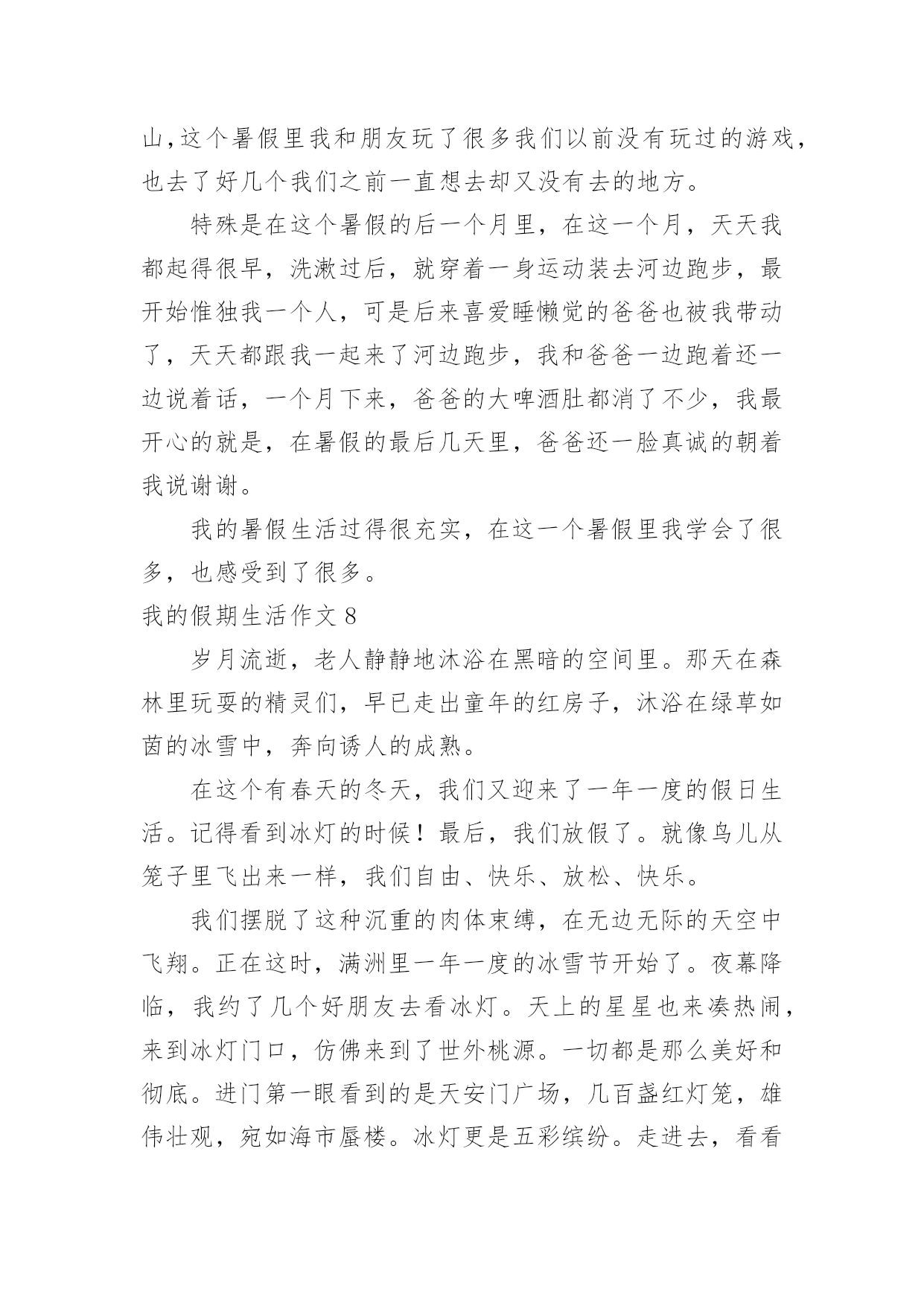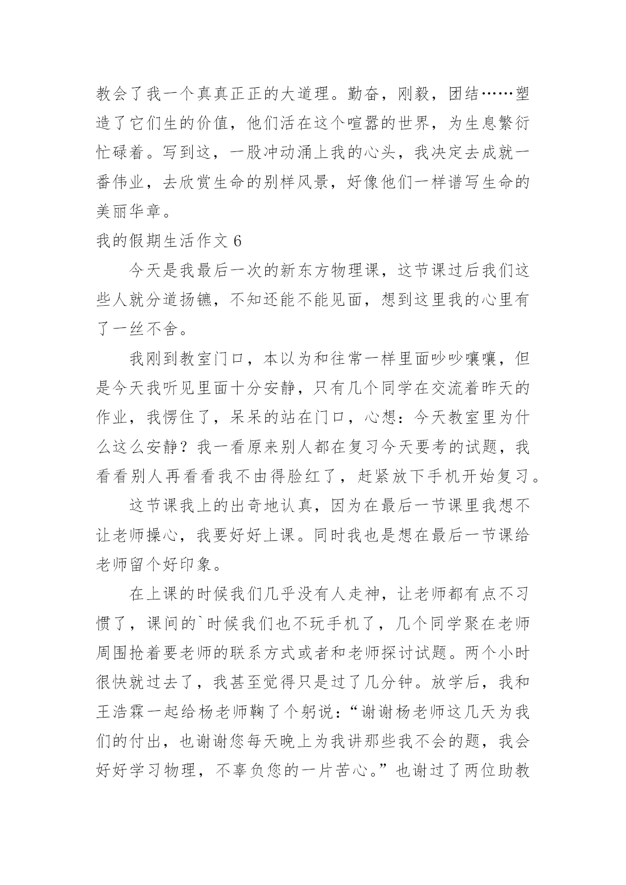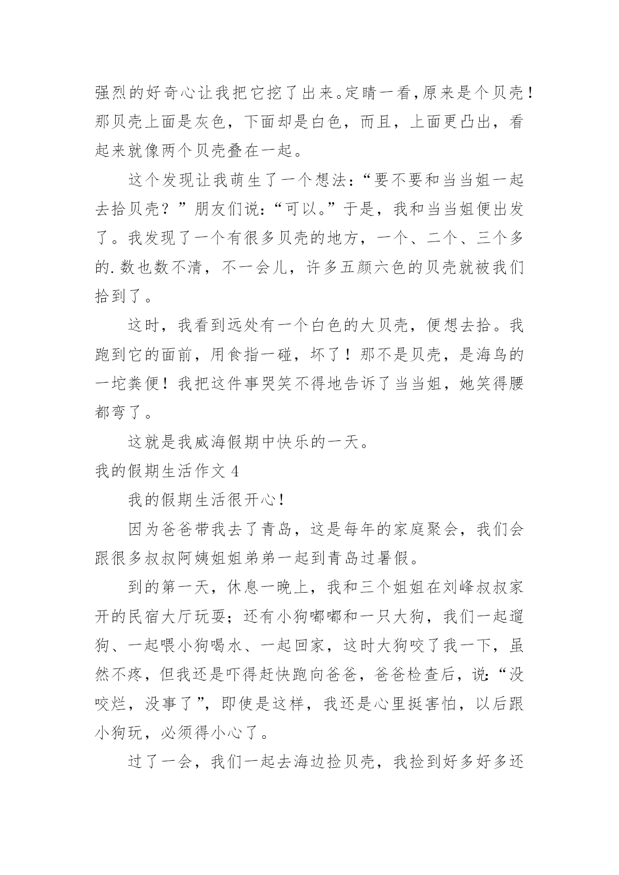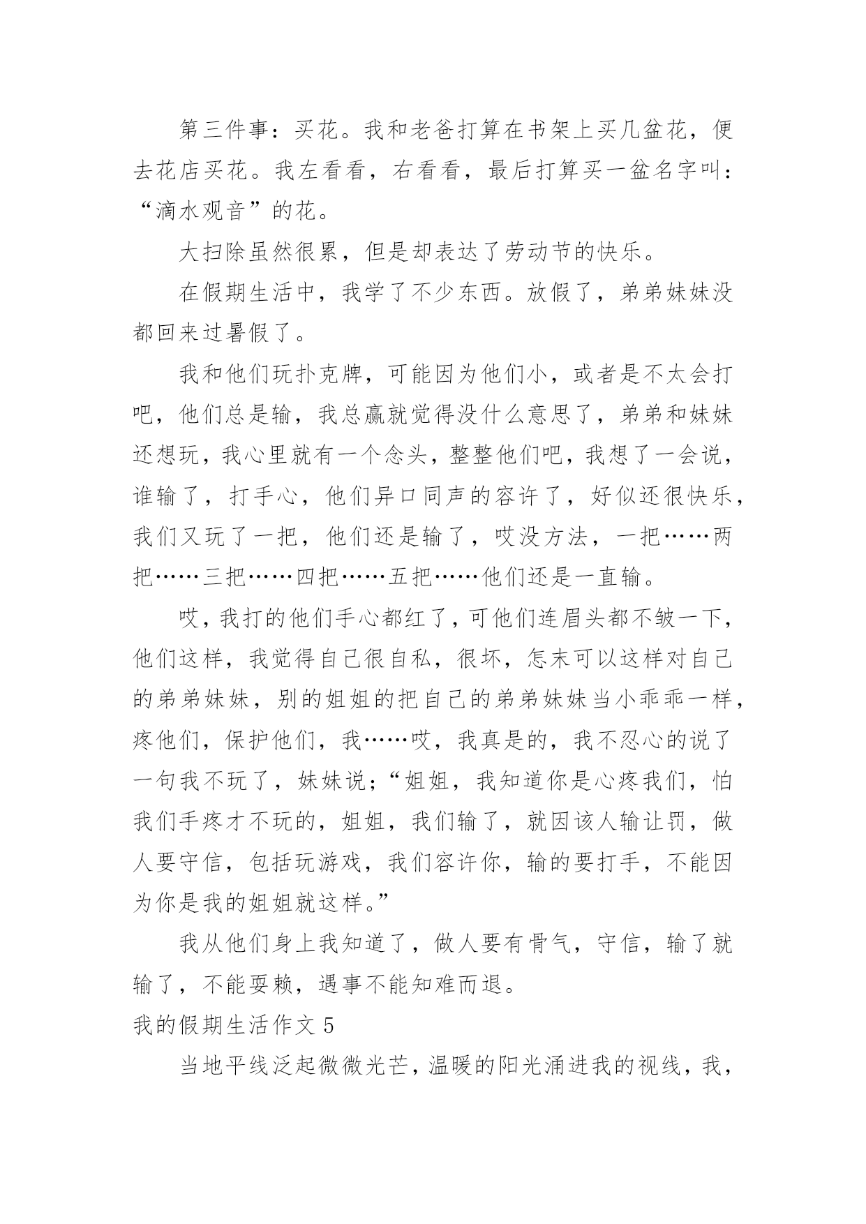 我的假期生活作文我的假期生活作文在平平淡淡的日常中,大家都经常看到作文的身影吧,作文一定要做到主题集中,围绕同一主题作深入阐述,切忌东拉西扯,主题涣散甚至无主题。那么,怎么去写作文呢?下面是小编为大家收集的我的假期生活作文,欢迎阅读与收藏。我的假期生活作文1长假终于到了,同时也意味着快乐即将到来。坐在家中的平台上望着外面。想想自己,默默感受着时间的流逝,转眼间离已与小学同学一年多不见了,回想起在一起的五个春夏秋冬,心中涌起一种思念一种回忆,老同学们现在都怎么样了?这时电话打断了我的思绪,“好久不见”,这不是姚笙的声音吗?“你怎么样了”他故作沉默,随后说道“明天来学校门口,同学聚会,记着要来啊”我当然答应了他的要求。晚上我夜不能寐,想起小学的好哥们,好同桌,以及老师,心中就激动不已,我恨不得这漫长的夜晚快快过去。终于到了早晨,我走在去学校的路上,回忆起离别时的情形,那种破别重逢的'感觉很难用语言形容。到了,我脸上浮现出微笑,这不是阿张吗?我们彼此问了问对方的情况。那时的调皮鬼今日变得如此腼腆,是不是遇到比他还调皮的对手了?夕日的老师,今天变得特别温和,问长问短的,仿佛要把她不知道的全部问清楚。随后,姚笙带领我们去公园玩,我们几个聚在一起,回忆往事,各自发表了讲话,多才多艺的人还向我们表现了自己的最新成果,看他跳的街舞那么帅,那么有型。吃着零食,谈着话题,看着表演,这真是人间最美的事啊。看,那不爱唱歌的老师也忍不住唱两嗓子,我们当然给予的是掌声。这时老师发言了:“孩子们,老师想你们了,老师现在接了一个三年纪的班,看着他们我就想起了你们,想起了你们那时的童稚,你们的点点滴滴,更让我回忆。”接着老师又告诉我们他现在这届学生的事,我们听的都很认真。老同桌也来了,她向我讲述她的同桌,原来比我以前还调皮,比我以前还调皮呢。不知不觉太阳已经落山了,我真希望那是不落的太阳,一次重逢就意味着将要离别,我相信不久我们还会拿着录取通知书,在这个公园的这一处再见。为了我们的承诺,我们将用行动去证明。我的假期生活作文2期间由于非典,学校都放假了,我只能在家享受无聊的假期。虽然是放假,但是比不放假更无聊。因为SARS是一种随时可以传播的传染病,让人恐慌。写作业,在家玩电脑是我的工作。每天过着同样的生活,无聊到和有同感的同伴出去打羽毛球嬉闹,放松了紧张的神经。有时候真的很想时光倒流,回到没有非典的'时候。那样的话,我也不会像整天呆在监狱里那样无聊,至少可以和同学一起玩。我天生是个快乐的人。我没有烦恼,也没有让我生气的事。我可以在这个无聊的假期里呆两天,我的快乐会消失,我的烦恼会立刻到来。就算把满汉全席摆在面前也提不起胃口。如果我能用一个词形容我的假期生活,那么这个词就是无聊,如果是两个词就是无聊,如果是三个词就是无聊。反正总跟无聊有关系。以今天为例。早上起床,吃早饭,洗脸,梳头,下楼去小杨家拿东西,不到三分钟又上楼,写作业,中午,爸妈回来,吃午饭,写日记,玩电脑,吃饭,看电视,睡觉。一天过去了,然后无聊就过去了。有时候让我觉得时间过得很快,但现在让我觉得时间过得很慢。可能是觉得无聊吧!非典,你什么时候能灭亡,什么时候能还我们原本的幸福!20xx年5月19日,星期一,赵桓发来了感言我的假期生活作文3在假期里,爸爸带我去了山东省威海市,找当当姐和果子玩。在大海边,我看到了湛蓝的大海,无边无际,就像天空一样。那温暖的沙子被我们踩在脚下,细细的,暖暖的。我蹲下来挖出沙子做沙堡。突然,我看见了一个灰色的东西,强烈的好奇心让我把它挖了出来。定睛一看,原来是个贝壳!那贝壳上面是灰色,下面却是白色,而且,上面更凸出,看起来就像两个贝壳叠在一起。这个发现让我萌生了一个想法:“要不要和当当姐一起去拾贝壳?”朋友们说:“可以。”于是,我和当当姐便出发了。我发现了一个有很多贝壳的地方,一个、二个、三个多的.数也数不清,不一会儿,许多五颜六色的贝壳就被我们拾到了。这时,我看到远处有一个白色的大贝壳,便想去拾。我跑到它的面前,用食指一碰,坏了!那不是贝壳,是海鸟的一坨粪便!我把这件事哭笑不得地告诉了当当姐,她笑得腰都弯了。这就是我威海假期中快乐的一天。我的假期生活作文4我的假期生活很开心!因为爸爸带我去了青岛,这是每年的家庭聚会,我们会跟很多叔叔阿姨姐姐弟弟一起到青岛过暑假。到的第一天,休息一晚上,我和三个姐姐在刘峰叔叔家开的民宿大厅玩耍;还有小狗嘟嘟和一只大狗,我们一起遛狗、一起喂小狗喝水、一起回家,这时大狗咬了我一下,虽然不疼,但我还是吓得赶快跑向爸爸,爸爸检查后,说:“没咬烂,没事了”,即使是这样,我还是心里挺害怕,以后跟小狗玩,必须得小心了。过了一会,我们一起去海边捡贝壳,我捡到好多好多还捡到了一只螃蟹,那只螃蟹是比小螃蟹要大一些的,那只螃蟹还夹了我一下呢。到了晚上,我和喜