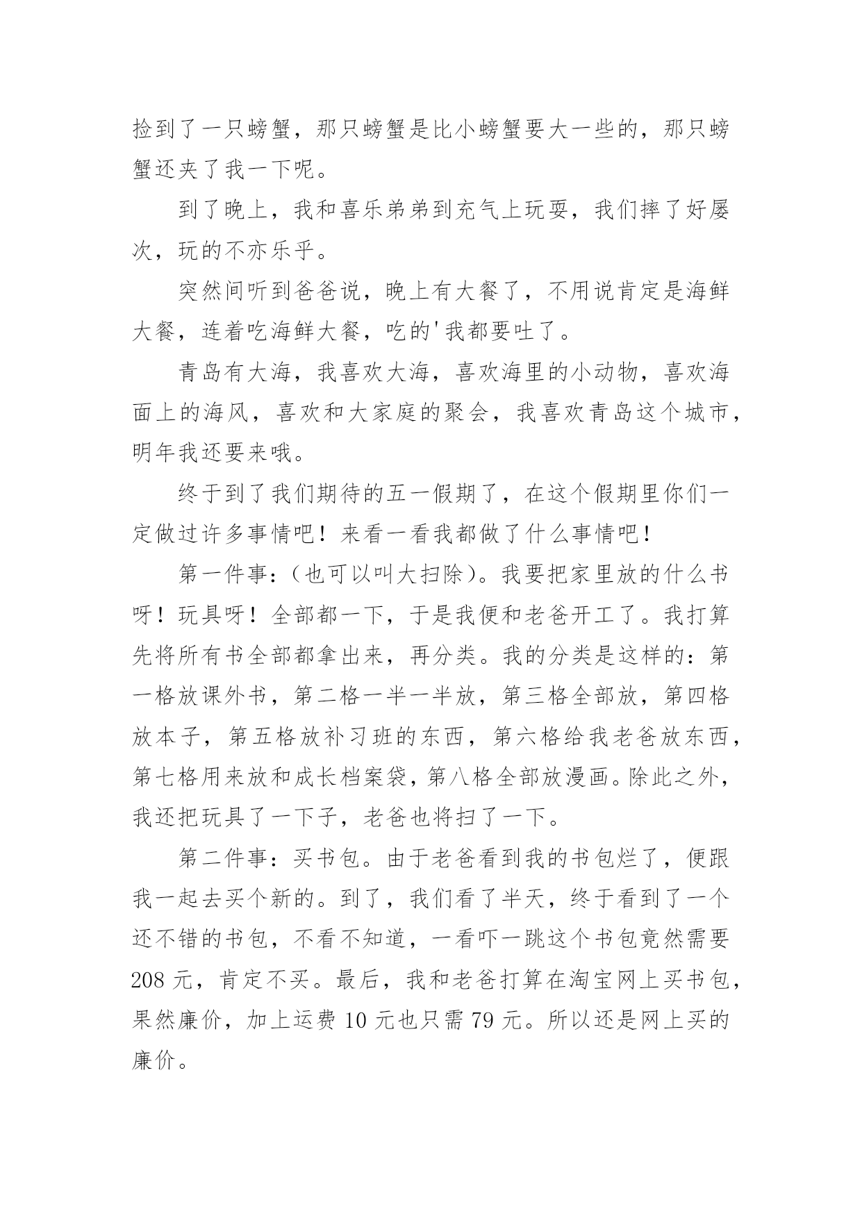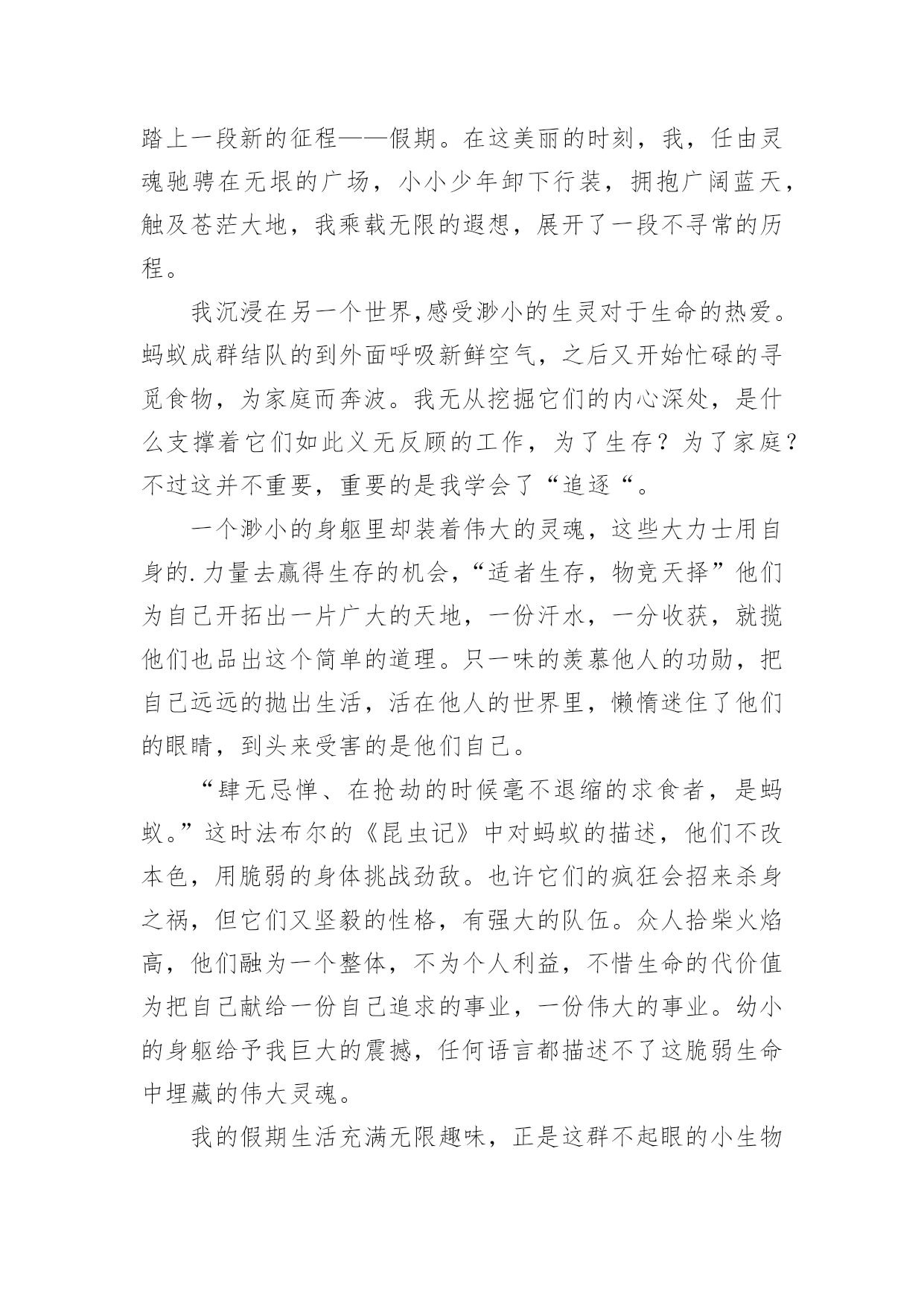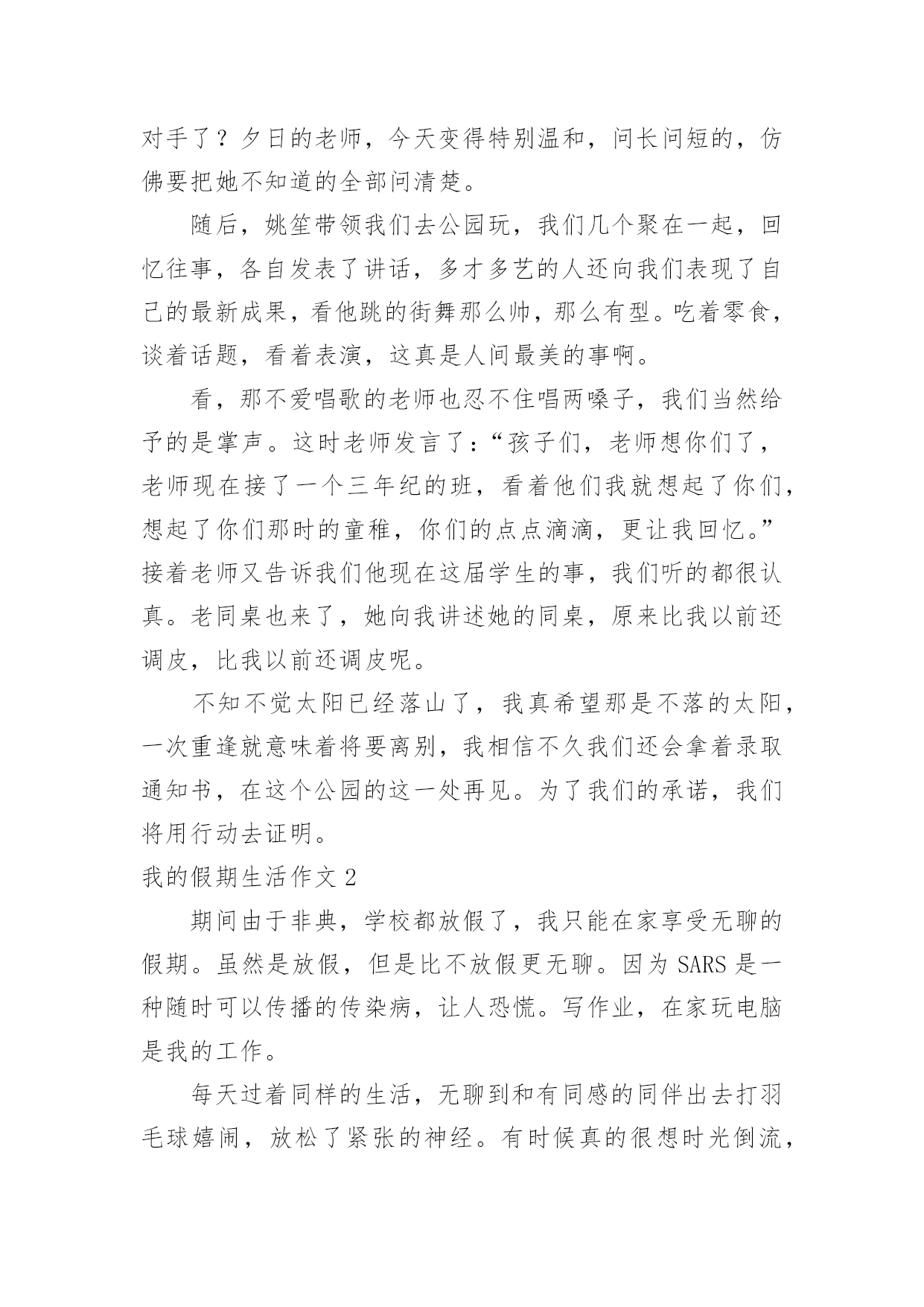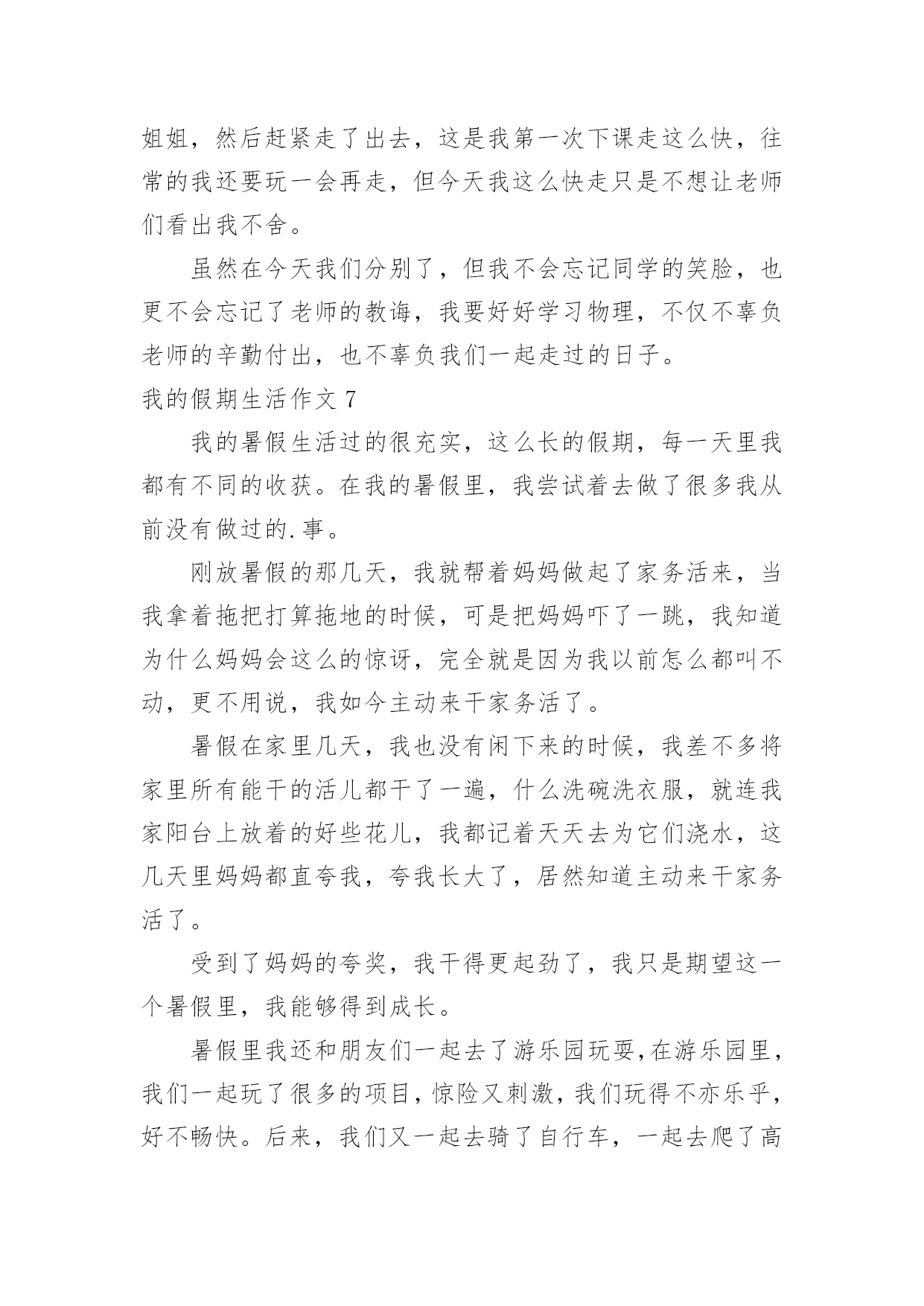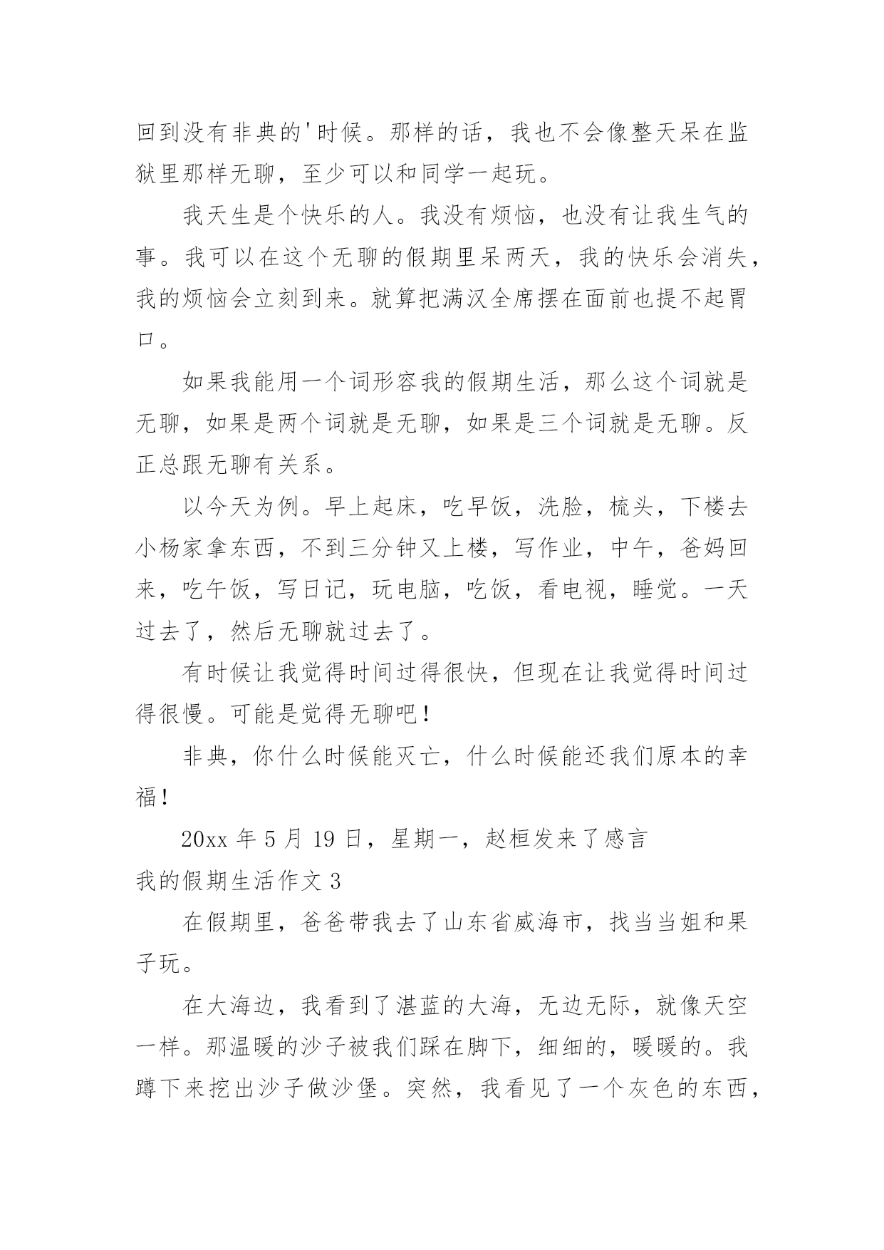 我的假期生活作文我的假期生活作文在平平淡淡的日常中,大家都经常看到作文的身影吧,作文一定要做到主题集中,围绕同一主题作深入阐述,切忌东拉西扯,主题涣散甚至无主题。那么,怎么去写作文呢?下面是小编为大家收集的我的假期生活作文,欢迎阅读与收藏。我的假期生活作文1长假终于到了,同时也意味着快乐即将到来。坐在家中的平台上望着外面。想想自己,默默感受着时间的流逝,转眼间离已与小学同学一年多不见了,回想起在一起的五个春夏秋冬,心中涌起一种思念一种回忆,老同学们现在都怎么样了?这时电话打断了我的思绪,“好久不见”,这不是姚笙的声音吗?“你怎么样了”他故作沉默,随后说道“明天来学校门口,同学聚会,记着要来啊”我当然答应了他的要求。晚上我夜不能寐,想起小学的好哥们,好同桌,以及老师,心中就激动不已,我恨不得这漫长的夜晚快快过去。终于到了早晨,我走在去学校的路上,回忆起离别时的情形,那种破别重逢的'感觉很难用语言形容。到了,我脸上浮现出微笑,这不是阿张吗?我们彼此问了问对方的情况。那时的调皮鬼今日变得如此腼腆,是不是遇到比他还调皮的对手了?夕日的老师,今天变得特别温和,问长问短的,仿佛要把她不知道的全部问清楚。随后,姚笙带领我们去公园玩,我们几个聚在一起,回忆往事,各自发表了讲话,多才多艺的人还向我们表现了自己的最新成果,看他跳的街舞那么帅,那么有型。吃着零食,谈着话题,看着表演,这真是人间最美的事啊。看,那不爱唱歌的老师也忍不住唱两嗓子,我们当然给予的是掌声。这时老师发言了:“孩子们,老师想你们了,老师现在接了一个三年纪的班,看着他们我就想起了你们,想起了你们那时的童稚,你们的点点滴滴,更让我回忆。”接着老师又告诉我们他现在这届学生的事,我们听的都很认真。老同桌也来了,她向我讲述她的同桌,原来比我以前还调皮,比我以前还调皮呢。不知不觉太阳已经落山了,我真希望那是不落的太阳,一次重逢就意味着将要离别,我相信不久我们还会拿着录取通知书,在这个公园的这一处再见。为了我们的承诺,我们将用行动去证明。我的假期生活作文2期间由于非典,学校都放假了,我只能在家享受无聊的假期。虽然是放假,但是比不放假更无聊。因为SARS是一种随时可以传播的传染病,让人恐慌。写作业,在家玩电脑是我的工作。每天过着同样的生活,无聊到和有同感的同伴出去打羽毛球嬉闹,放松了紧张的神经。有时候真的很想时光倒流,回到没有非典的'时候。那样的话,我也不会像整天呆在监狱里那样无聊,至少可以和同学一起玩。我天生是个快乐的人。我没有烦恼,也没有让我生气的事。我可以在这个无聊的假期里呆两天,我的快乐会消失,我的烦恼会立刻到来。就算把满汉全席摆在面前也提不起胃口。如果我能用一个词形容我的假期生活,那么这个词就是无聊,如果是两个词就是无聊,如果是三个词就是无聊。反正总跟无聊有关系。以今天为例。早上起床,吃早饭,洗脸,梳头,下楼去小杨家拿东西,不到三分钟又上楼,写作业,中午,爸妈回来,吃午饭,写日记,玩电脑,吃饭,看电视,睡觉。一天过去了,然后无聊就过去了。有时候让我觉得时间过得很快,但现在让我觉得时间过得很慢。可能是觉得无聊吧!非典,你什么时候能灭亡,什么时候能还我们原本的幸福!20xx年5月19日,星期一,赵桓发来了感言我的假期生活作文3在假期里,爸爸带我去了山东省威海市,找当当姐和果子玩。在大海边,我看到了湛蓝的大海,无边无际,就像天空一样。那温暖的沙子被我们踩在脚下,细细的,暖暖的。我蹲下来挖出沙子做沙堡。突然,我看见了一个灰色的东西,强烈的好奇心让我把它挖了出来。定睛一看,原来是个贝壳!那贝壳上面是灰色,下面却是白色,而且,上面更凸出,看起来就像两个贝壳叠在一起。这个发现让我萌生了一个想法:“要不要和当当姐一起去拾贝壳?”朋友们说:“可以。”于是,我和当当姐便出发了。我发现了一个有很多贝壳的地方,一个、二个、三个多的.数也数不清,不一会儿,许多五颜六色的贝壳就被我们拾到了。这时,我看到远处有一个白色的大贝壳,便想去拾。我跑到它的面前,用食指一碰,坏了!那不是贝壳,是海鸟的一坨粪便!我把这件事哭笑不得地告诉了当当姐,她笑得腰都弯了。这就是我威海假期中快乐的一天。我的假期生活作文4我的假期生活很开心!因为爸爸带我去了青岛,这是每年的家庭聚会,我们会跟很多叔叔阿姨姐姐弟弟一起到青岛过暑假。到的第一天,休息一晚上,我和三个姐姐在刘峰叔叔家开的民宿大厅玩耍;还有小狗嘟嘟和一只大狗,我们一起遛狗、一起喂小狗喝水、一起回家,这时大狗咬了我一下,虽然不疼,但我还是吓得赶快跑向爸爸,爸爸检查后,说:“没咬烂,没事了”,即使是这样,我还是心里挺害怕,以后跟小狗玩,必须得小心了。过了一会,我们一起去海边捡贝壳,我捡到好多好多还捡到了一只螃蟹,那只螃蟹是比小螃蟹要大一些的,那只螃蟹还夹了我一下呢。到了晚上,我和喜