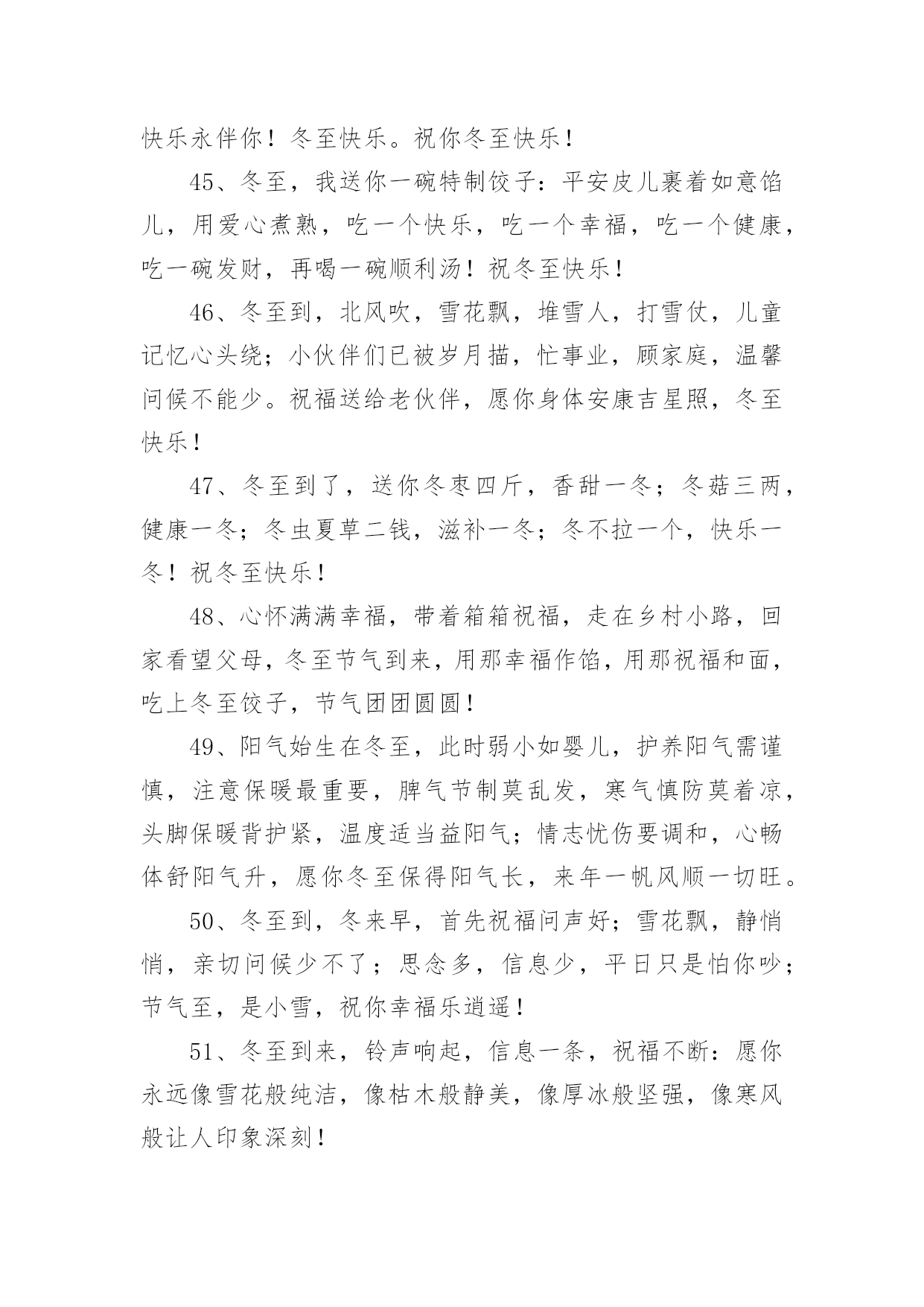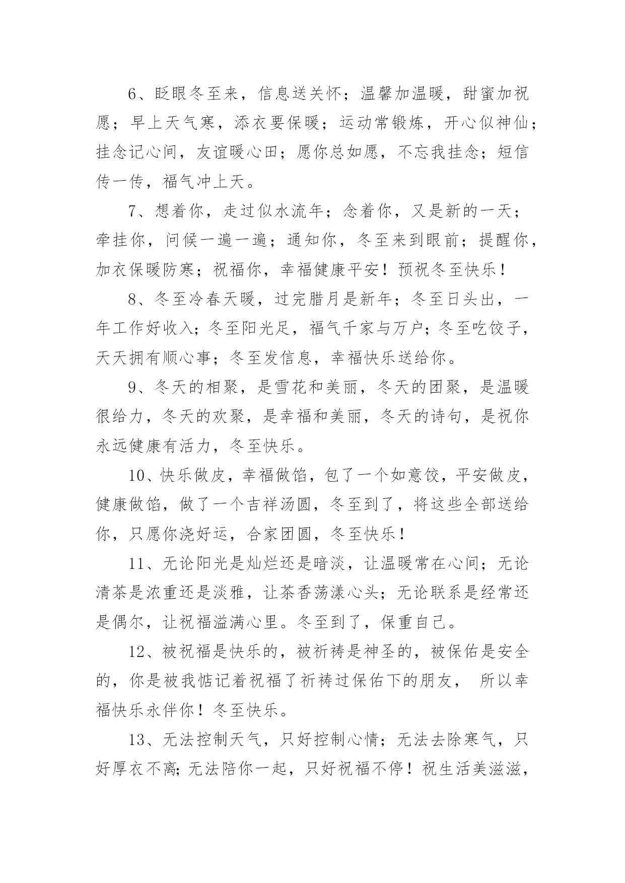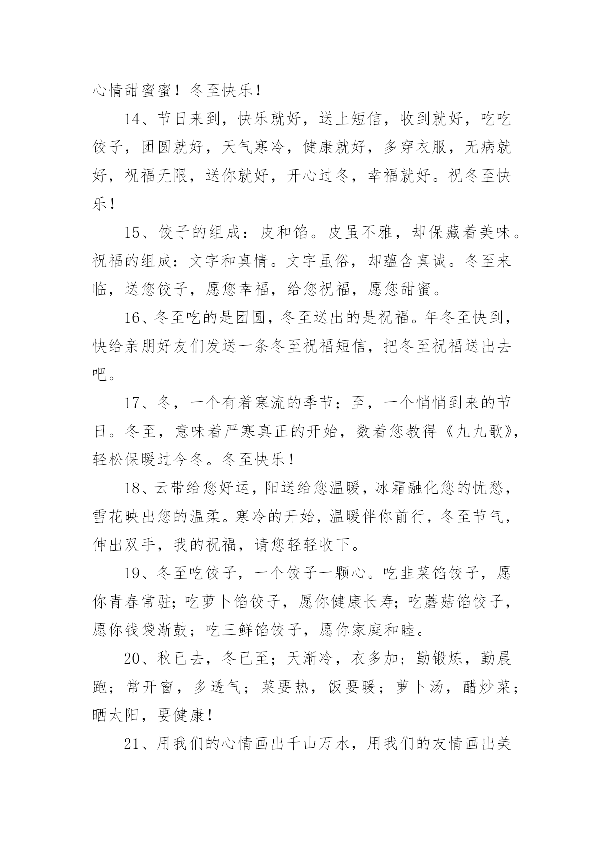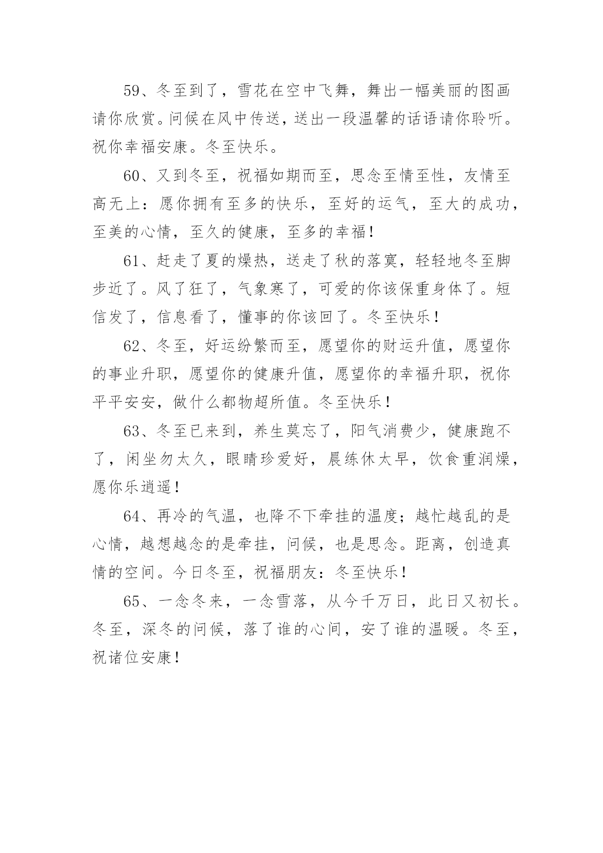 冬至祝福语65条冬至祝福语大合集65条根据中央情报局消息:发现手机12点钟方向有一对呆滞的眼神……嘿!猪头!你被我盯上了!请在这寒冷的日子里,多加件衣服!在此祝福你:冬至快乐!下面是小编为大家整理推荐的冬至祝福语65条,希望能够帮助到大家。1、拧紧时光的发条,释放祝福的信号,放慢匆忙的步调,又是冬至来到,愿你把快乐接收了,把好运全拥抱,心情美丽面带笑,休闲日子更美妙。2、天上雪花飘,冬至已来到,信息送关怀,幸福没有边,悄悄告诉你,早上天气寒,添衣要保暖,运动常锻炼,开心似神仙,挂念记心间,友谊暖心田;愿你总如愿,不忘我挂念;短信传一传,福气冲上天。3、冬至到了天气冷,羊肉饺子保温暖,圆圆满满美丽饺,送君品尝心儿欢。一口一个祝福饺,愿你冬至好运交,一口一个问候饺,愿你身体健又矫。祝朋友冬至快乐!4、吃吃饺子,过好日子,看看短信,找找乐子,保暖锻炼,注意身子,天气寒冷,迈迈步子,饮食均衡,管好肚子,笑口常开,多赚银子,遇事心宽,不出乱子,送上祝福,幸福一辈子。祝冬至快乐!5、风瑟瑟兮雪飘飘,冬至节气已来到,一年之冷具在此,发个信息把你告,寒冻时分记穿袄,单薄身躯受不了,健康从此不飘摇,快乐才能把你绕!祝冬至快乐!6、眨眼冬至来,信息送关怀;温馨加温暖,甜蜜加祝愿;早上天气寒,添衣要保暖;运动常锻炼,开心似神仙;挂念记心间,友谊暖心田;愿你总如愿,不忘我挂念;短信传一传,福气冲上天。7、想着你,走过似水流年;念着你,又是新的一天;牵挂你,问候一遍一遍;通知你,冬至来到眼前;提醒你,加衣保暖防寒;祝福你,幸福健康平安!预祝冬至快乐!8、冬至冷春天暖,过完腊月是新年;冬至日头出,一年工作好收入;冬至阳光足,福气千家与万户;冬至吃饺子,天天拥有顺心事;冬至发信息,幸福快乐送给你。9、冬天的相聚,是雪花和美丽,冬天的团聚,是温暖很给力,冬天的欢聚,是幸福和美丽,冬天的诗句,是祝你永远健康有活力,冬至快乐。10、快乐做皮,幸福做馅,包了一个如意饺,平安做皮,健康做馅,做了一个吉祥汤圆,冬至到了,将这些全部送给你,只愿你浇好运,合家团圆,冬至快乐!11、无论阳光是灿烂还是暗淡,让温暖常在心间;无论清茶是浓重还是淡雅,让茶香荡漾心头;无论联系是经常还是偶尔,让祝福溢满心里。冬至到了,保重自己。12、被祝福是快乐的,被祈祷是神圣的,被保佑是安全的,你是被我惦记着祝福了祈祷过保佑下的朋友,所以幸福快乐永伴你!冬至快乐。13、无法控制天气,只好控制心情;无法去除寒气,只好厚衣不离;无法陪你一起,只好祝福不停!祝生活美滋滋,心情甜蜜蜜!冬至快乐!14、节日来到,快乐就好,送上短信,收到就好,吃吃饺子,团圆就好,天气寒冷,健康就好,多穿衣服,无病就好,祝福无限,送你就好,开心过冬,幸福就好。祝冬至快乐!15、饺子的组成:皮和馅。皮虽不雅,却保藏着美味。祝福的组成:文字和真情。文字虽俗,却蕴含真诚。冬至来临,送您饺子,愿您幸福,给您祝福,愿您甜蜜。16、冬至吃的是团圆,冬至送出的是祝福。年冬至快到,快给亲朋好友们发送一条冬至祝福短信,把冬至祝福送出去吧。17、冬,一个有着寒流的季节;至,一个悄悄到来的节日。冬至,意味着严寒真正的开始,数着您教得《九九歌》,轻松保暖过今冬。冬至快乐!18、云带给您好运,阳送给您温暖,冰霜融化您的忧愁,雪花映出您的温柔。寒冷的开始,温暖伴你前行,冬至节气,伸出双手,我的祝福,请您轻轻收下。19、冬至吃饺子,一个饺子一颗心。吃韭菜馅饺子,愿你青春常驻;吃萝卜馅饺子,愿你健康长寿;吃蘑菇馅饺子,愿你钱袋渐鼓;吃三鲜馅饺子,愿你家庭和睦。20、秋已去,冬已至;天渐冷,衣多加;勤锻炼,勤晨跑;常开窗,多透气;菜要热,饭要暖;萝卜汤,醋炒菜;晒太阳,要健康!21、用我们的心情画出千山万水,用我们的友情画出美丽宫殿,用冬至的雪花点上闪闪光点,用冬至的'气氛写上我们的故事,把这美丽画卷送给你,愿我们的友谊万古长青!22、冬至送你幸福秧,健康好运堆满仓;冬至送你平安浆,快乐如意胜花香;冬至送你祝福长,朋友情意永芬芳;冬至送你短消息,吉祥如意永伴你身旁。冬至快乐!23、天上雪花飘,冬至已来到,信息送关怀,幸福没有边,悄悄告诉你,早上天气寒,添衣要保暖,运动常锻炼,开心似神仙,挂念记心间,友谊暖心田;愿你总如愿,不忘我挂念;短信传一传,福气冲上天。祝你冬至快乐!24、天天忙于工作的你,要记得:添一件衣服,添一份温暖,添一份快乐。冬至祝你:健康平安!25、天气忽然变冷,冬至非雨即风。没事宅于小屋,可以读读闲书。养生之道鉴古,烹调多看菜谱。防风要关窗户,锻炼闻鸡起舞。开门阳光雨露,闭门听雪呼呼。冬至养生,减少出行。安然冬藏,祝您健康!26、冬至短信,收到就行;如果在忙,不回也行;我的祝福,知道就行;每天的你,幸福就行;记得回复,一条就行;冬至祝福看