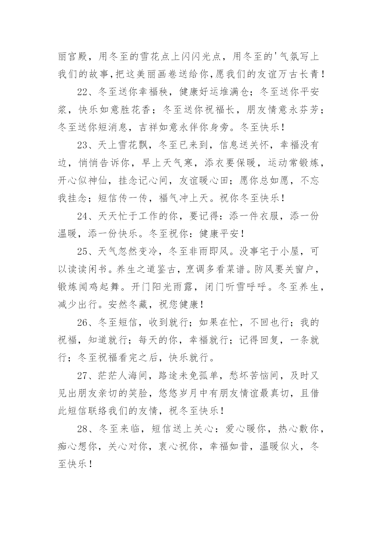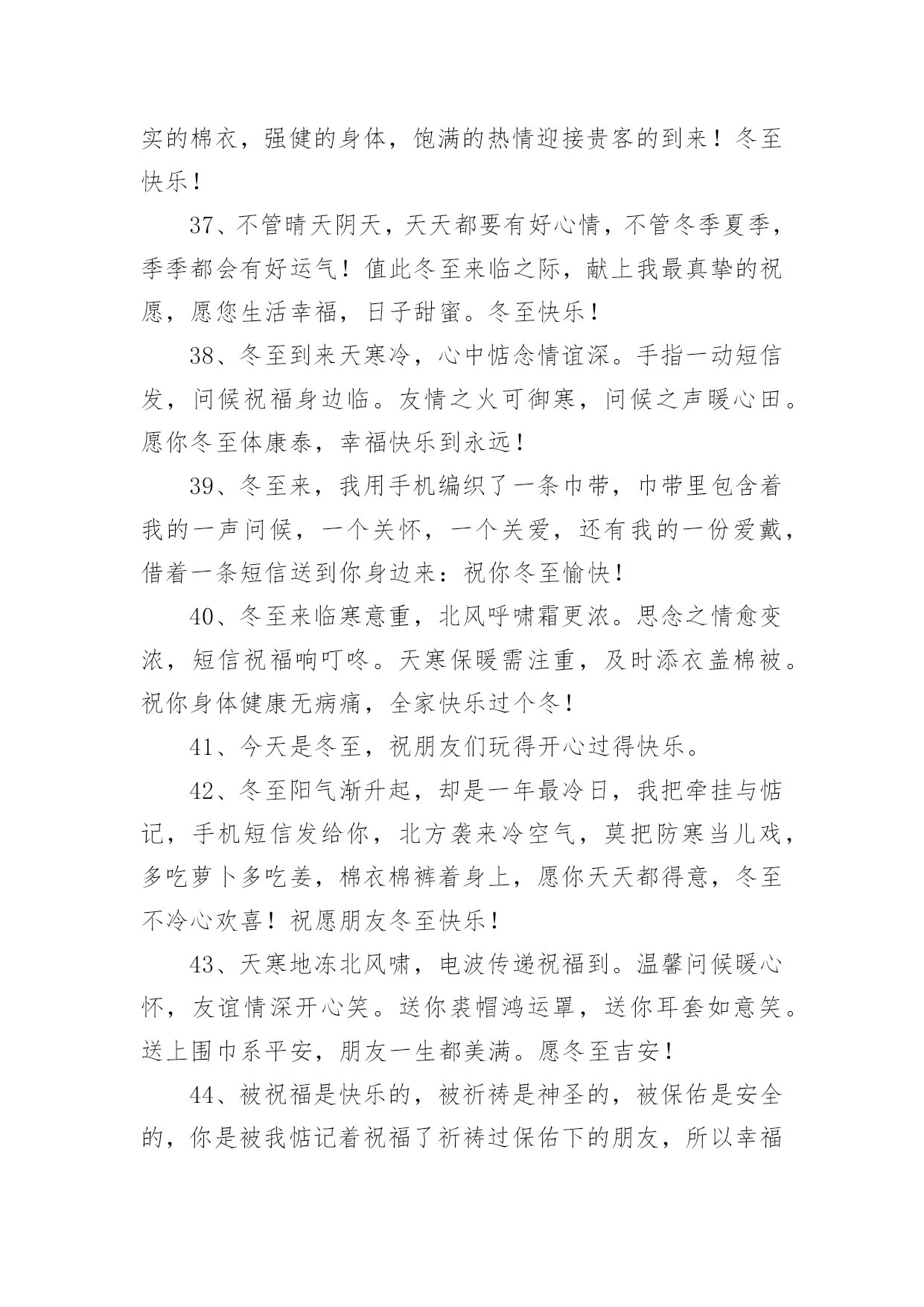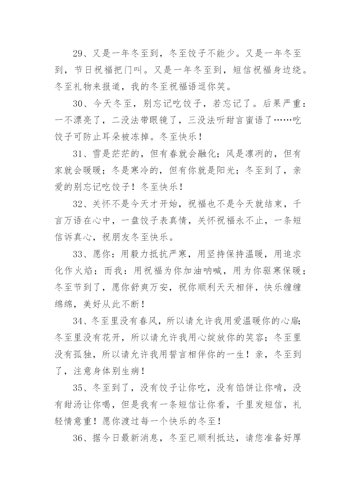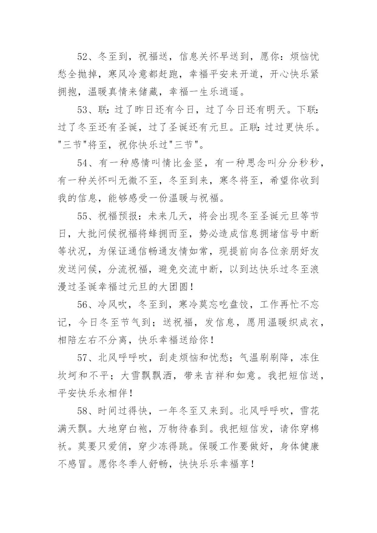 冬至祝福语65条冬至祝福语大合集65条根据中央情报局消息:发现手机12点钟方向有一对呆滞的眼神……嘿!猪头!你被我盯上了!请在这寒冷的日子里,多加件衣服!在此祝福你:冬至快乐!下面是小编为大家整理推荐的冬至祝福语65条,希望能够帮助到大家。1、拧紧时光的发条,释放祝福的信号,放慢匆忙的步调,又是冬至来到,愿你把快乐接收了,把好运全拥抱,心情美丽面带笑,休闲日子更美妙。2、天上雪花飘,冬至已来到,信息送关怀,幸福没有边,悄悄告诉你,早上天气寒,添衣要保暖,运动常锻炼,开心似神仙,挂念记心间,友谊暖心田;愿你总如愿,不忘我挂念;短信传一传,福气冲上天。3、冬至到了天气冷,羊肉饺子保温暖,圆圆满满美丽饺,送君品尝心儿欢。一口一个祝福饺,愿你冬至好运交,一口一个问候饺,愿你身体健又矫。祝朋友冬至快乐!4、吃吃饺子,过好日子,看看短信,找找乐子,保暖锻炼,注意身子,天气寒冷,迈迈步子,饮食均衡,管好肚子,笑口常开,多赚银子,遇事心宽,不出乱子,送上祝福,幸福一辈子。祝冬至快乐!5、风瑟瑟兮雪飘飘,冬至节气已来到,一年之冷具在此,发个信息把你告,寒冻时分记穿袄,单薄身躯受不了,健康从此不飘摇,快乐才能把你绕!祝冬至快乐!6、眨眼冬至来,信息送关怀;温馨加温暖,甜蜜加祝愿;早上天气寒,添衣要保暖;运动常锻炼,开心似神仙;挂念记心间,友谊暖心田;愿你总如愿,不忘我挂念;短信传一传,福气冲上天。7、想着你,走过似水流年;念着你,又是新的一天;牵挂你,问候一遍一遍;通知你,冬至来到眼前;提醒你,加衣保暖防寒;祝福你,幸福健康平安!预祝冬至快乐!8、冬至冷春天暖,过完腊月是新年;冬至日头出,一年工作好收入;冬至阳光足,福气千家与万户;冬至吃饺子,天天拥有顺心事;冬至发信息,幸福快乐送给你。9、冬天的相聚,是雪花和美丽,冬天的团聚,是温暖很给力,冬天的欢聚,是幸福和美丽,冬天的诗句,是祝你永远健康有活力,冬至快乐。10、快乐做皮,幸福做馅,包了一个如意饺,平安做皮,健康做馅,做了一个吉祥汤圆,冬至到了,将这些全部送给你,只愿你浇好运,合家团圆,冬至快乐!11、无论阳光是灿烂还是暗淡,让温暖常在心间;无论清茶是浓重还是淡雅,让茶香荡漾心头;无论联系是经常还是偶尔,让祝福溢满心里。冬至到了,保重自己。12、被祝福是快乐的,被祈祷是神圣的,被保佑是安全的,你是被我惦记着祝福了祈祷过保佑下的朋友,所以幸福快乐永伴你!冬至快乐。13、无法控制天气,只好控制心情;无法去除寒气,只好厚衣不离;无法陪你一起,只好祝福不停!祝生活美滋滋,心情甜蜜蜜!冬至快乐!14、节日来到,快乐就好,送上短信,收到就好,吃吃饺子,团圆就好,天气寒冷,健康就好,多穿衣服,无病就好,祝福无限,送你就好,开心过冬,幸福就好。祝冬至快乐!15、饺子的组成:皮和馅。皮虽不雅,却保藏着美味。祝福的组成:文字和真情。文字虽俗,却蕴含真诚。冬至来临,送您饺子,愿您幸福,给您祝福,愿您甜蜜。16、冬至吃的是团圆,冬至送出的是祝福。年冬至快到,快给亲朋好友们发送一条冬至祝福短信,把冬至祝福送出去吧。17、冬,一个有着寒流的季节;至,一个悄悄到来的节日。冬至,意味着严寒真正的开始,数着您教得《九九歌》,轻松保暖过今冬。冬至快乐!18、云带给您好运,阳送给您温暖,冰霜融化您的忧愁,雪花映出您的温柔。寒冷的开始,温暖伴你前行,冬至节气,伸出双手,我的祝福,请您轻轻收下。19、冬至吃饺子,一个饺子一颗心。吃韭菜馅饺子,愿你青春常驻;吃萝卜馅饺子,愿你健康长寿;吃蘑菇馅饺子,愿你钱袋渐鼓;吃三鲜馅饺子,愿你家庭和睦。20、秋已去,冬已至;天渐冷,衣多加;勤锻炼,勤晨跑;常开窗,多透气;菜要热,饭要暖;萝卜汤,醋炒菜;晒太阳,要健康!21、用我们的心情画出千山万水,用我们的友情画出美丽宫殿,用冬至的雪花点上闪闪光点,用冬至的'气氛写上我们的故事,把这美丽画卷送给你,愿我们的友谊万古长青!22、冬至送你幸福秧,健康好运堆满仓;冬至送你平安浆,快乐如意胜花香;冬至送你祝福长,朋友情意永芬芳;冬至送你短消息,吉祥如意永伴你身旁。冬至快乐!23、天上雪花飘,冬至已来到,信息送关怀,幸福没有边,悄悄告诉你,早上天气寒,添衣要保暖,运动常锻炼,开心似神仙,挂念记心间,友谊暖心田;愿你总如愿,不忘我挂念;短信传一传,福气冲上天。祝你冬至快乐!24、天天忙于工作的你,要记得:添一件衣服,添一份温暖,添一份快乐。冬至祝你:健康平安!25、天气忽然变冷,冬至非雨即风。没事宅于小屋,可以读读闲书。养生之道鉴古,烹调多看菜谱。防风要关窗户,锻炼闻鸡起舞。开门阳光雨露,闭门听雪呼呼。冬至养生,减少出行。安然冬藏,祝您健康!26、冬至短信,收到就行;如果在忙,不回也行;我的祝福,知道就行;每天的你,幸福就行;记得回复,一条就行;冬至祝福看