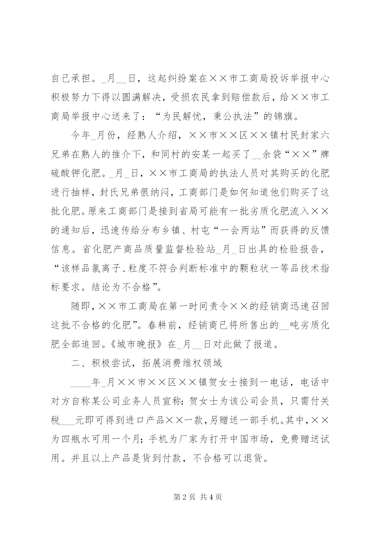 第PAGE\*Arabic\*MERGEFORMAT4页共NUMPAGES\*MERGEFORMAT4页工商局消费维权工作汇报一、关注三农,加大涉农案件的处理力度去年_月,××市××区××镇的__几个村民来到××市工商局投诉举报指挥中心申诉:他们使用了某农资商店的“复合钾钙宝”化肥育苗后,造成菜苗不长和部分死苗,仅他们九户就损失___万棵菜苗,全家人一年的生活将无着落,要求工商部门尽快调查解决。举报指挥中心立即派人兵分两路开展调查,一路前往化肥经销地点调查化肥的来源,一路前往农民的蔬菜大棚查勘受损情况。执法人员详细查阅了这批化肥的进货凭证、进销货台帐及相关证照,并依法对库存化肥进行封存、抽样处理。经过现场查看村民反映情况属实。当天,派人把化肥样品送到省化工产品质量监督站进行检验。_天后,检验报告出来了。结论是:该样品的主要成份含量符合现行国家标准。按常规此案可以就此了结,可村民受到的损失谁来承担呢。工商执法人员多次往返于田间地头和农资商店,经销商忽然想到:是不是他们没按说明使用化肥,因为这种“复合钾钙宝”不同于其它化肥需要用水化开使用,而是施在根部。向农民一了解果然使用方法不当。菜苗受损原因找到了,责任由谁来负。经过耐心细致的调解,农民和经销商承认各自都有过错,最终达成协议:经销商承担菜苗损失的__%,为_户农民赔偿_____元;其余的__%损失由农民自己承担。_月__日,这起纠纷案在××市工商局投诉举报中心积极努力下得以圆满解决,受损农民拿到赔偿款后,给××市工商局举报中心送来了:“为民解忧,秉公执法”的锦旗。今年_月份,经熟人介绍,××市××区××镇村民封家六兄弟在熟人的推介下,和同村的安某一起买了__余袋“××”牌硫酸钾化肥。_月_日,××市工商局的执法人员对其购买的化肥进行抽样,封氏兄弟很纳闷,工商部门是如何知道他们购买了这批化肥。原来工商部门是接到省局可能有一批劣质化肥流入××的通知后,迅速传给分布乡镇、村屯“一会两站”而获得的反馈信息。省化肥产商品质量监督检验站_月_日出具的检验报告,“该样品氯离子、粒度不符合判断标准中的颗粒状一等品技术指标要求。结论为不合格”。随即,××市工商局在第一时间责令××的经销商迅速召回这批不合格的化肥”。春耕前,经销商已将所售出的__吨劣质化肥全部追回。《城市晚报》在_月__日对此做了报道。二、积极尝试,拓展消费维权领域____年_月××市××区××镇贺女士接到一电话,电话中对方自称某公司业务人员宣称:贺女士为该公司会员,只需付关税___元即可得到进口产品××一款,另赠送一部手机。其中,××为四瓶水可用一个月;手机为厂家为打开中国市场,免费赠送试用。并且以上产品是货到付款,不合格可以退货。于女士听到此宣传后,即同意邮购此产品。____年_月_日,贺女士接到××邮政局××分局电话通知后,到邮政局取货。邮政局要求先付款再收货,在付款___元后,贺女士当场打开邮包查验,发现,邮包内仅有市价为_元的一包烟,并没有约定的四瓶药水和手机。所以当即要求退货还款。邮政局以邮包已经打开为由拒绝。贺女士当即拨打××市工商局××分局的江申诉举报电话_____进行申诉。请求帮助维权。××区工商分局申诉举报中心接到投诉后,立即派员赶往现场调查情况。经查贺女士反映情况属实,即与××区邮政局主要负责人联系,要求邮政部门从维护消费者利益出发,帮助消费者维护自已的合法权益,给予办理该邮包的退货手续。经过劝导××区邮政局也认为确实邮包与邮单不符,又有工商执法人员现场见证应该将邮件退回。于是将邮资___元返还消费者贺女士,将该邮包原址退回了发件人,使消费者免受经济损失。此案例是××市工商系统首次接触并成功处理的邮购方面的申诉,对拓展消费维权领域无疑是一次成功的尝试。为工商行政管理机关处理网络、电视、电话购物纠纷积累了宝贵的经验。××市工商局提醒广大消费者在通过网络、电视、电话邮购商品时,一定要在邮政局当场打开查验,发现商品不符合原订购要求时,立即向工商或消协投诉,由消协工作人员到现场作为见证人,现场与邮政部门工作人员等三方共同查验确认后,再进行下一步处理。