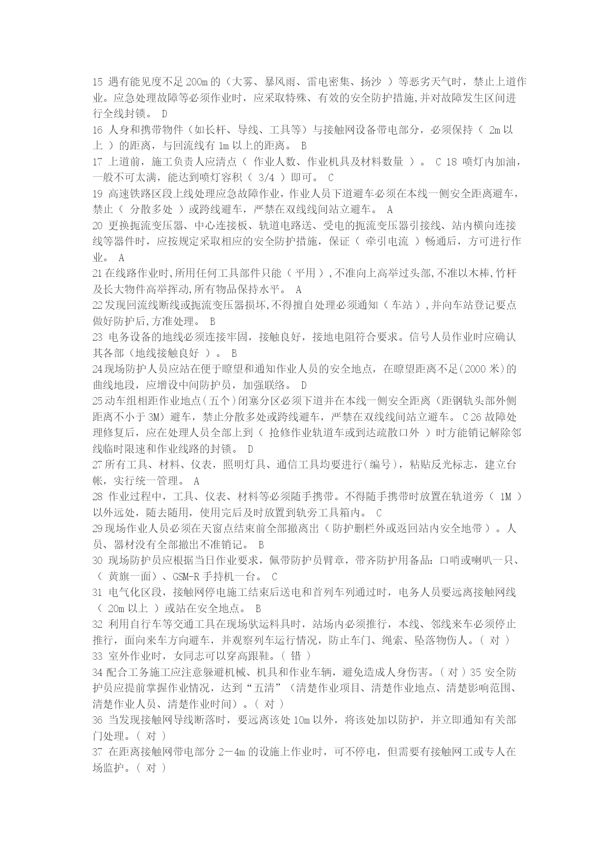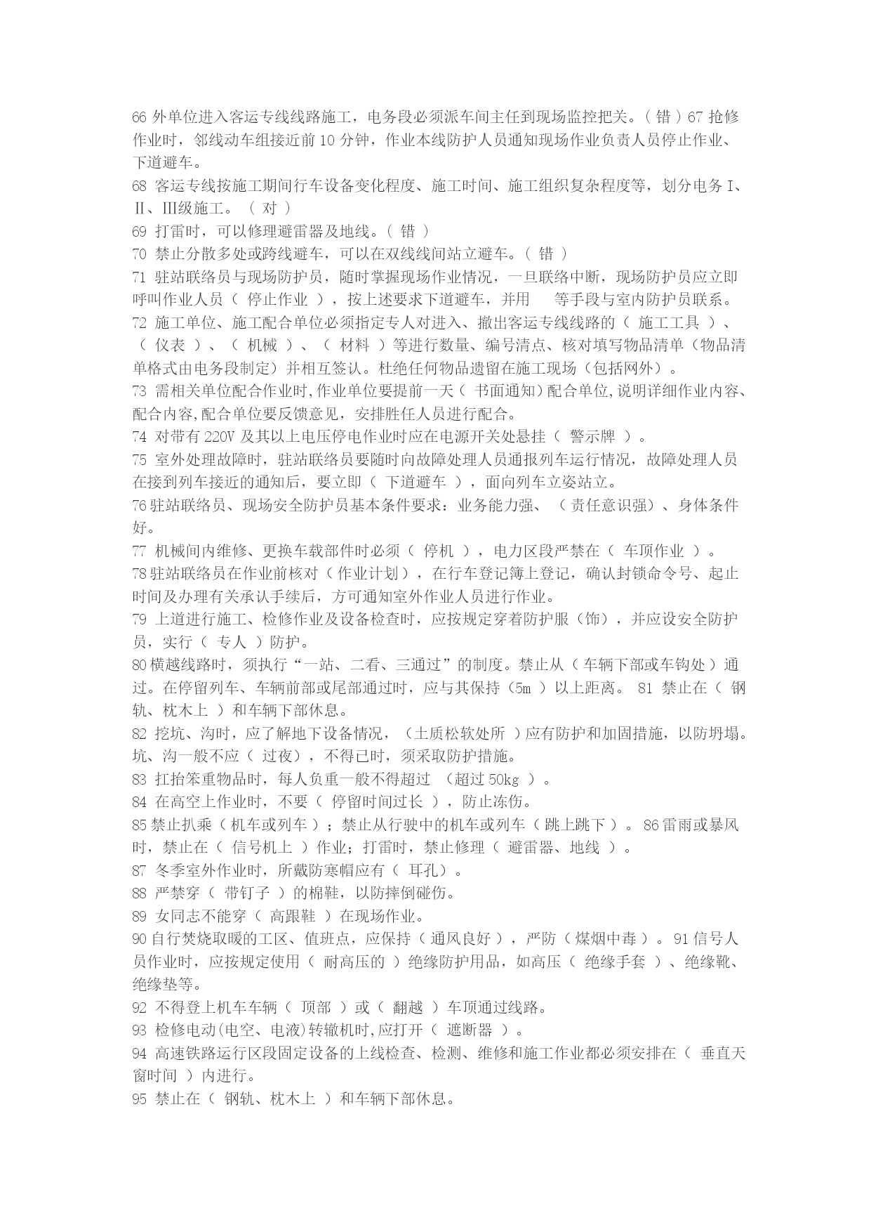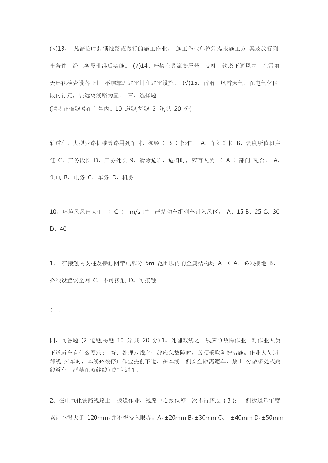 (×)13、凡需临时封锁线路或慢行的施工作业,施工作业单位须提报施工方案及放行列车条件,经工务段批准后实施。(√)14、严禁在吸流变压器、支柱、铁塔下避风雨,在雷雨天巡视检查设备时,不准靠近避雷针和避雷设施。(√)15、雷雨、风雪天气,在电气化区段内行走,要远离线路为宜。三、选择题(请将正确题号在刮号内。10道题,每题2分,共20分)1、在接触网支柱及接触网带电部分5m范围以内的金属结构均(A)。A、必须接地B、必须设置安全网C、不可接触D、可接触2、在电气化铁路线路上,拨道作业,线路中心线位移一次不得超过(B);一侧拨道量年度累计不得大于120mm,并不得侵入限界。A、±20mmB、±30mmC、±40mmD、±50mm3、在电气化铁路线路上,起道高度单股一次不得超过(B),且隧道、桁架桥梁内不得超过限界尺寸线。A、20mmB、30mmC、40mmD、50mm4、拆装回流线须由(A)进行操作。A、供电人员B、线路工C、桥隧工D、电工5、电气化铁路区段,除专业人员按规定作业外,任何人员所携带的物件与接触网设备带电部分均应保持(A)的距离。A、2mB、3mC、4mD、5m6、防护人员要履行好职责,和作业人员保持(C)的距离。A、0-5mB、5-10mC、10-15mD、15-20m7、因自然灾害、行车设备故障等原因,需对设备进行检查时,应本线封锁、邻线限速不超过(C)km/h。A、80B、120C、160D、2108、工务设备检查需开行轨道车(或单机),以及设备故障处理需开行轨道车、大型养路机械等路用列车时,须经(B)批准。A、车站站长B、调度所值班主任C、工务段长D、工务处长9、清除危石、危树时,应有人员(A)部门配合。A、供电B、电务C、车务D、机务10、环境风风速大于(C)m/s时,严禁动车组列车进入风区。A、15B、25C、30D、40四、问答题(2道题,每题10分,共20分)1、处理双线之一线应急故障作业,对作业人员下道避车有什么要求?答:处理双线之一线应急故障时,必须采取防护措施。作业人员遇邻线来车时,本线必须停止作业提前下道、在本线一侧安全距离避车,禁止分散多处或跨线避车,严禁在双线线间站立避车。2、上线处理应急故障时,怎样设置防护、防护员必须携带那些备品?答:上线处理应急故障时,必须确认本线封锁、邻线最高运行速度≤160km/h临时限速的调度命令,要按规定设置防护,设置移动减速信号(防护距离为1400m)、减速地点标和作业标,防护员必须按规定携带灯旗音响信号、GSM-R手持机、对讲电台等防护备品。(√)2、应急处理故障等必须作业时,应采取特殊、有效的安全防护措施,并对故障发生区间进行全线封锁。(×)3、遇有能见度不足300m的大雾、暴风雨(雪)、雷电密集、扬沙等恶劣天气时,禁止上道作业。(×)4、声屏障修补可不纳入天窗的维修作业(×)5、在地面3米以上的高处及陡坡上作业,必须戴好安全帽、系好安全带(绳)、挂牢安全网,不准穿带钉或易溜滑的鞋作业。(×)6、遇设备发生故障进行上线检查抢修等特殊情况,必须得到本线封锁、邻线最高运行速度≤180km/h临时限速的调度命令,按规定设好防护后,方可上道作业。(√)7、班前不得饮酒,休息睡眠充足,上岗精力充沛(√)8、夜间作业必须到车间参加点名同出同归统一乘坐车间汽车到工地。(√)9、施工结束后开通前,施工负责人必须清点人员和机具,确定人员、机具及材料全部撤出防护栅栏以外、作业车辆返回库线,方可通知销点。(×)10安全带、安全绳的使用应每年做一次鉴定。(×)11、本线有两个及以上单位综合利用天窗作业时,可共同设置一个防护。(×)12、线路作业后,登记开通线路只要几何尺寸达到作业验收标准,允许扣件缺少1%。(请将正确答案填在横线空白处。15道题,每题2分,共30分)1、劳动安全管理必须坚持“行车不上道、上道不行车”的安全原则。2、未经专门的劳动安全培训和考试合格的人员,不得进入高速铁路区段作业。3、高速铁路运行区段固定设备的上线检查、检测、维修和施工作业都必须安排在垂直天窗时间内进行。4、下穿铁路桥梁、涵洞且通行机动车辆的道路,当净高小于5.0m时,应设置限高防护架和相应的限高、限行及禁令标志。5、现场施工人员必须听从施工负责人的统一指挥。驻调度所(车站)施工联络员应与施工负责人确保通讯畅通,及时了解施工情况。6、上道前,施工负责人应清点作业人员、作业机具及材料数量。7、高速铁路作业分为施工作业和维修作业。8、水上作业其连续工作时间水温在16℃~25℃不得超过2h。9、声屏障隔音板应牢固,出现裂纹应及时修补或更换。10、上道检查和作业应按规定进行登记和销记。11、有砟轨道区段道砟面积雪厚度5cm以上时,限速160km/h及以下。12、驻调度所(站