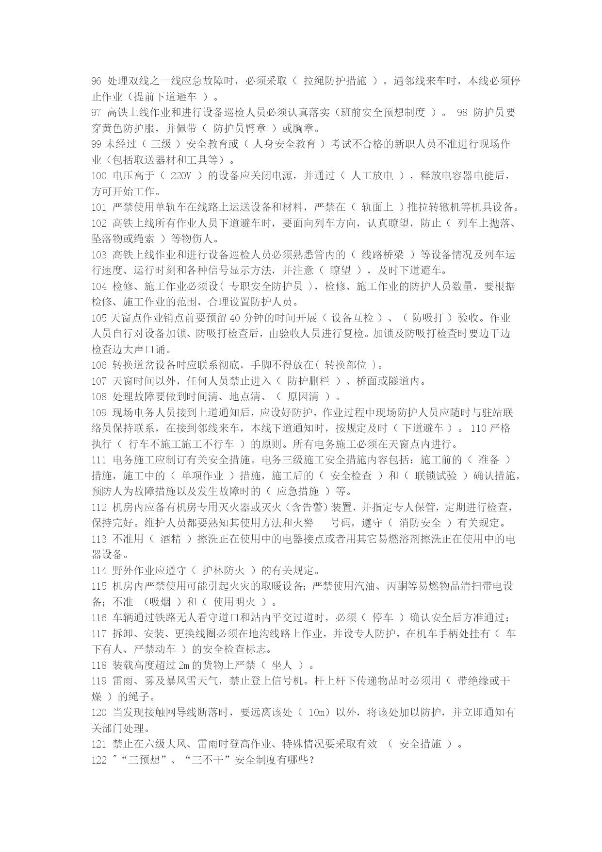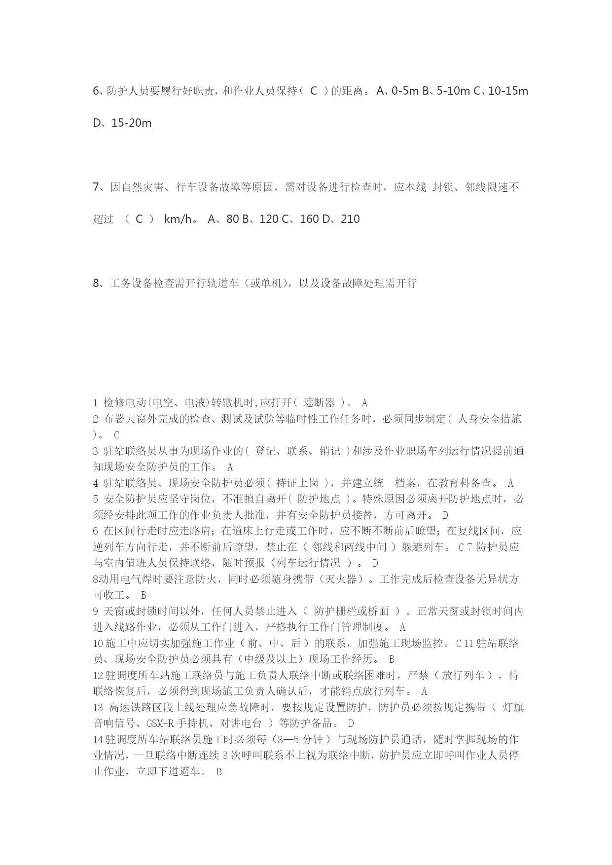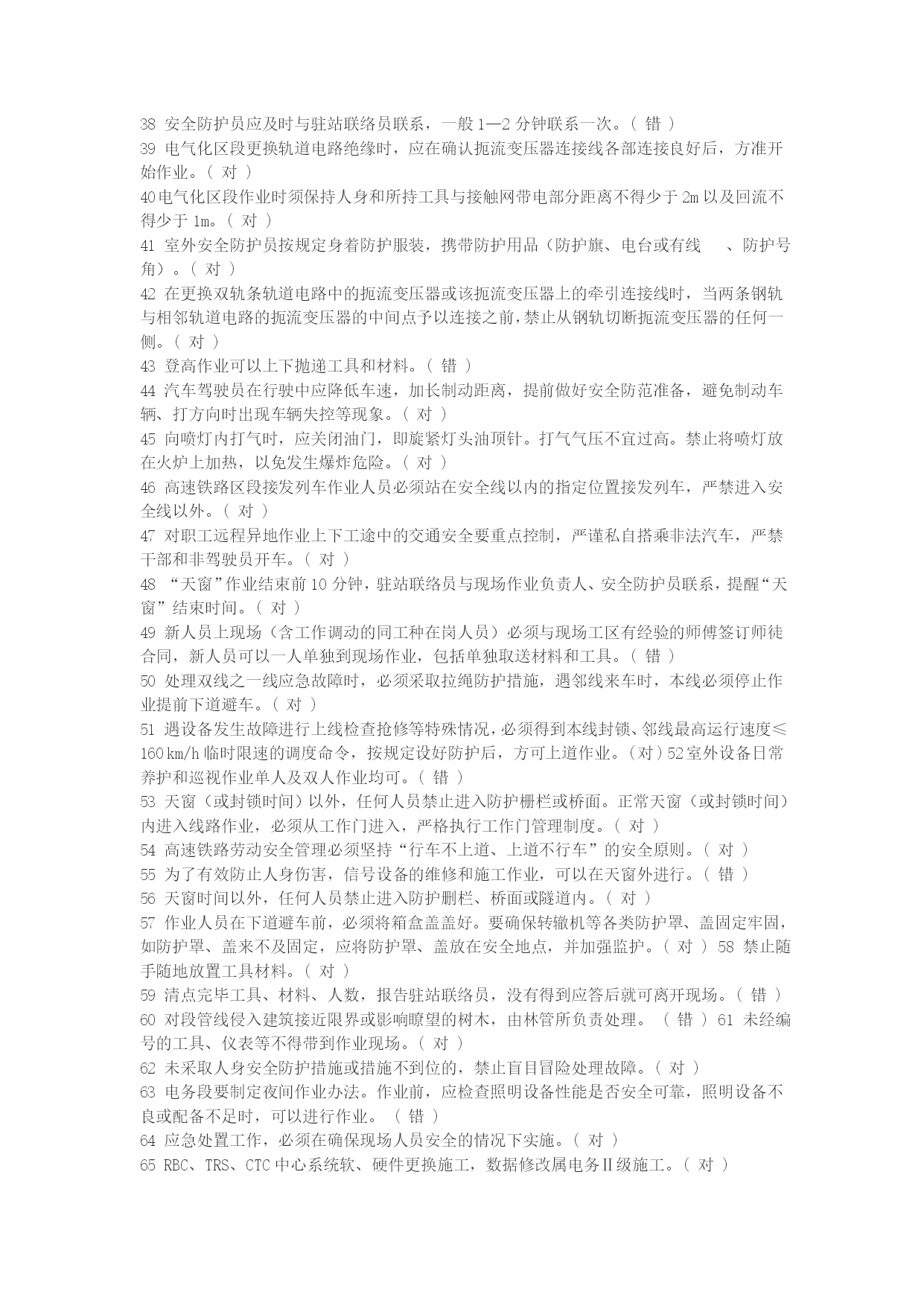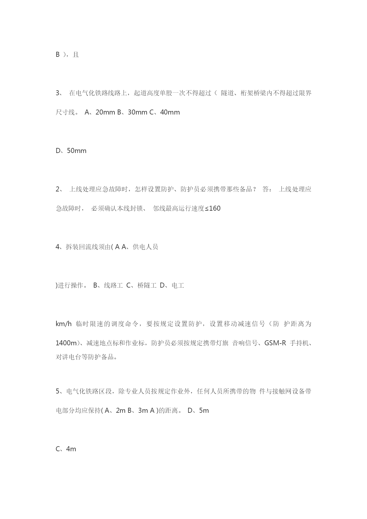 (×)13、凡需临时封锁线路或慢行的施工作业,施工作业单位须提报施工方案及放行列车条件,经工务段批准后实施。(√)14、严禁在吸流变压器、支柱、铁塔下避风雨,在雷雨天巡视检查设备时,不准靠近避雷针和避雷设施。(√)15、雷雨、风雪天气,在电气化区段内行走,要远离线路为宜。三、选择题(请将正确题号在刮号内。10道题,每题2分,共20分)1、在接触网支柱及接触网带电部分5m范围以内的金属结构均(A)。A、必须接地B、必须设置安全网C、不可接触D、可接触2、在电气化铁路线路上,拨道作业,线路中心线位移一次不得超过(B);一侧拨道量年度累计不得大于120mm,并不得侵入限界。A、±20mmB、±30mmC、±40mmD、±50mm3、在电气化铁路线路上,起道高度单股一次不得超过(B),且隧道、桁架桥梁内不得超过限界尺寸线。A、20mmB、30mmC、40mmD、50mm4、拆装回流线须由(A)进行操作。A、供电人员B、线路工C、桥隧工D、电工5、电气化铁路区段,除专业人员按规定作业外,任何人员所携带的物件与接触网设备带电部分均应保持(A)的距离。A、2mB、3mC、4mD、5m6、防护人员要履行好职责,和作业人员保持(C)的距离。A、0-5mB、5-10mC、10-15mD、15-20m7、因自然灾害、行车设备故障等原因,需对设备进行检查时,应本线封锁、邻线限速不超过(C)km/h。A、80B、120C、160D、2108、工务设备检查需开行轨道车(或单机),以及设备故障处理需开行轨道车、大型养路机械等路用列车时,须经(B)批准。A、车站站长B、调度所值班主任C、工务段长D、工务处长9、清除危石、危树时,应有人员(A)部门配合。A、供电B、电务C、车务D、机务10、环境风风速大于(C)m/s时,严禁动车组列车进入风区。A、15B、25C、30D、40四、问答题(2道题,每题10分,共20分)1、处理双线之一线应急故障作业,对作业人员下道避车有什么要求?答:处理双线之一线应急故障时,必须采取防护措施。作业人员遇邻线来车时,本线必须停止作业提前下道、在本线一侧安全距离避车,禁止分散多处或跨线避车,严禁在双线线间站立避车。2、上线处理应急故障时,怎样设置防护、防护员必须携带那些备品?答:上线处理应急故障时,必须确认本线封锁、邻线最高运行速度≤160km/h临时限速的调度命令,要按规定设置防护,设置移动减速信号(防护距离为1400m)、减速地点标和作业标,防护员必须按规定携带灯旗音响信号、GSM-R手持机、对讲电台等防护备品。(√)2、应急处理故障等必须作业时,应采取特殊、有效的安全防护措施,并对故障发生区间进行全线封锁。(×)3、遇有能见度不足300m的大雾、暴风雨(雪)、雷电密集、扬沙等恶劣天气时,禁止上道作业。(×)4、声屏障修补可不纳入天窗的维修作业(×)5、在地面3米以上的高处及陡坡上作业,必须戴好安全帽、系好安全带(绳)、挂牢安全网,不准穿带钉或易溜滑的鞋作业。(×)6、遇设备发生故障进行上线检查抢修等特殊情况,必须得到本线封锁、邻线最高运行速度≤180km/h临时限速的调度命令,按规定设好防护后,方可上道作业。(√)7、班前不得饮酒,休息睡眠充足,上岗精力充沛(√)8、夜间作业必须到车间参加点名同出同归统一乘坐车间汽车到工地。(√)9、施工结束后开通前,施工负责人必须清点人员和机具,确定人员、机具及材料全部撤出防护栅栏以外、作业车辆返回库线,方可通知销点。(×)10安全带、安全绳的使用应每年做一次鉴定。(×)11、本线有两个及以上单位综合利用天窗作业时,可共同设置一个防护。(×)12、线路作业后,登记开通线路只要几何尺寸达到作业验收标准,允许扣件缺少1%。(请将正确答案填在横线空白处。15道题,每题2分,共30分)1、劳动安全管理必须坚持“行车不上道、上道不行车”的安全原则。2、未经专门的劳动安全培训和考试合格的人员,不得进入高速铁路区段作业。3、高速铁路运行区段固定设备的上线检查、检测、维修和施工作业都必须安排在垂直天窗时间内进行。4、下穿铁路桥梁、涵洞且通行机动车辆的道路,当净高小于5.0m时,应设置限高防护架和相应的限高、限行及禁令标志。5、现场施工人员必须听从施工负责人的统一指挥。驻调度所(车站)施工联络员应与施工负责人确保通讯畅通,及时了解施工情况。6、上道前,施工负责人应清点作业人员、作业机具及材料数量。7、高速铁路作业分为施工作业和维修作业。8、水上作业其连续工作时间水温在16℃~25℃不得超过2h。9、声屏障隔音板应牢固,出现裂纹应及时修补或更换。10、上道检查和作业应按规定进行登记和销记。11、有砟轨道区段道砟面积雪厚度5cm以上时,限速160km/h及以下。12、驻调度所(站