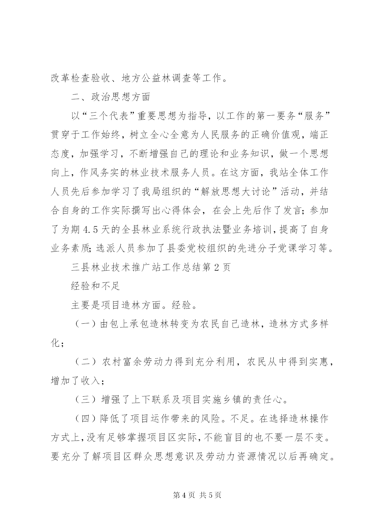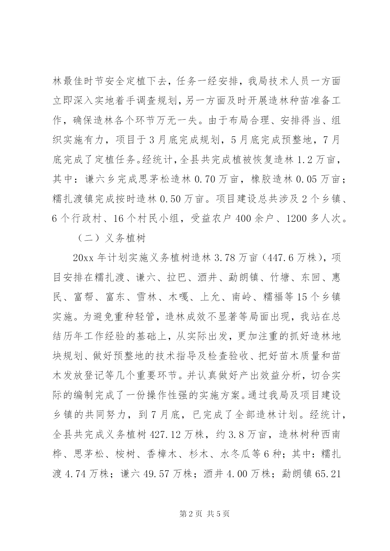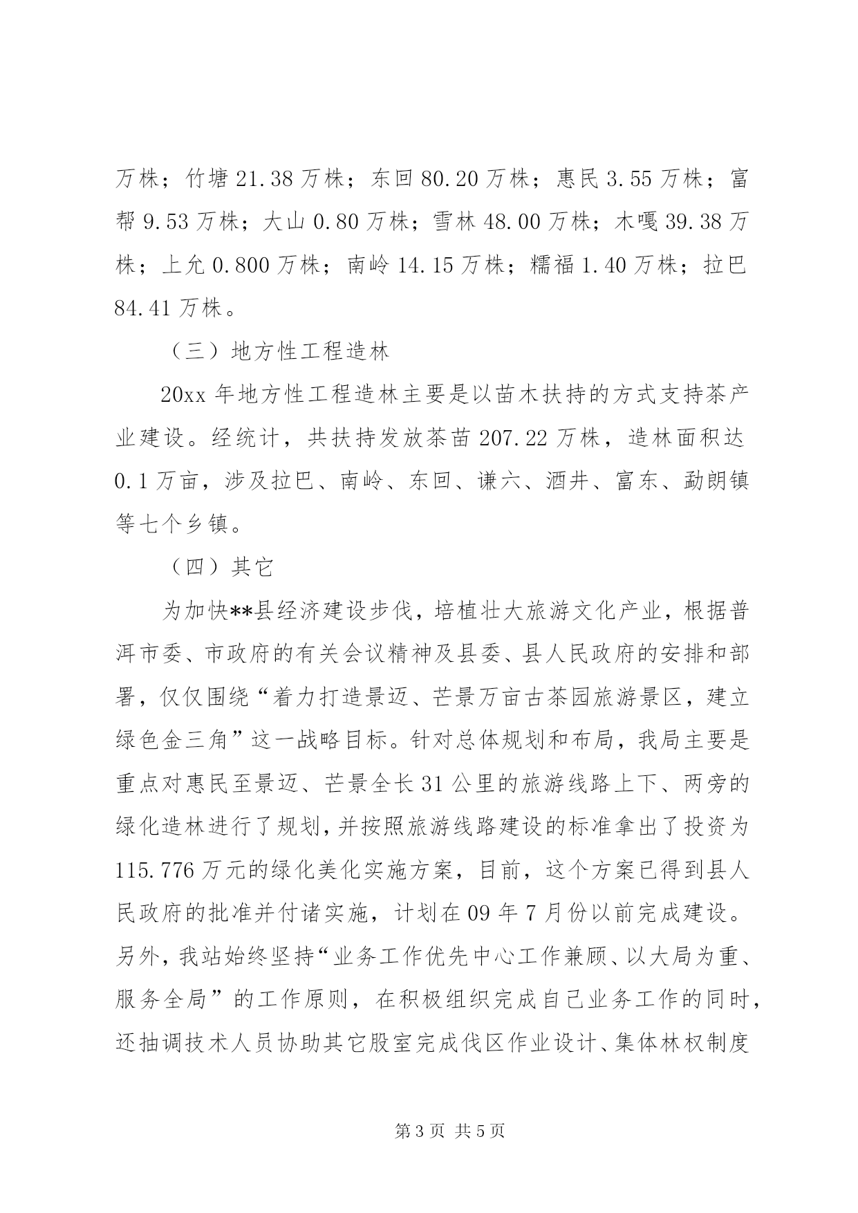 第PAGE\*Arabic\*MERGEFORMAT5页共NUMPAGES\*MERGEFORMAT5页县林业技术推广站工作总结**县林业技术推广站20xx年度工作总结二〇〇八年来,在局领导的关心指导下,在项目实施乡镇的支持配合下,通过我站全体职工的共同努力,顺利完成了年初制定的各项任务,现总结如下:一、业务工作根据年初制定的造林任务。20xx年全县计划投资561.00万元资金,实施各项工程造林4.86万亩。其中义务植树和荒山造林3.78万亩,189.00万元;利用植被恢复造林1.08万亩的,372.00万元。经过我站工作人员的精心布局、规划、组织实施,现已完成义务植树及荒山造林3.8万亩;植被恢复造林1.2万亩;共计5万亩,超额完成了任务,并通过了县内的组织验收;在积极组织造林的同时,还编制完成了惠民至景迈芒景全长31公里、投资115.78万元的公路两旁绿化美化实施方案,并完成了8公里的绿化任务,未完成部分计划在09年实施。(一)植被恢复造林20xx年植被恢复造林项目安排在糯扎渡、谦六两个乡镇实施,根据计划,两个乡镇共需要完成植被恢复造林1.08万亩;其中:谦六乡6500亩。思茅松6000亩,橡胶500亩(橡胶只作种苗补助);糯扎渡镇4300亩,造林树种桉树。由于今年造林任务下得晚,3月份才开始组织实施,为抢抓时间,使苗木能在造林最佳时节安全定植下去,任务一经安排,我局技术人员一方面立即深入实地着手调查规划,另一方面及时开展造林种苗准备工作,确保造林各个环节万无一失。由于布局合理、安排得当、组织实施有力,项目于3月底完成规划,5月底完成预整地,7月底完成了定植任务。经统计,全县共完成植被恢复造林1.2万亩,其中:谦六乡完成思茅松造林0.70万亩,橡胶造林0.05万亩;糯扎渡镇完成按时造林0.50万亩。项目建设总共涉及2个乡镇、6个行政村、16个村民小组,受益农户400余户、1200多人次。(二)义务植树20xx年计划实施义务植树造林3.78万亩(447.6万株),项目安排在糯扎渡、谦六、拉巴、酒井、勐朗镇、竹塘、东回、惠民、富帮、富东、雪林、木嘎、上允、南岭、糯福等15个乡镇实施。为避免重种轻管,造林成效不显著等局面出现,我站在总结历年工作经验的基础上,从实际出发,更加注重的抓好造林地块规划、做好预整地的技术指导及检查验收、把好苗木质量和苗木发放登记等几个重要环节。并认真做好产出效益分析,切合实际的编制完成了一份操作性强的实施方案。通过我局及项目建设乡镇的共同努力,到7月底,已完成了全部造林计划。经统计,全县共完成义务植树427.12万株,约3.8万亩,造林树种西南桦、思茅松、桉树、香樟木、杉木、水冬瓜等6种;其中:糯扎渡4.74万株;谦六49.57万株;酒井4.00万株;勐朗镇65.21万株;竹塘21.38万株;东回80.20万株;惠民3.55万株;富帮9.53万株;大山0.80万株;雪林48.00万株;木嘎39.38万株;上允0.800万株;南岭14.15万株;糯福1.40万株;拉巴84.41万株。(三)地方性工程造林20xx年地方性工程造林主要是以苗木扶持的方式支持茶产业建设。经统计,共扶持发放茶苗207.22万株,造林面积达0.1万亩,涉及拉巴、南岭、东回、谦六、酒井、富东、勐朗镇等七个乡镇。(四)其它为加快**县经济建设步伐,培植壮大旅游文化产业,根据普洱市委、市政府的有关会议精神及县委、县人民政府的安排和部署,仅仅围绕“着力打造景迈、芒景万亩古茶园旅游景区,建立绿色金三角”这一战略目标。针对总体规划和布局,我局主要是重点对惠民至景迈、芒景全长31公里的旅游线路上下、两旁的绿化造林进行了规划,并按照旅游线路建设的标准拿出了投资为115.776万元的绿化美化实施方案,目前,这个方案已得到县人民政府的批准并付诸实施,计划在09年7月份以前完成建设。另外,我站始终坚持“业务工作优先中心工作兼顾、以大局为重、服务全局”的工作原则,在积极组织完成自己业务工作的同时,还抽调技术人员协助其它股室完成伐区作业设计、集体林权制度改革检查验收、地方公益林调查等工作。二、政治思想方面以“三个代表”重要思想为指导,以工作的第一要务“服务”贯穿于工作始终,树立全心全意为人民服务的正确价值观,端正态度,加强学习,不断增强自己的理论和业务知识,做一个思想向上,作风务实的林业技术服务人员。在这方面,我站全体工作人员先后参加学习了我局组织的“解放思想大讨论”活动,并结合自身的工作实际撰写出心得体会,在会上先后作了发言;参加了为期4.5天的全县林业系统行政执法暨业务培训,提高了自身业务素质;选派人员参加了县委党校组织的先进分子党课学习等。三县林业技术推广站工作总结经验和不足主要是项目造林方面。经验。(一)由包上承包造林转变为